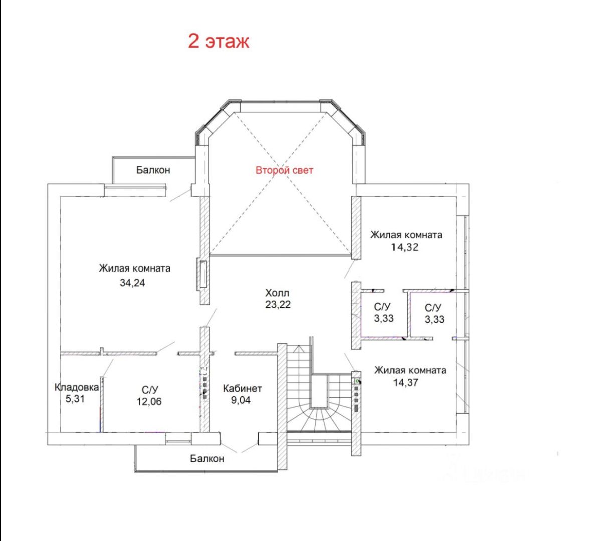 Второй этаж: холл, спальня/кабинет с балконом, мастер спальня с балконом и санузлом, 2 спальни с санузлами.