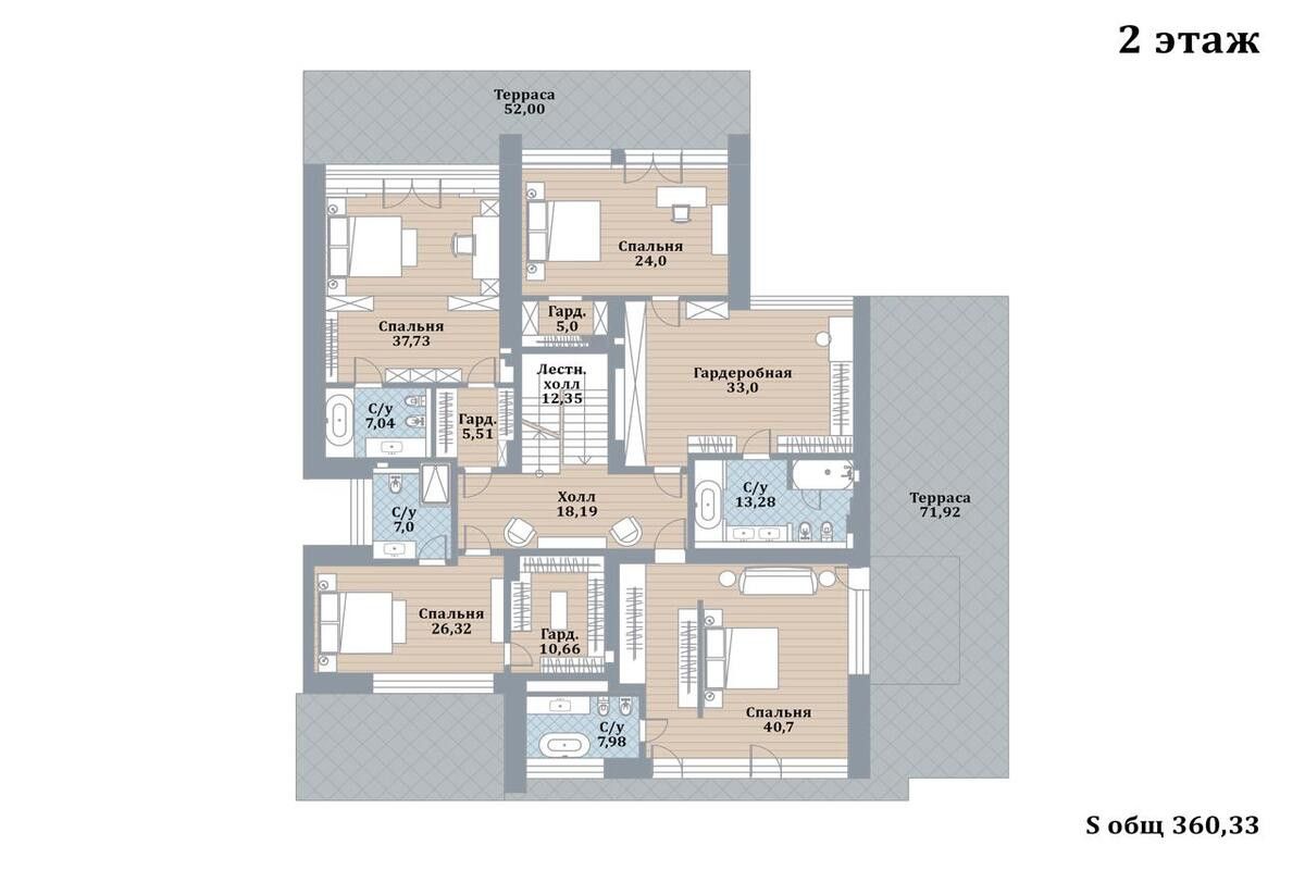 Второй этаж: холл, три местер-спальни с гардеробными и санузлами с ванными, спальня с санузлом и ванной