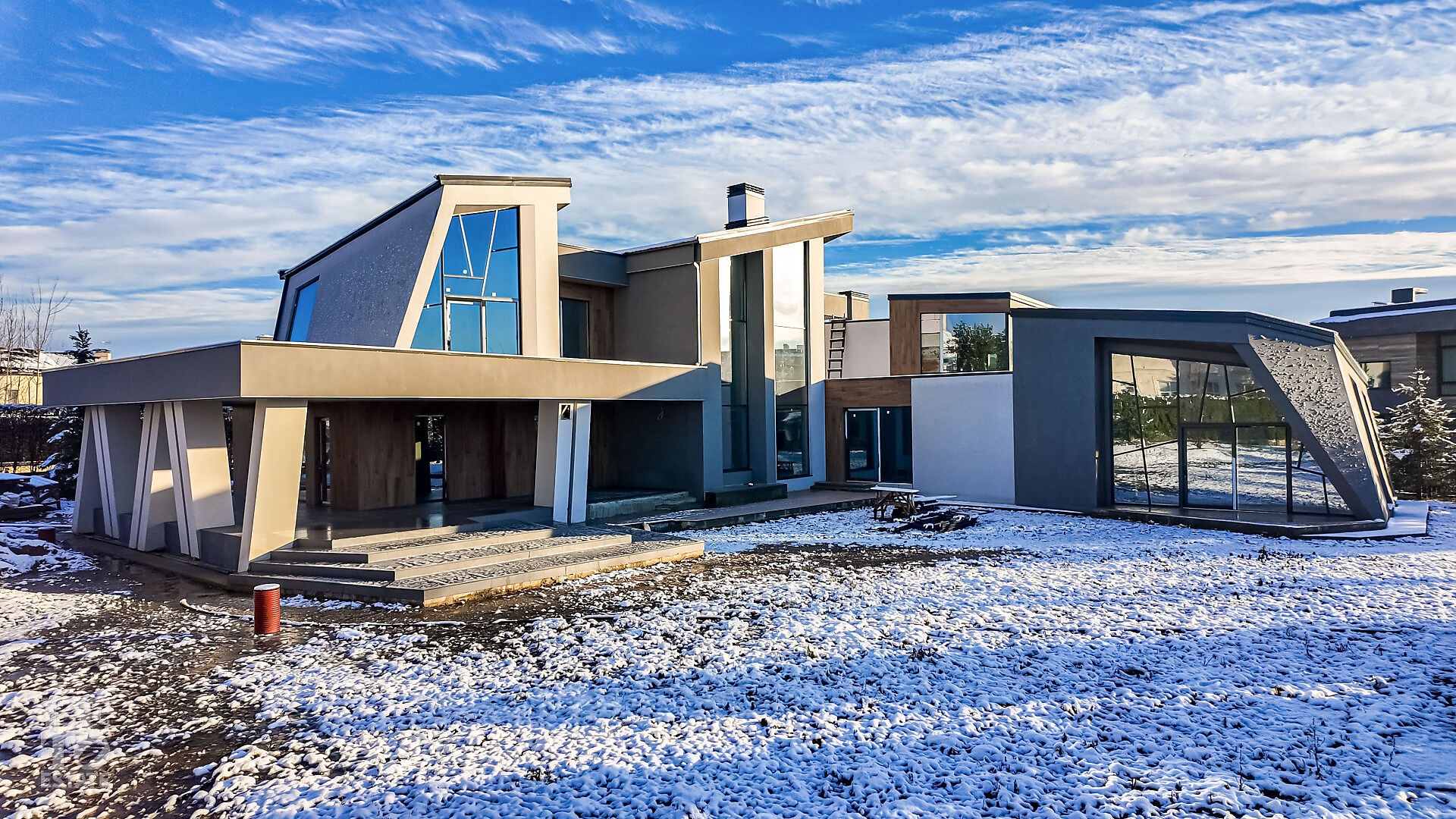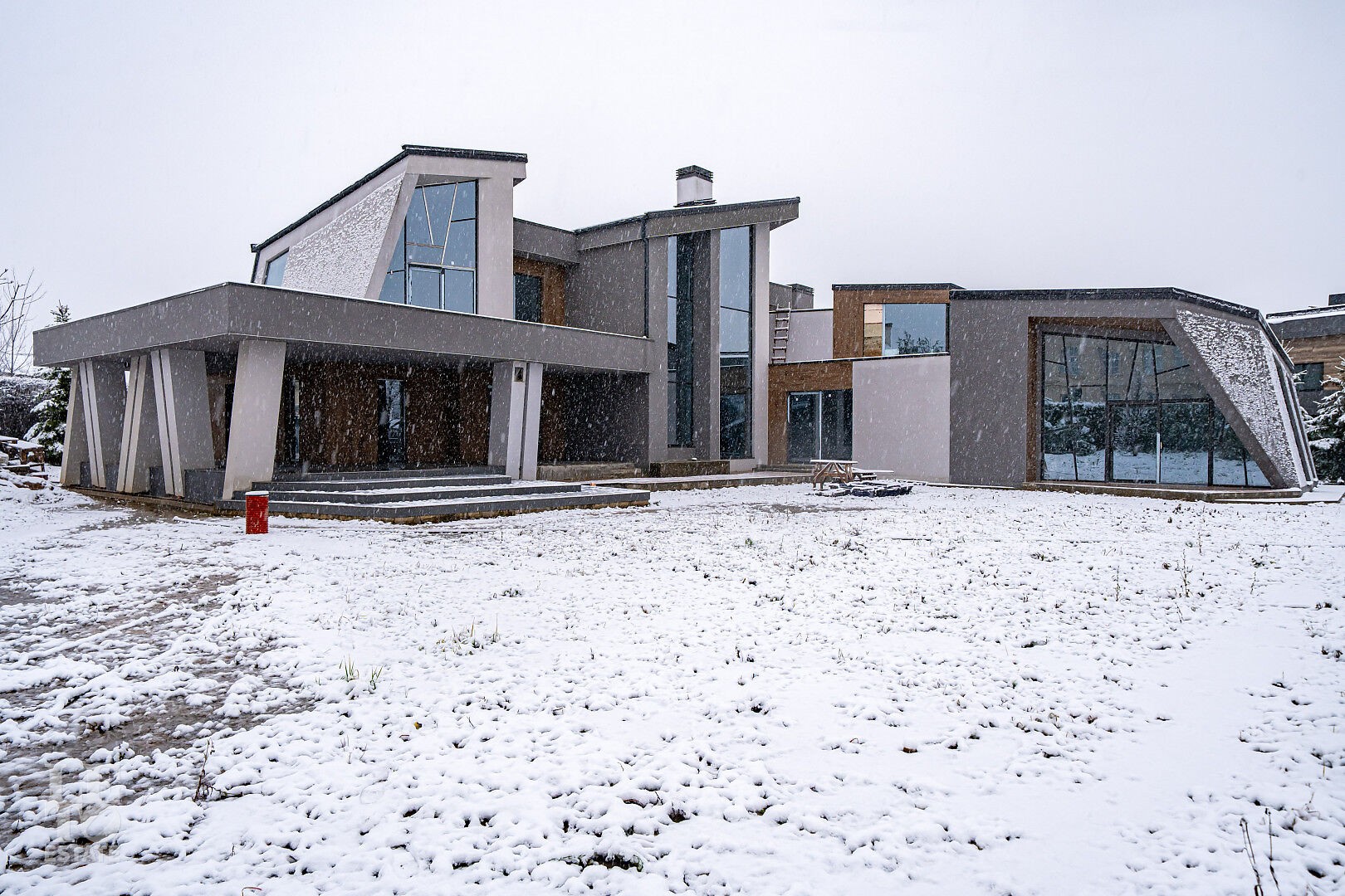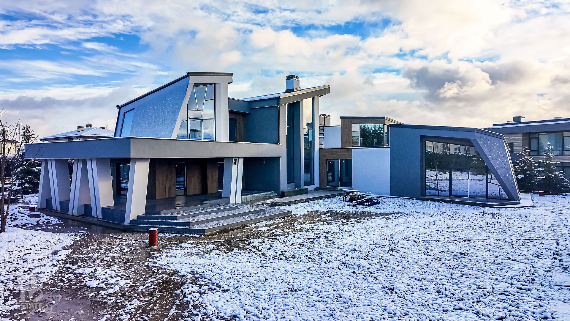 Архитектура выполнена в современном стиле с выразительными ломанными линиями, масштабными окнами в полный рост и высокими стеновыми плоскостями, подчеркивающими динамику объёмов. Панорамное остекление и второй свет формируют редкий по масштабу эффект глубины и воздуха.
