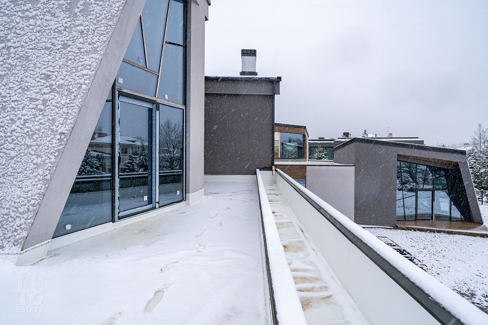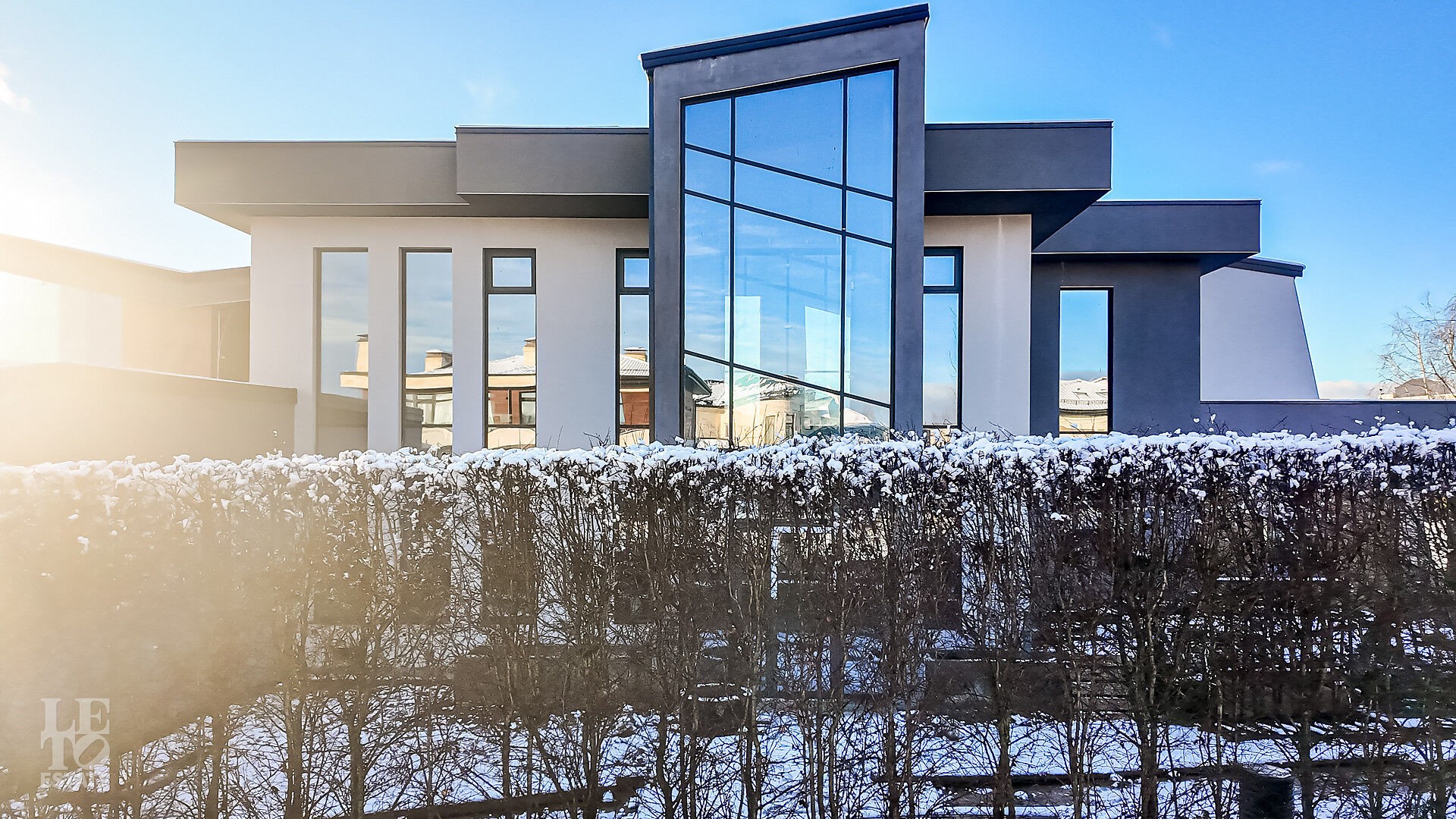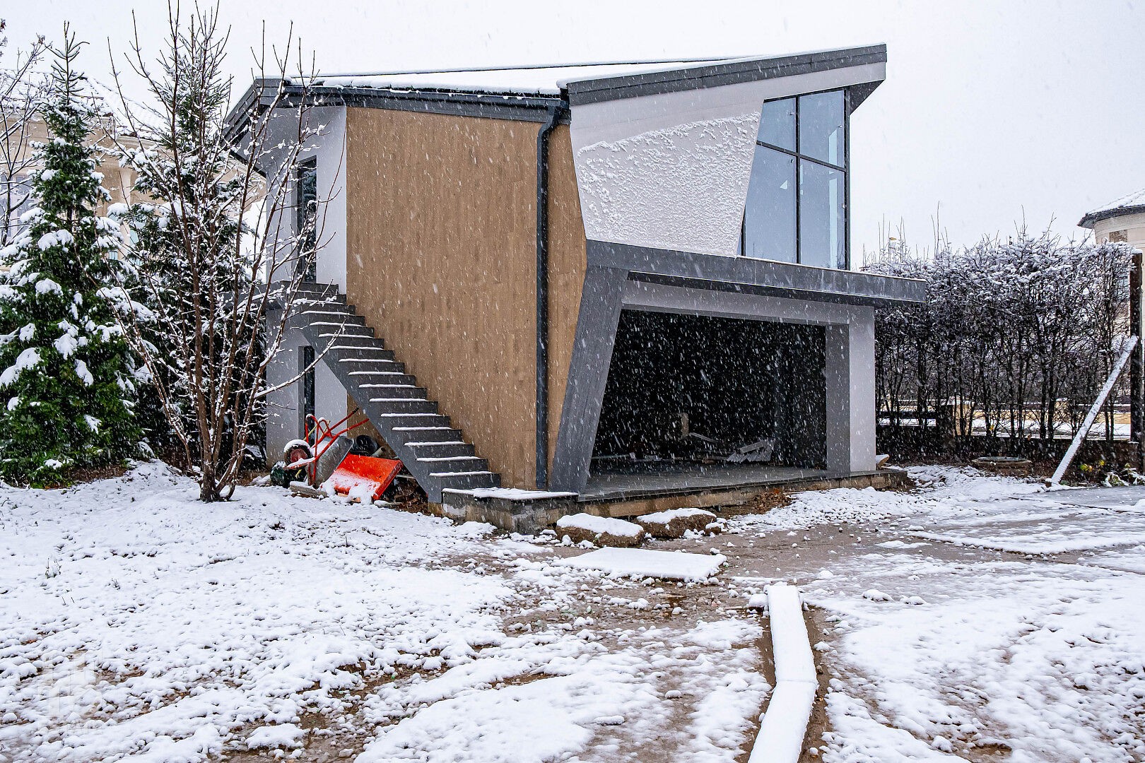 Архитектура выполнена в современном стиле с выразительными ломанными линиями, масштабными окнами в полный рост и высокими стеновыми плоскостями, подчеркивающими динамику объёмов. Панорамное остекление и второй свет формируют редкий по масштабу эффект глубины и воздуха.
