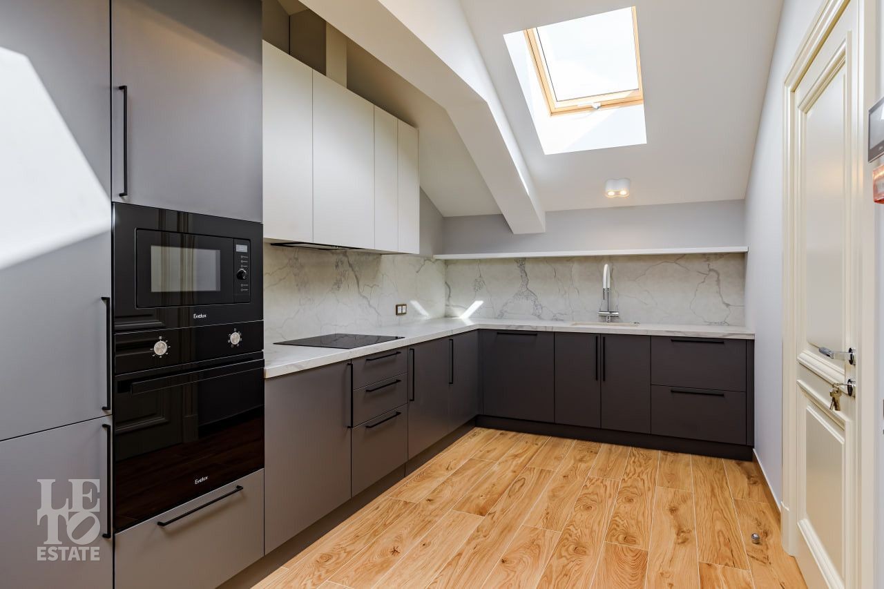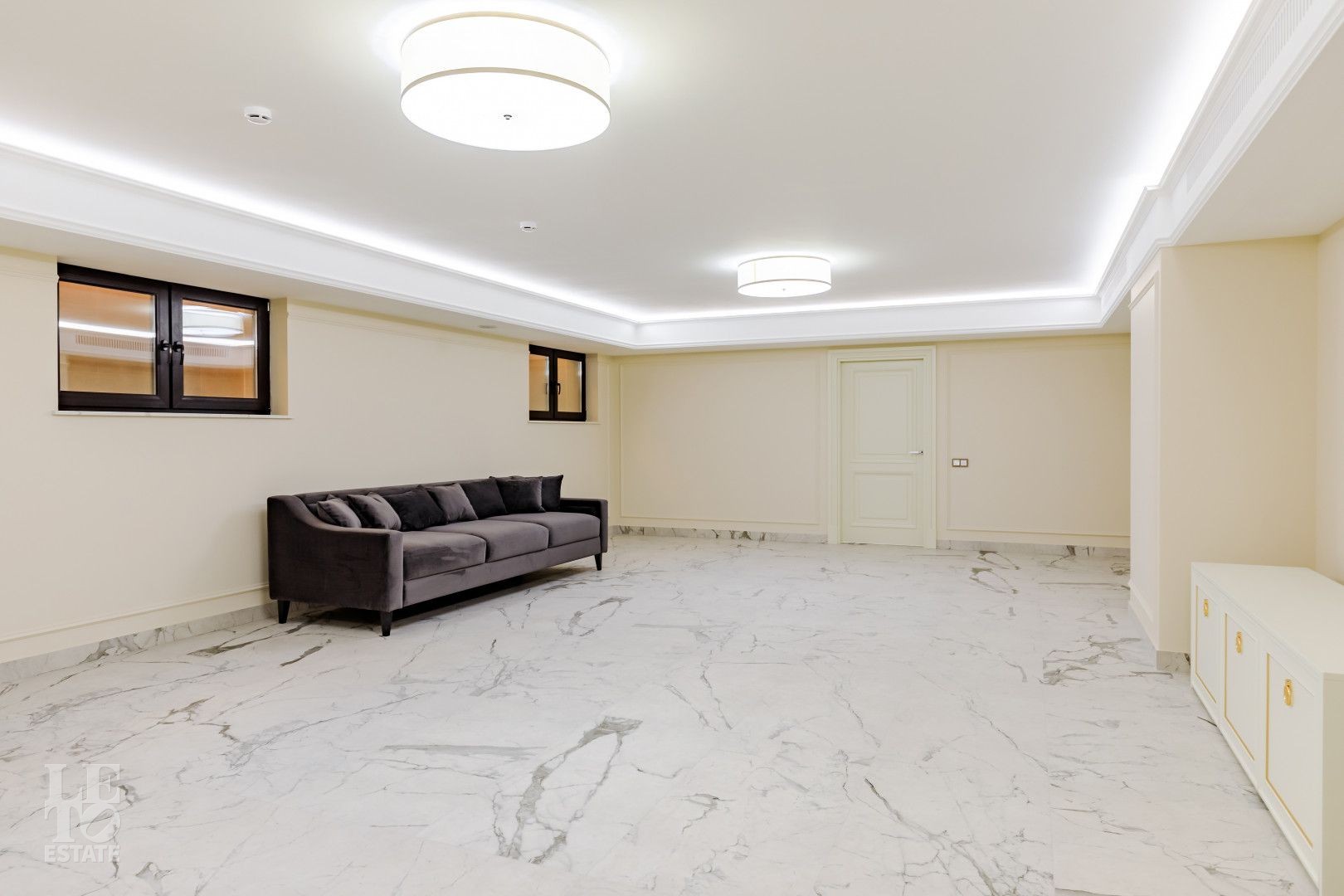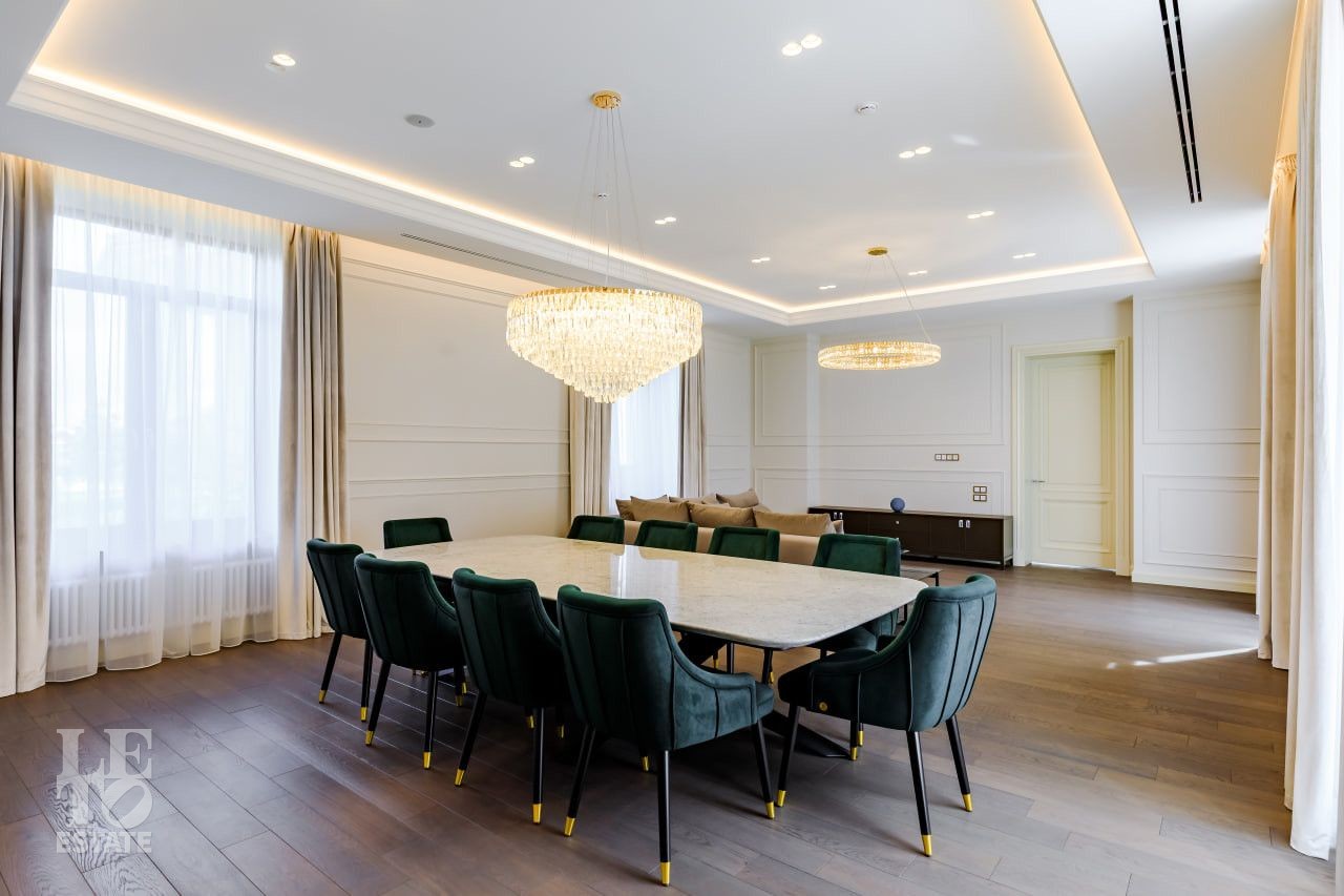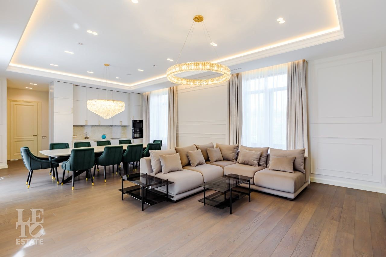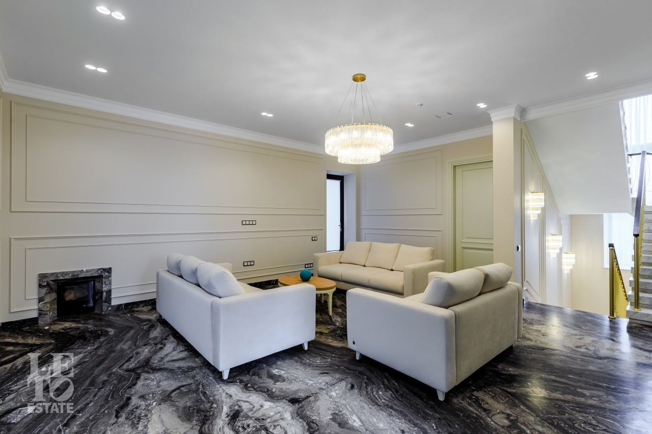 В отделке использовались самые высококачественные премиальные материалы: итальянский мрамор: Arabescato, Карарра и турецкий мрамор: Tundra Grey, Montana Beige, Daino Reale. Особенностью интерьера являются дубовые полы и кессонные потолки в гостиной. Высококлассная мягкая мебель выполнена на заказ компанией Gordon Group mebel, современная бытовая техника и сантехническое оборудование от лучших мировых производителей.