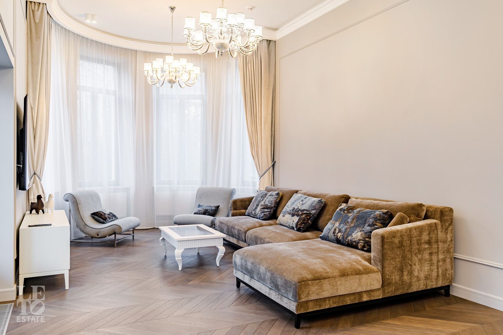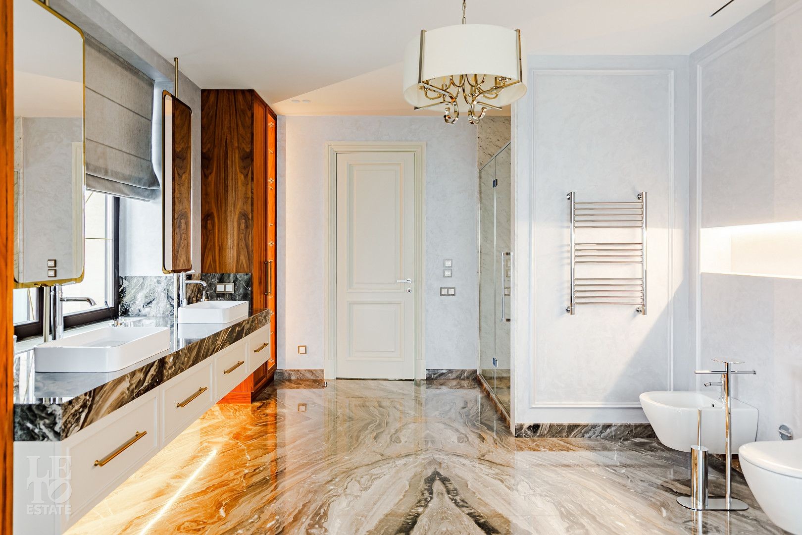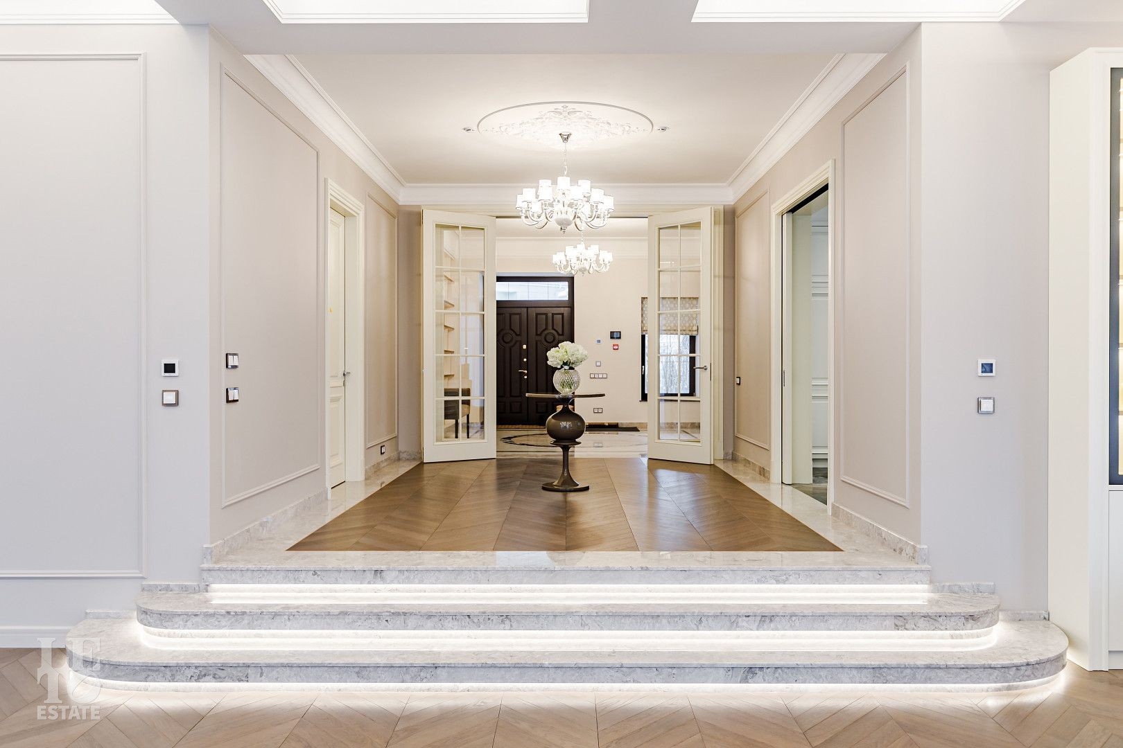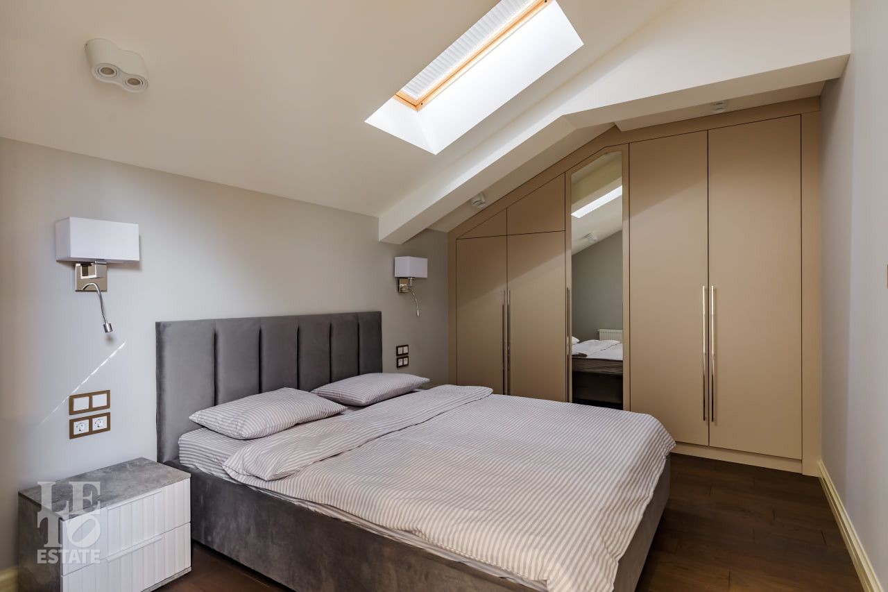 В отделке использовались самые высококачественные премиальные материалы: итальянский мрамор: Arabescato, Карарра и турецкий мрамор: Tundra Grey, Montana Beige, Daino Reale. Особенностью интерьера являются дубовые полы и кессонные потолки в гостиной. Высококлассная мягкая мебель выполнена на заказ компанией Gordon Group mebel, современная бытовая техника и сантехническое оборудование от лучших мировых производителей.
