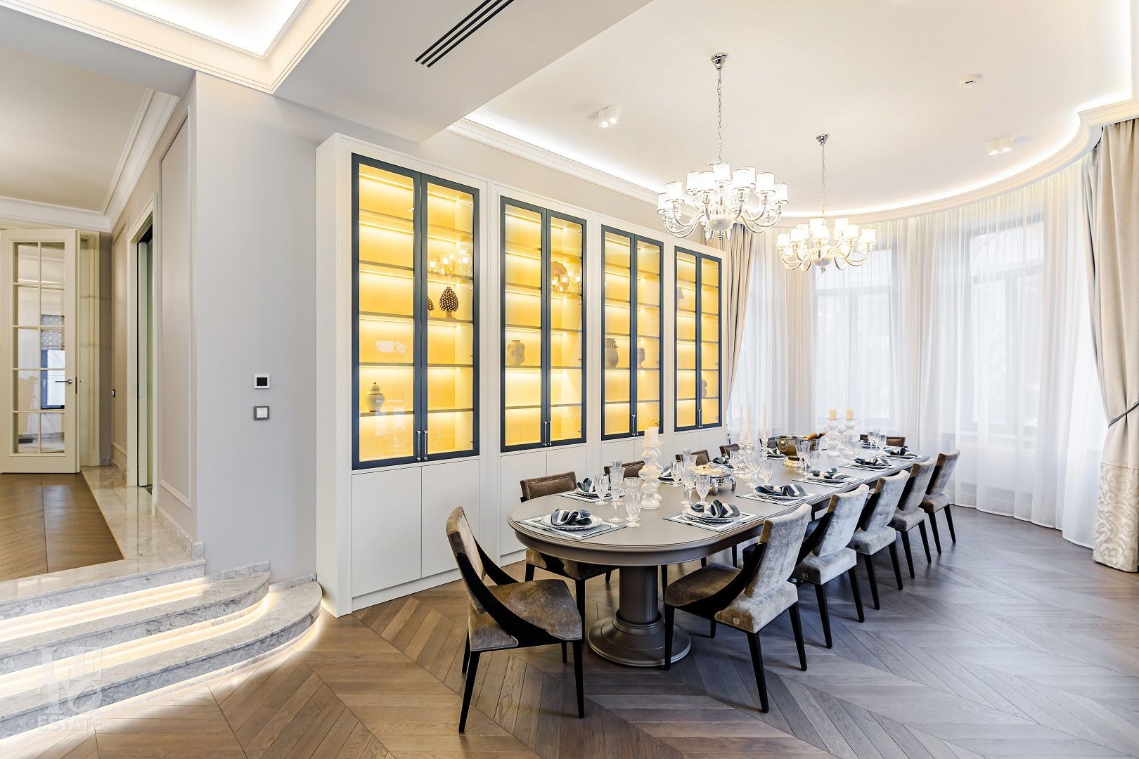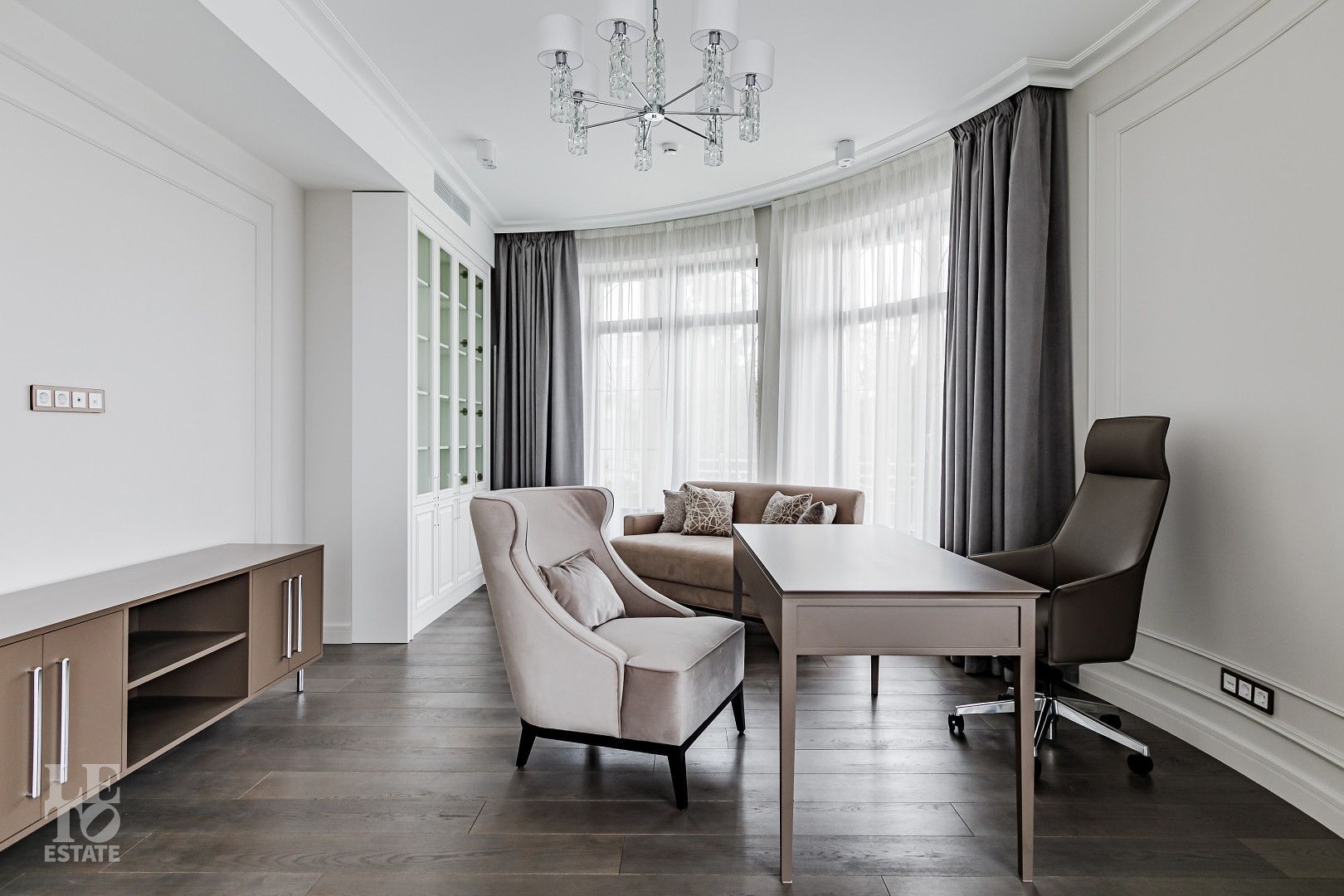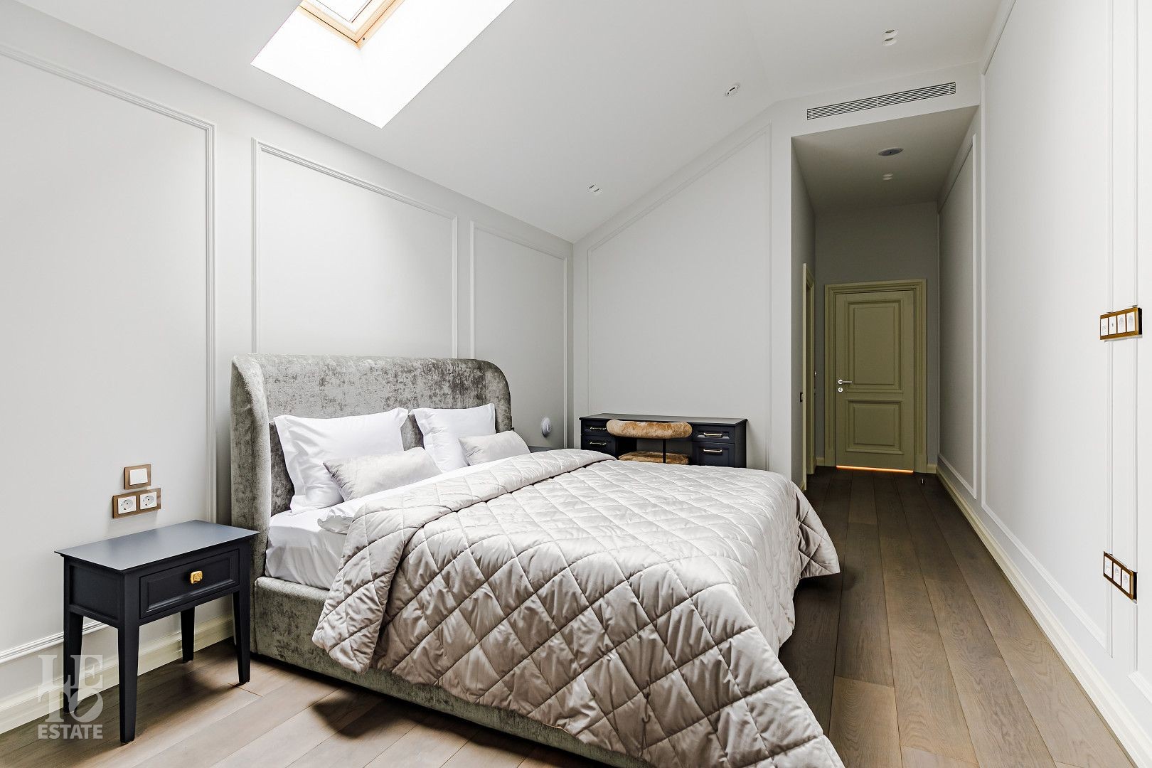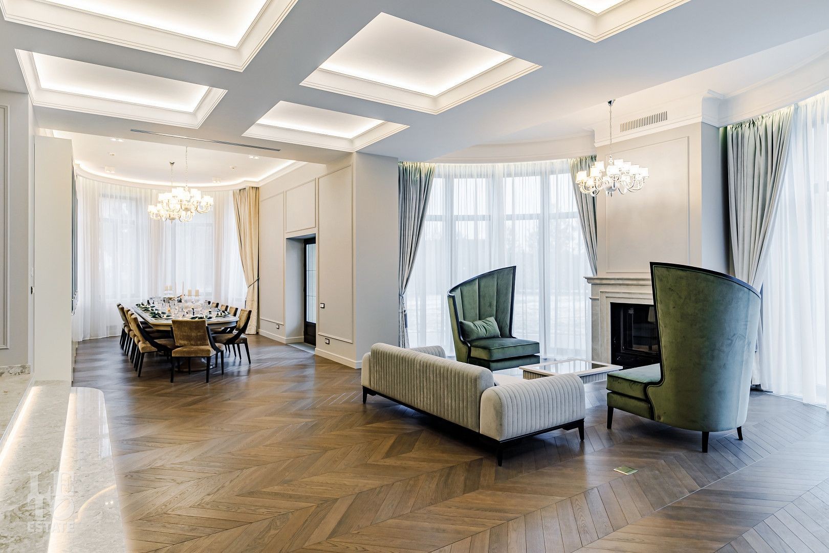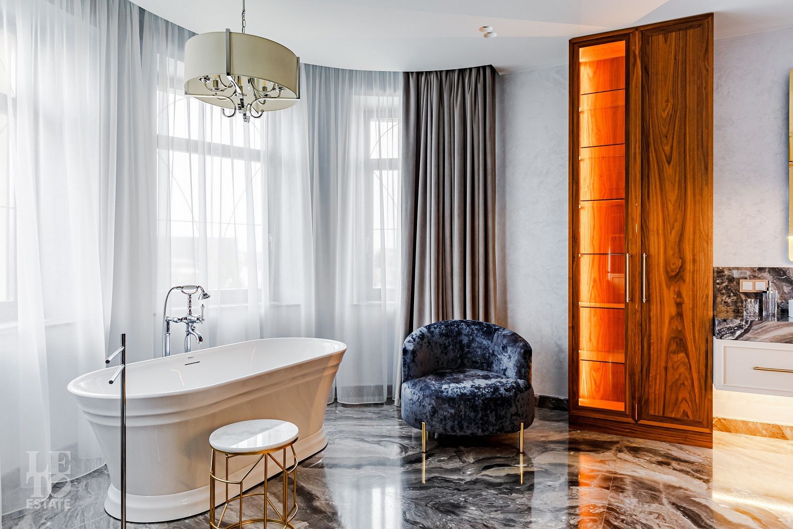 В отделке использовались самые высококачественные премиальные материалы: итальянский мрамор: Arabescato, Карарра и турецкий мрамор: Tundra Grey, Montana Beige, Daino Reale. Особенностью интерьера являются дубовые полы и кессонные потолки в гостиной. Высококлассная мягкая мебель выполнена на заказ компанией Gordon Group mebel, современная бытовая техника и сантехническое оборудование от лучших мировых производителей.