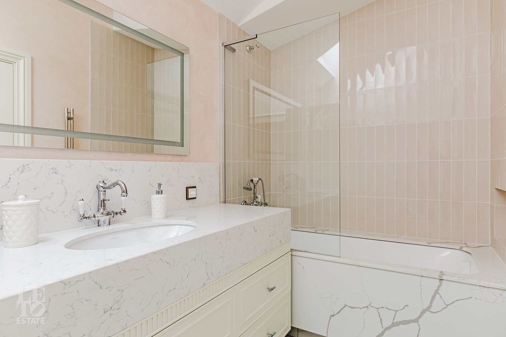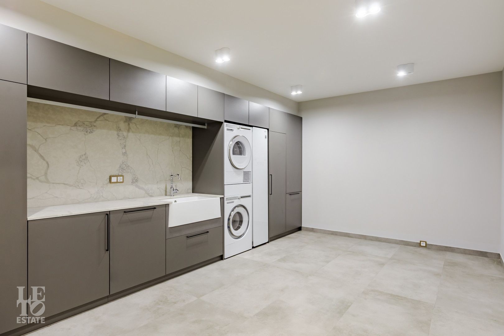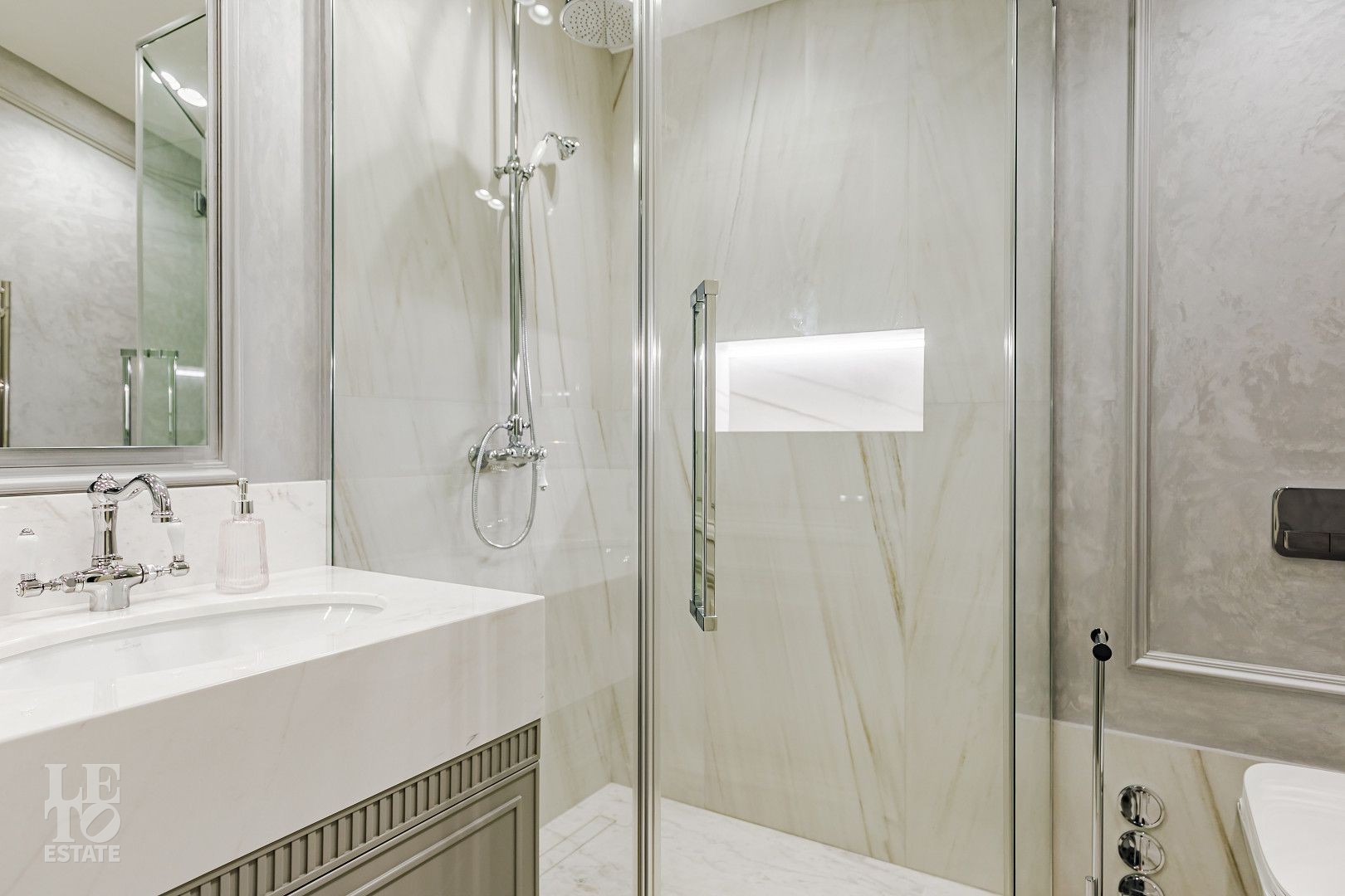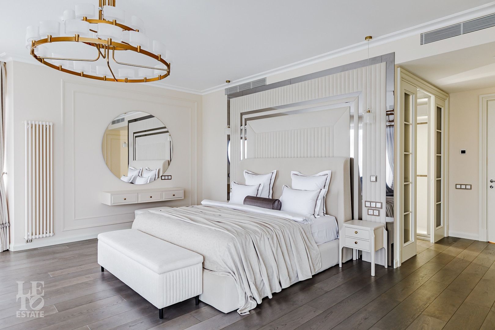 В отделке использовались самые высококачественные премиальные материалы: итальянский мрамор: Arabescato, Карарра и турецкий мрамор: Tundra Grey, Montana Beige, Daino Reale. Особенностью интерьера являются дубовые полы и кессонные потолки в гостиной. Высококлассная мягкая мебель выполнена на заказ компанией Gordon Group mebel, современная бытовая техника и сантехническое оборудование от лучших мировых производителей.
