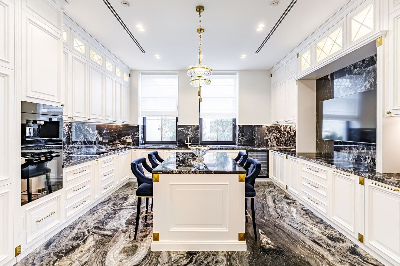 Столешницы в главной кухне выполнены из бразильского гранита, обеденный стол изготовлен из массива дерева длиной 5 м, а камин в гостиной - из мрамора Montana Beige.