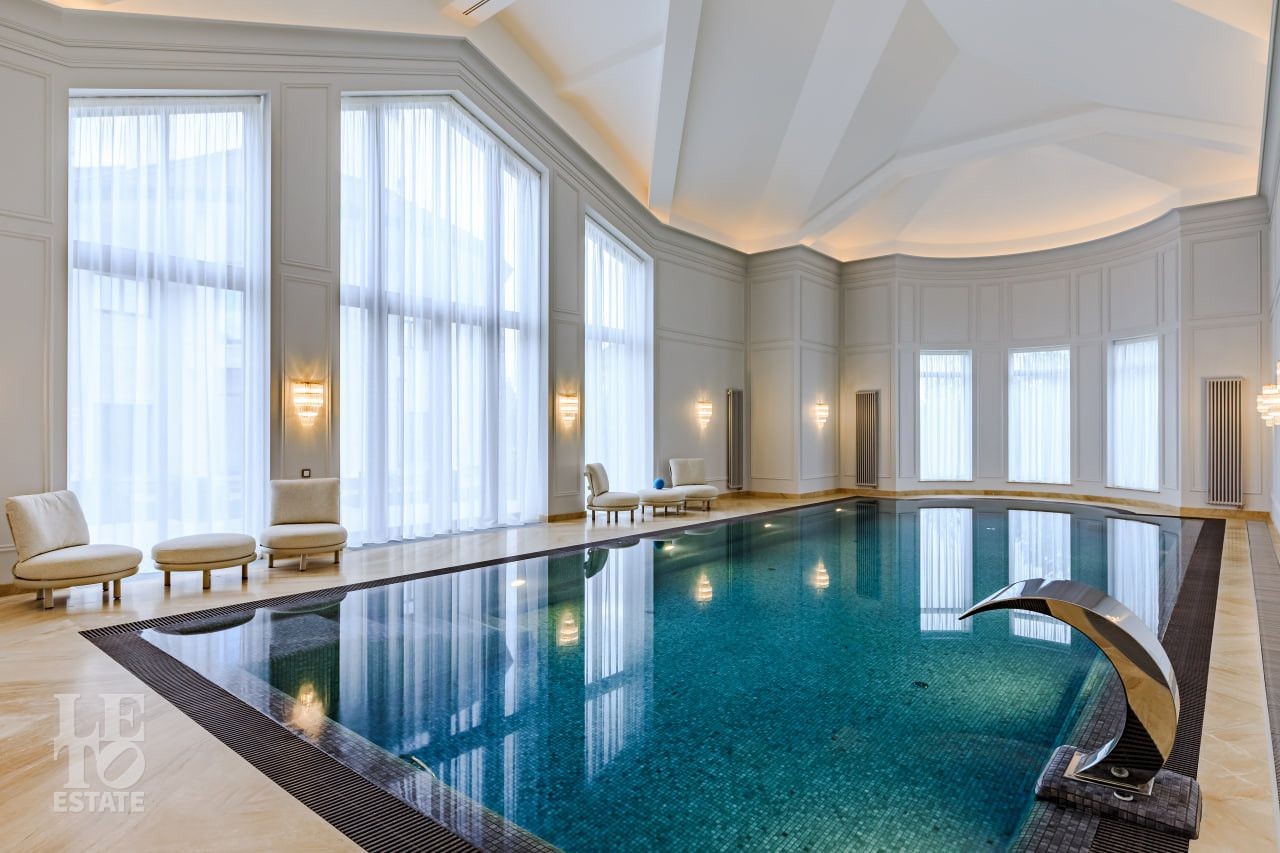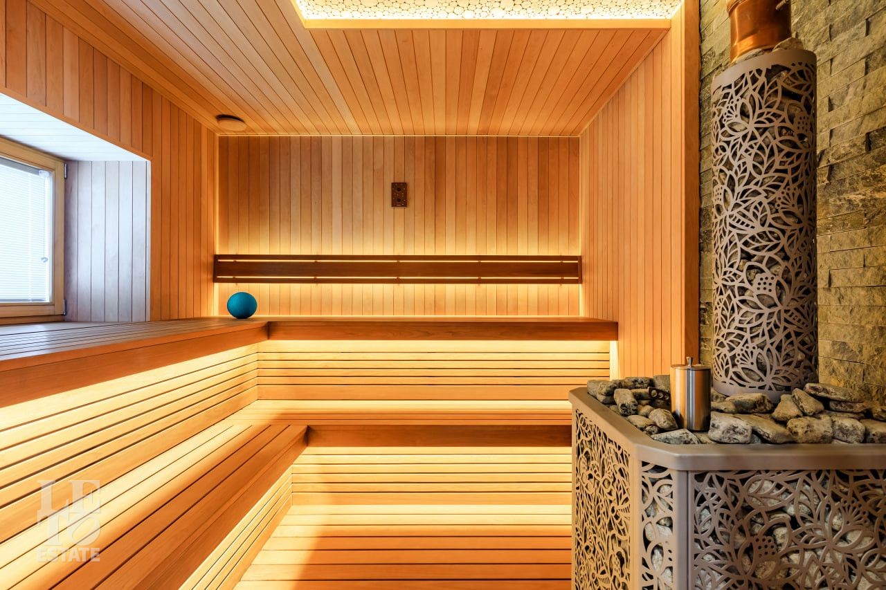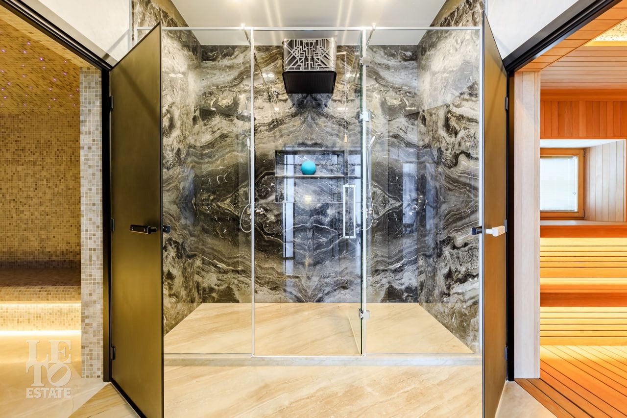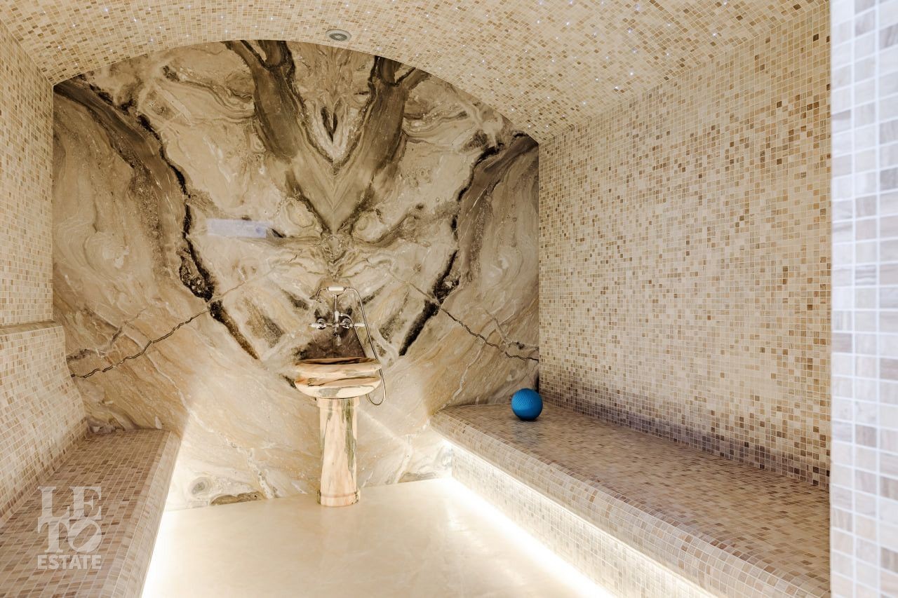 СПА комплекс - 830 м2: бассейн, хаммам, русская баня, зал для приема гостей, бильярдная, тренажерный зал, гостевой блок - две спальни и отдельный блок для персонала.