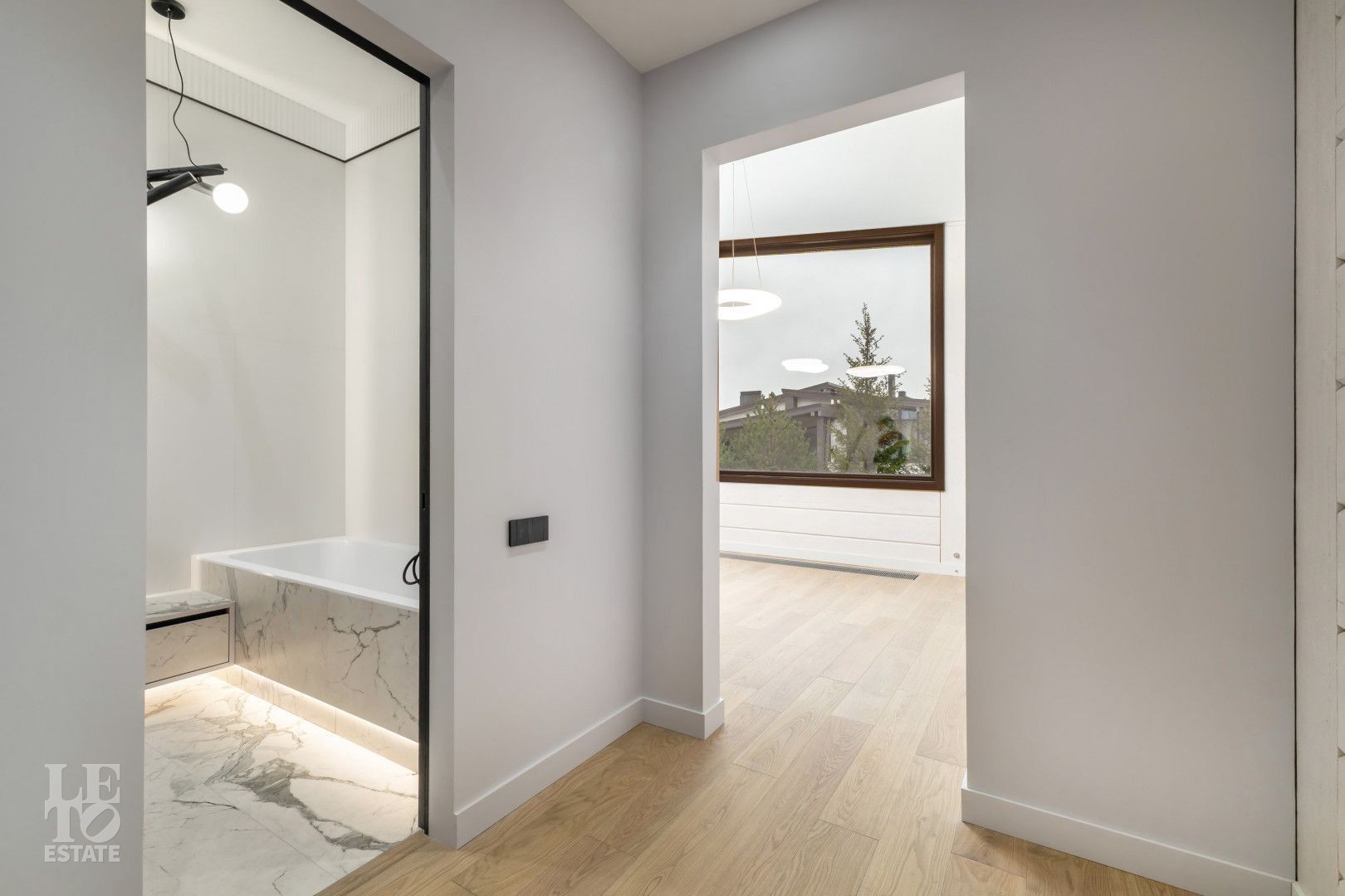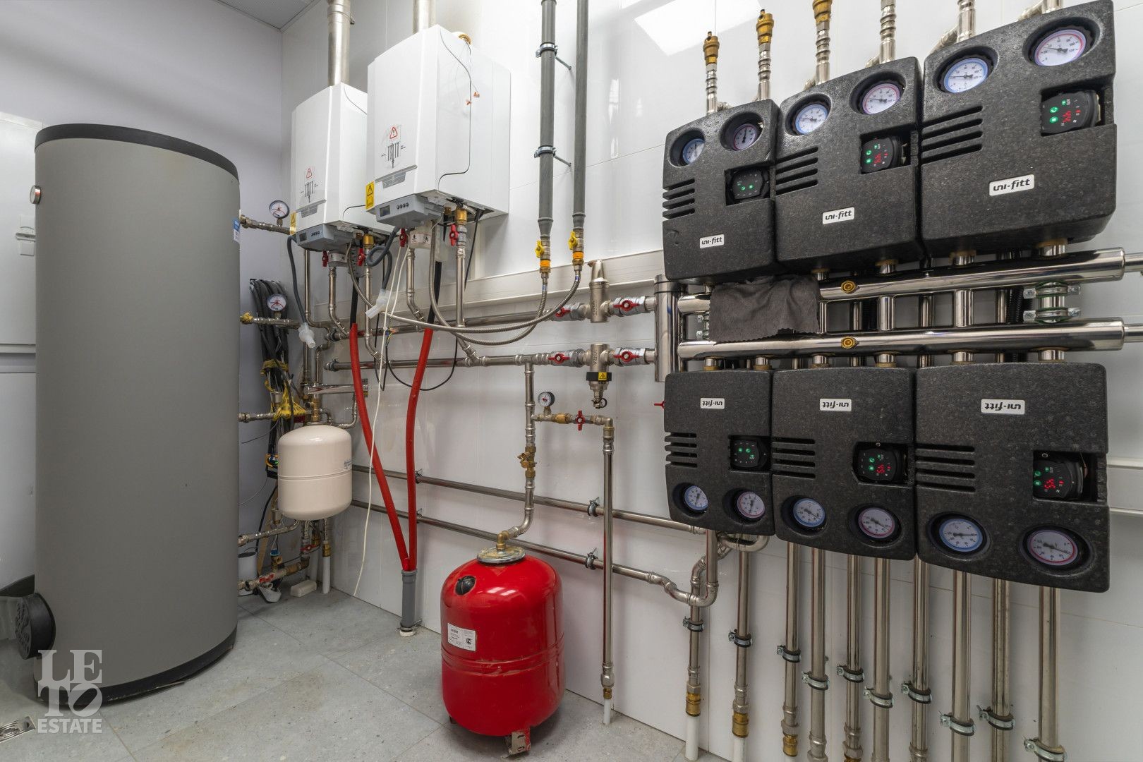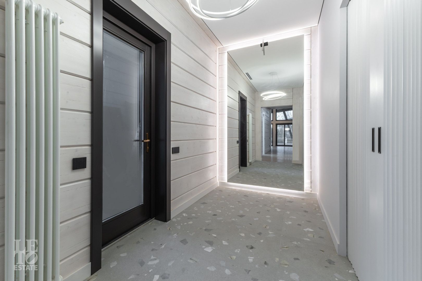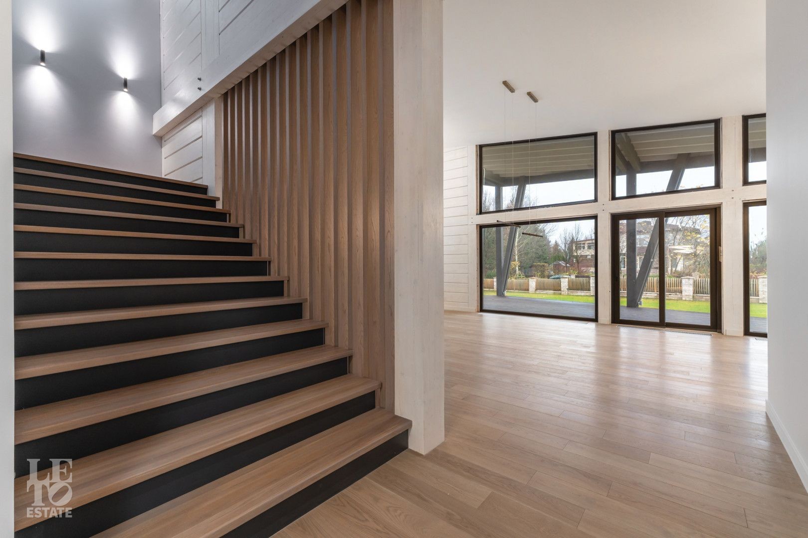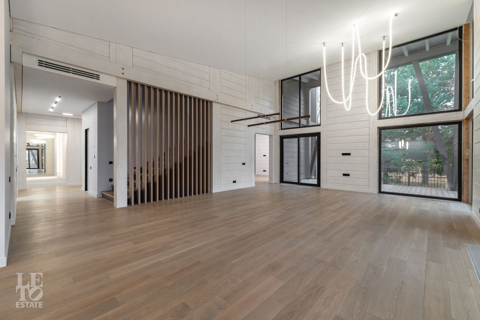 Первый этаж: прихожая, гардеробная, санузел, кухня-столовая-гостиная с выходом на террасу 90м2, постирочная, кабинет, гостевая спальня с санузлом, котельная, кладовая для спортивного и садового инвентаря, навес для авто;