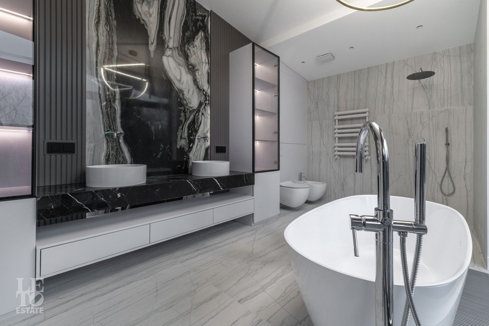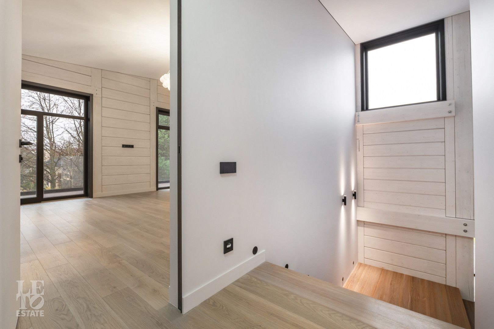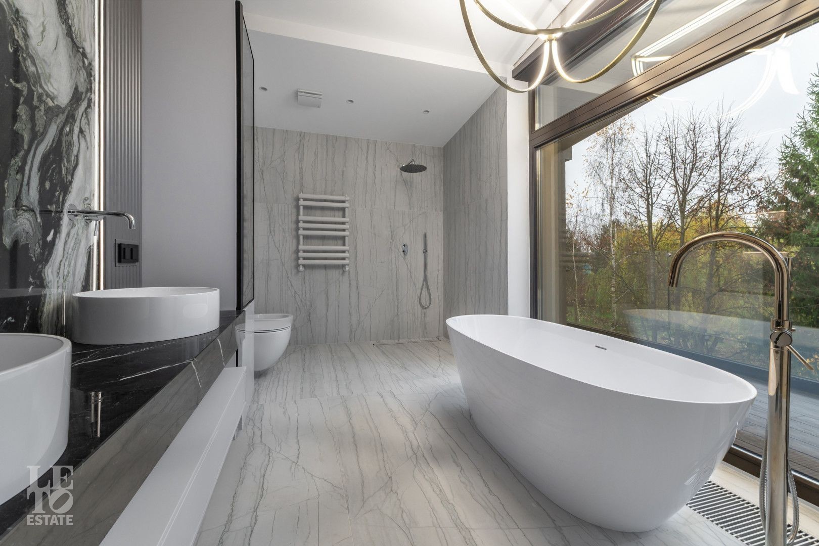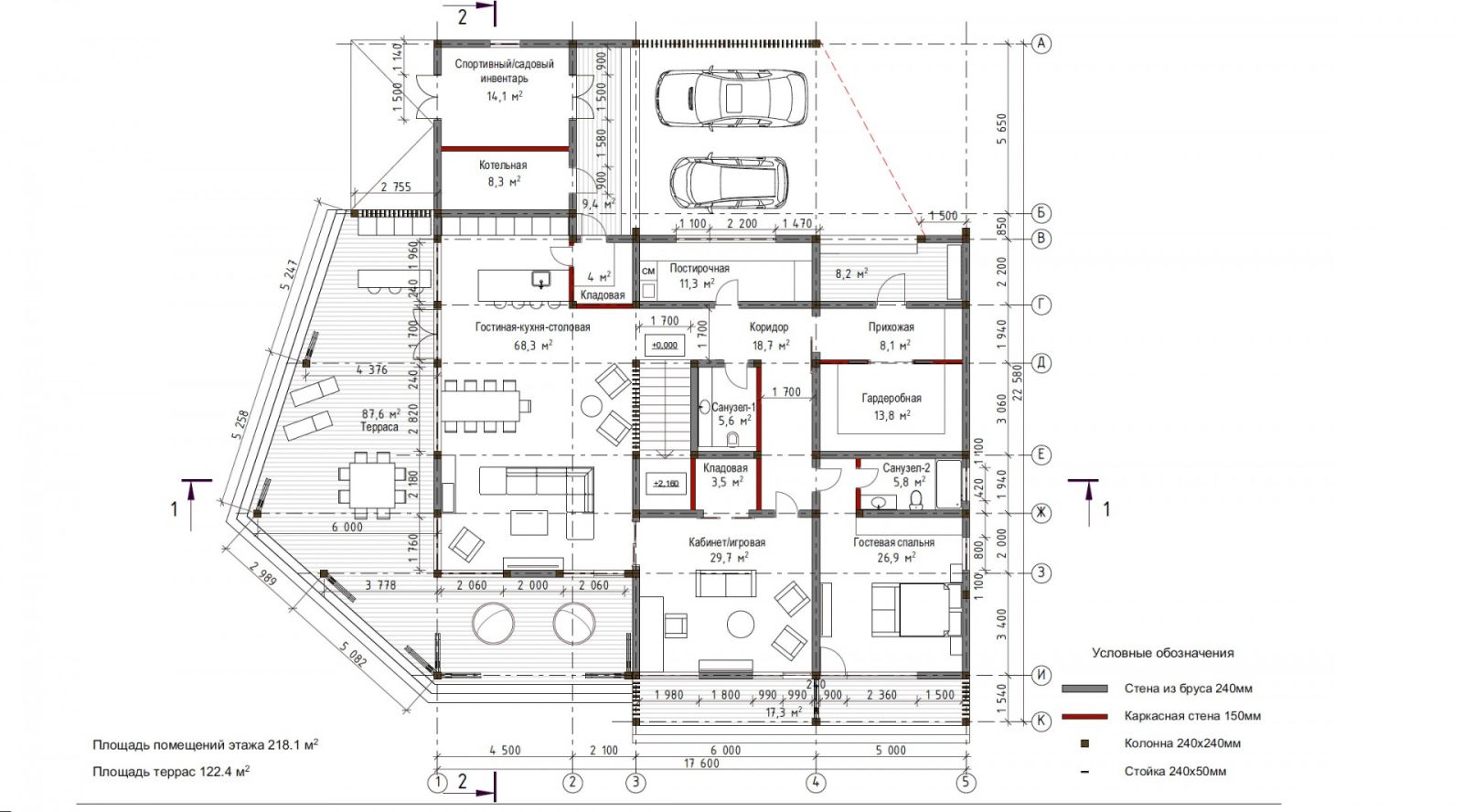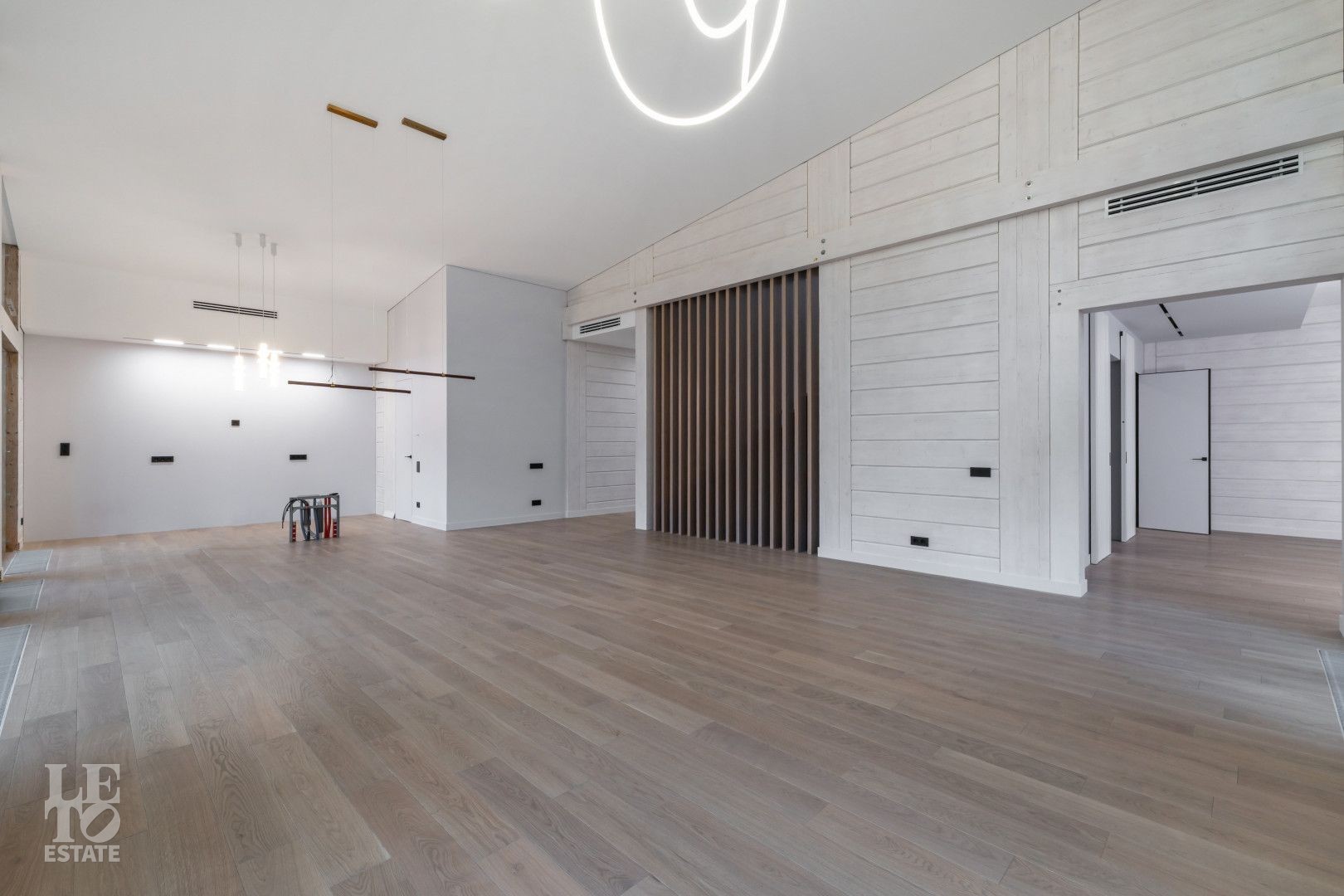 Первый этаж: прихожая, гардеробная, санузел, кухня-столовая-гостиная с выходом на террасу 90м2, постирочная, кабинет, гостевая спальня с санузлом, котельная, кладовая для спортивного и садового инвентаря, навес для авто;