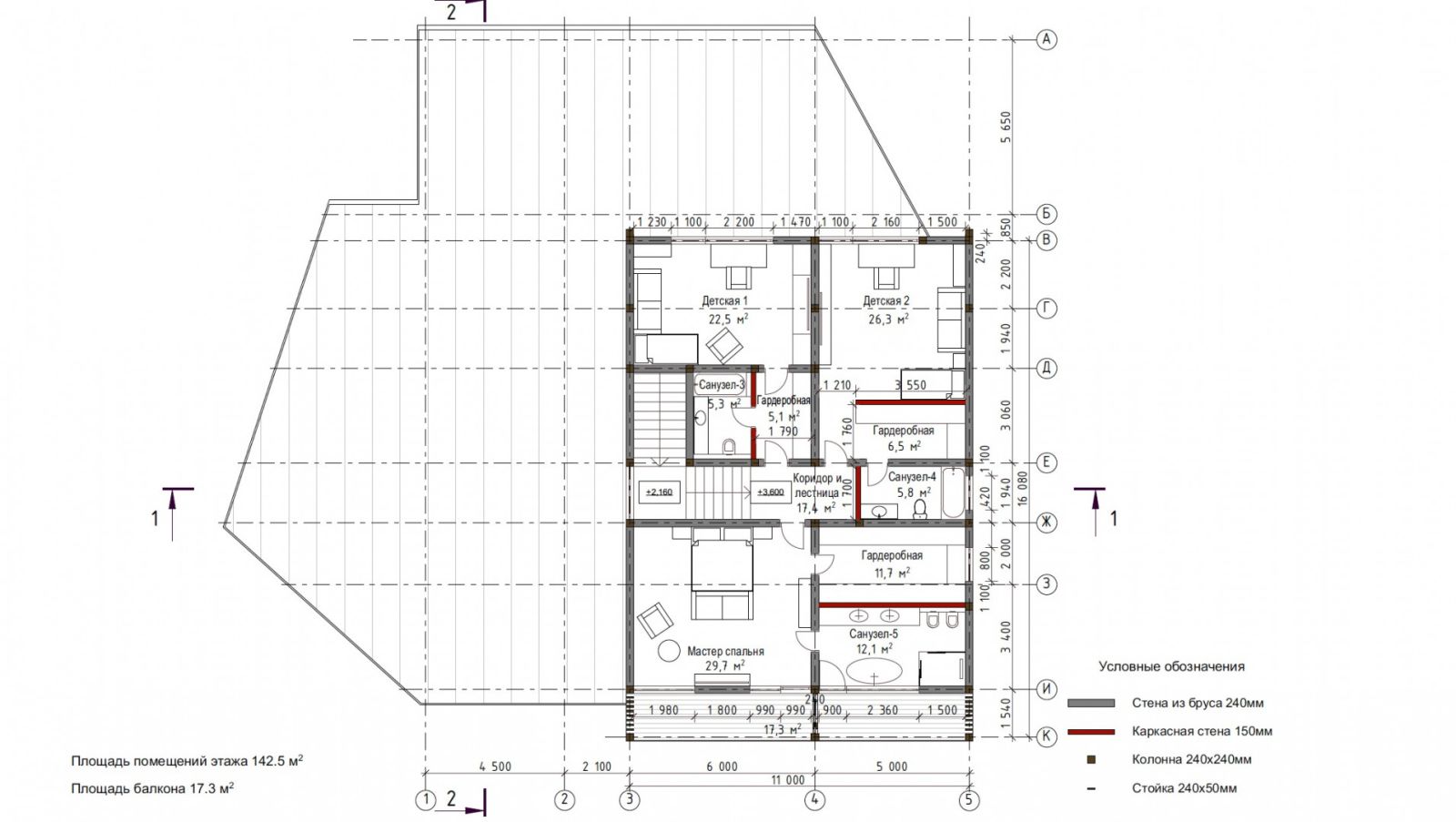 Второй этаж: мастер-спальня с гардеробной и санузлом, две детские спальни с санузлами и гардеробными, холл.