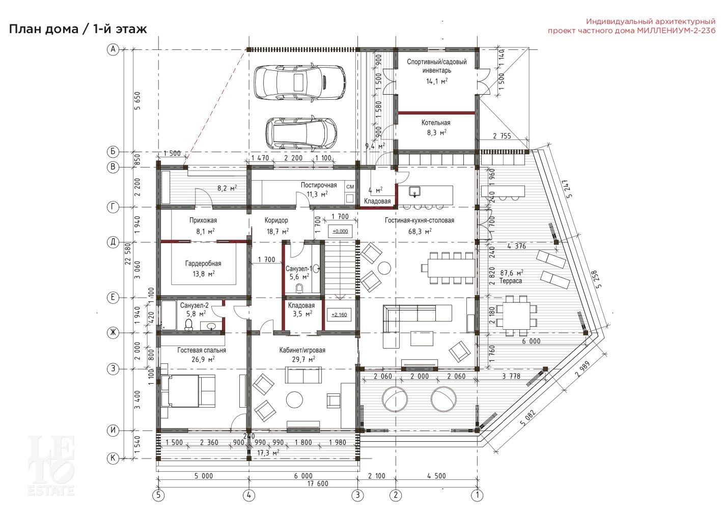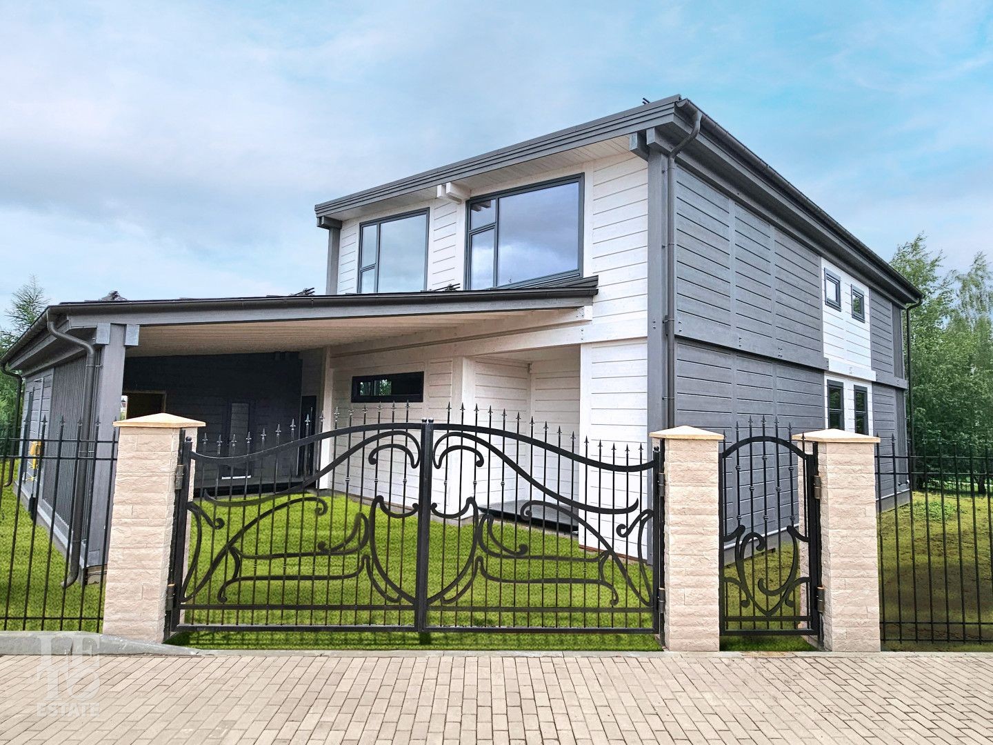 Первый этаж: прихожая, большая гардеробная, гостевой cанузел, кухня-столовая-гостиная с выходом на террасу 90м2, постирочная, кабинет, гостевая спальня с санузлом, котельная, кладовая для спортивного и садового инвентаря, навес для авто;
