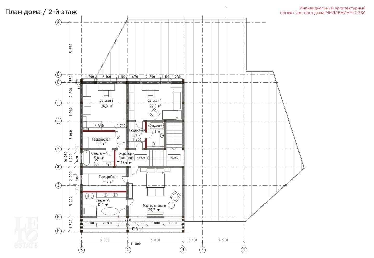 Второй этаж: хозяйская спальня с гардеробной и санузлом, две детские спальни с санузлами и гардеробными, холл.