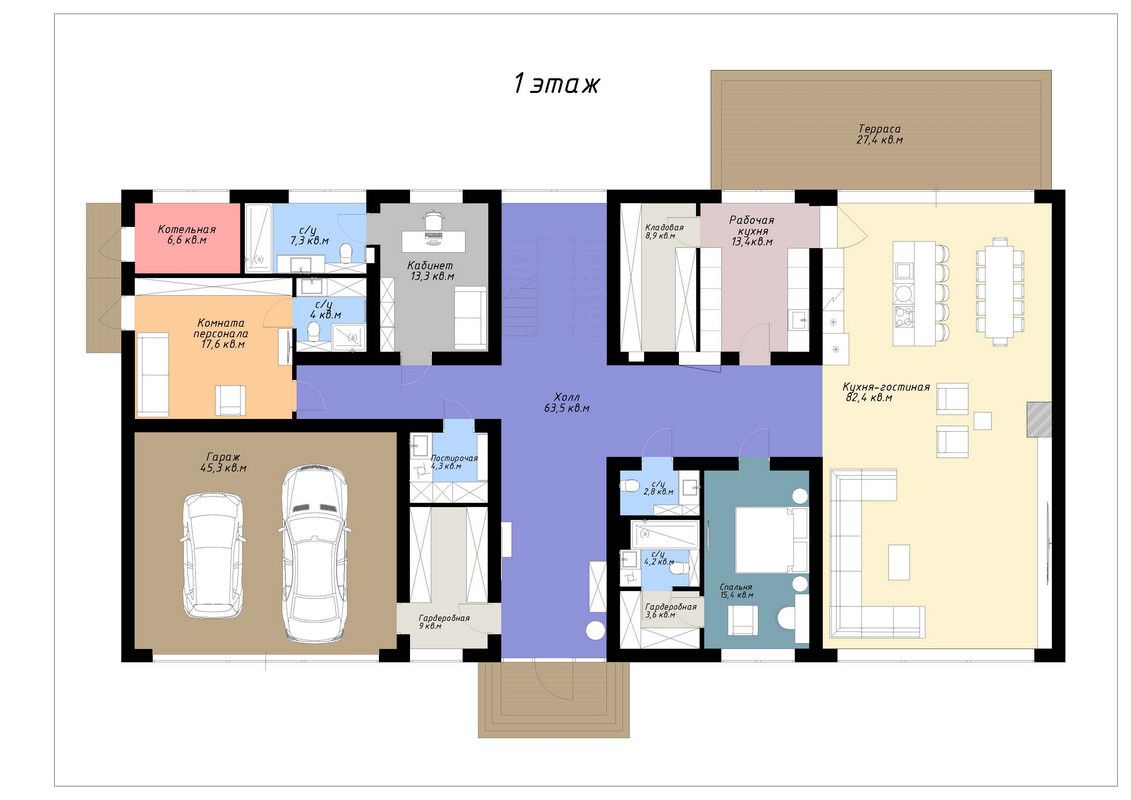 Первый этаж: гардеробная, гостевой санузел, спальня с санузлом, кухня - столовая - гостиная, техническая кухня с кладовой комнатой, постирочная, кабинет/спальня с санузлом, спальня для персонала со своим санузлом