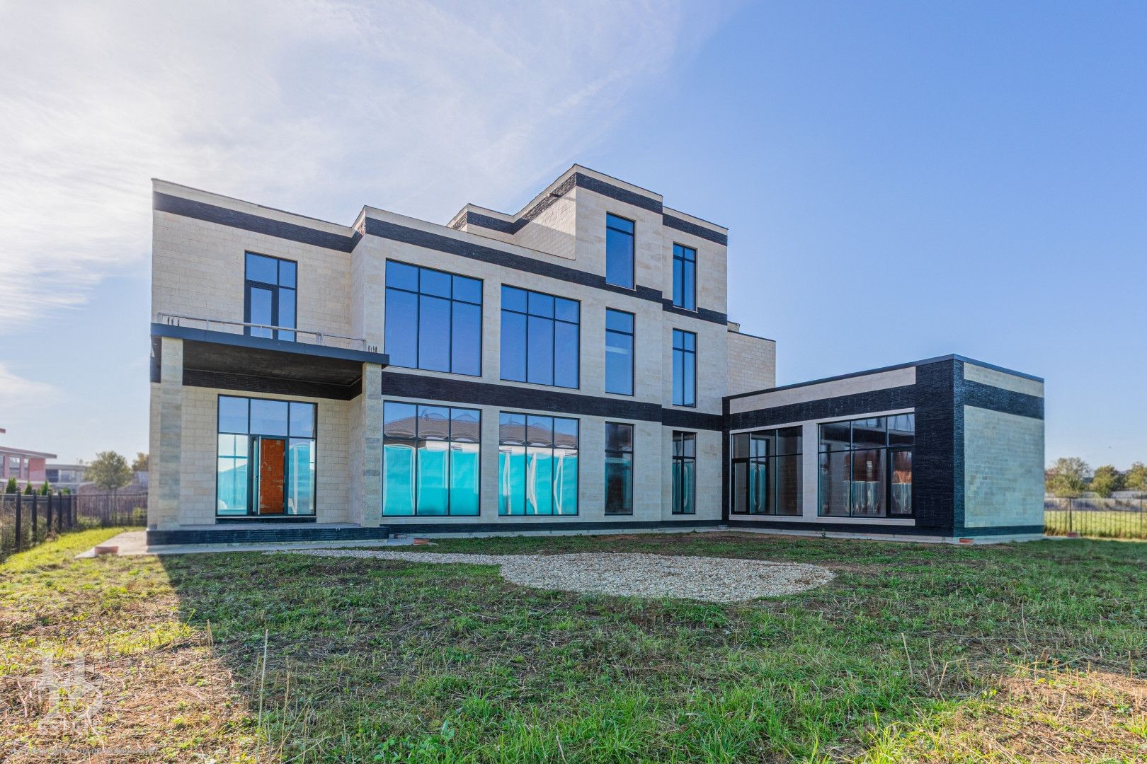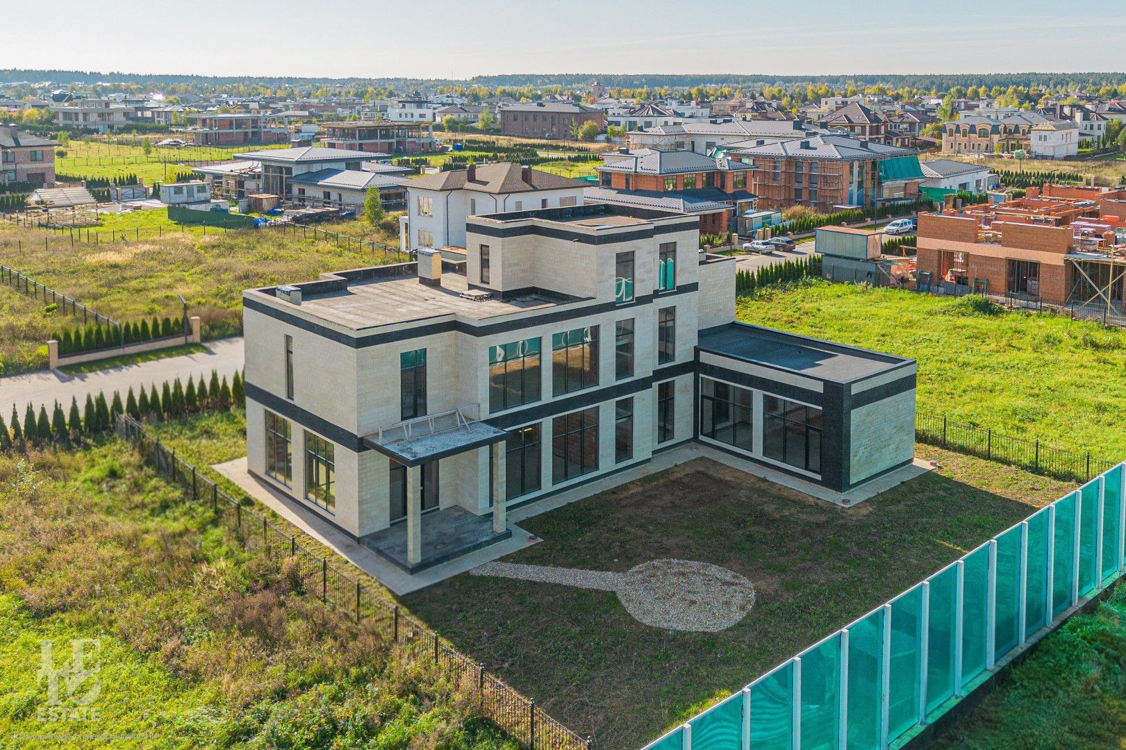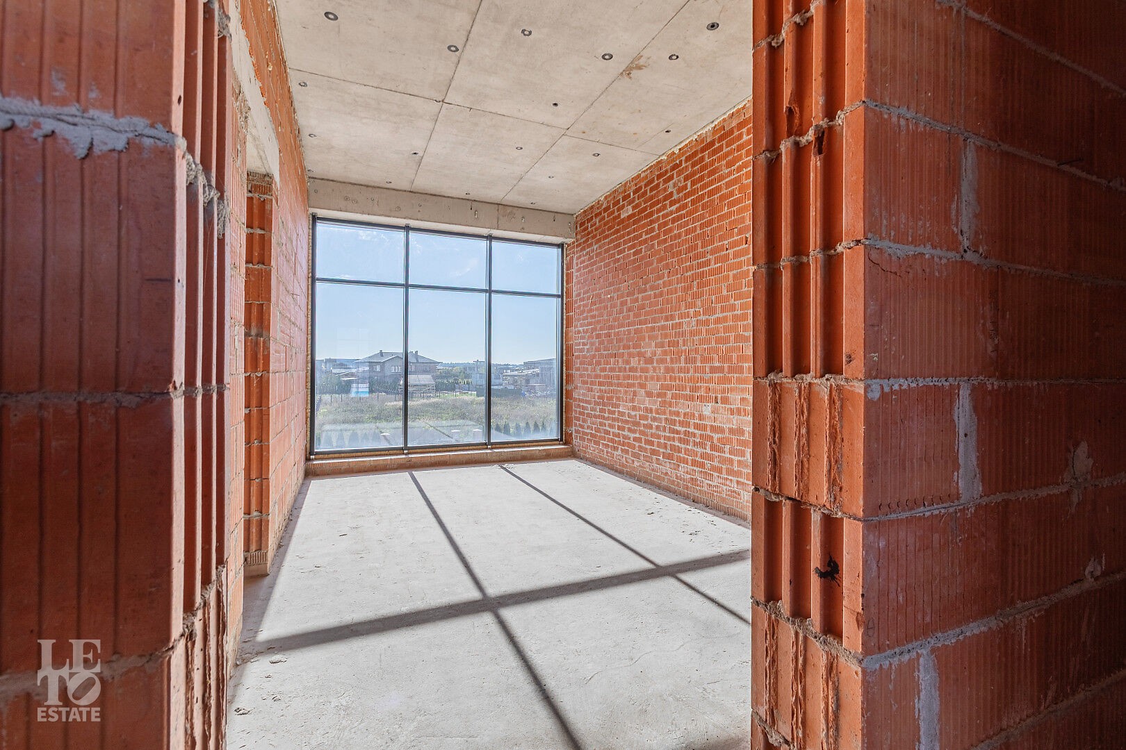 Дом построен в современной архитектурной стилистике, с панорамным остеклением и плоскими эксплуатируемыми кровлями, на которых можно обустроить дополнительные зоны для отдыха.