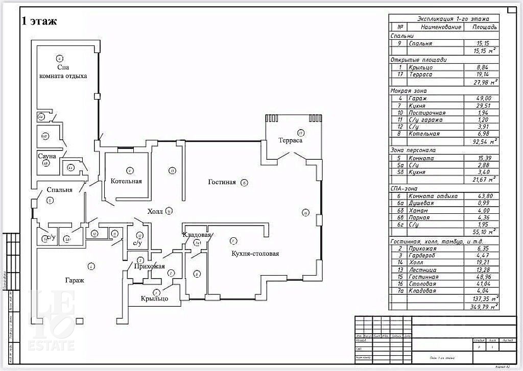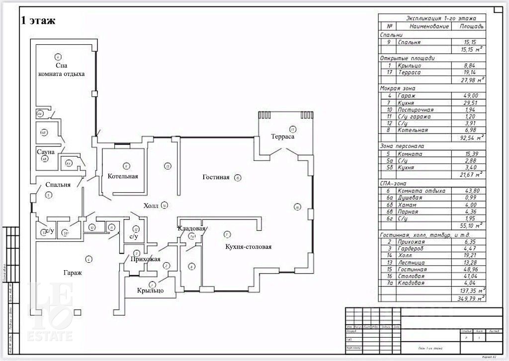 Первый этаж - прихожая, гардеробная, гостевой с/у, гостиная с выходом на террасу, кухня-столовая, кладовая, гостевая спальня с с/у, СПА с сауной, хаммамом, комнатой отдыха и выходом на террасу, гараж на два машиноместа.