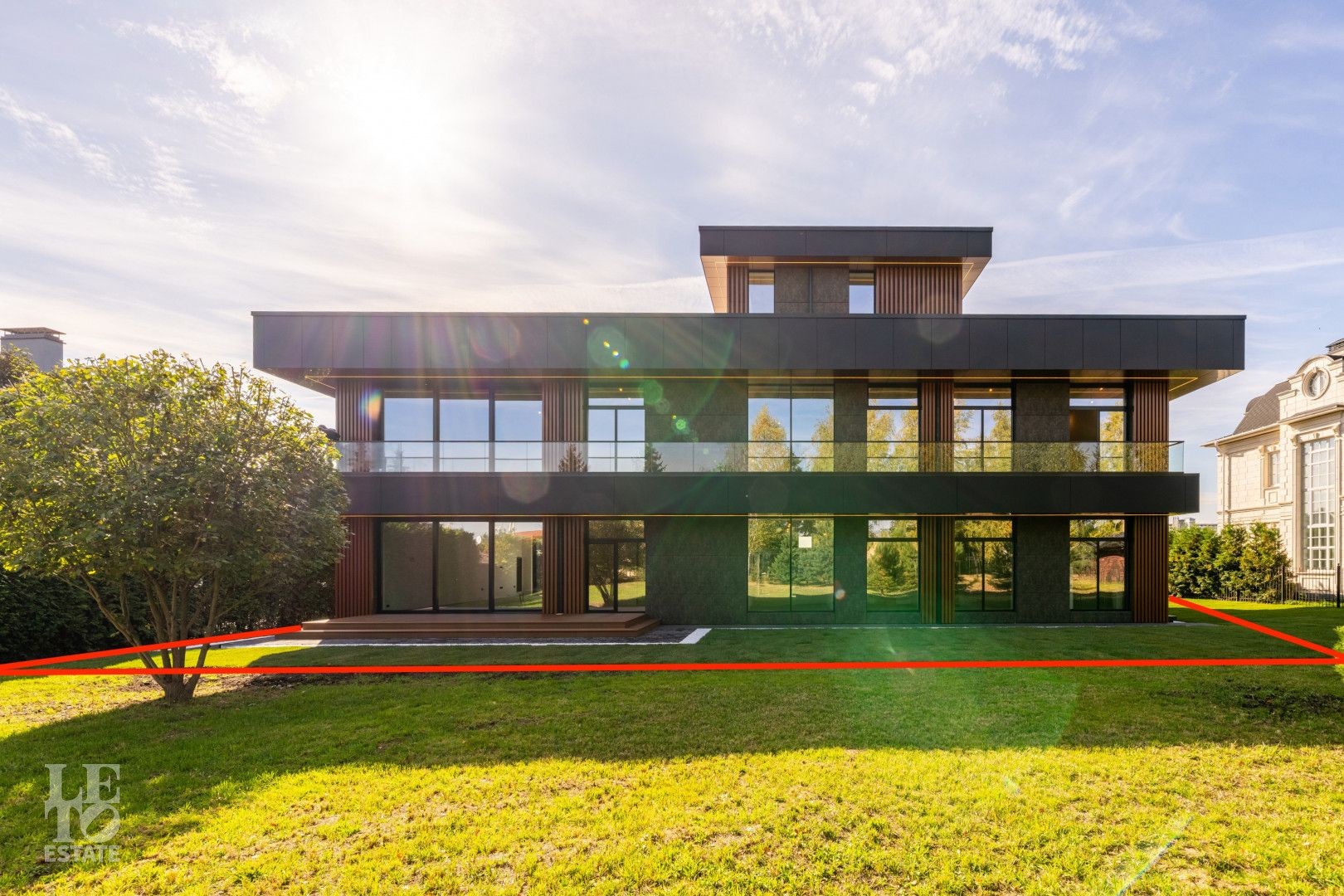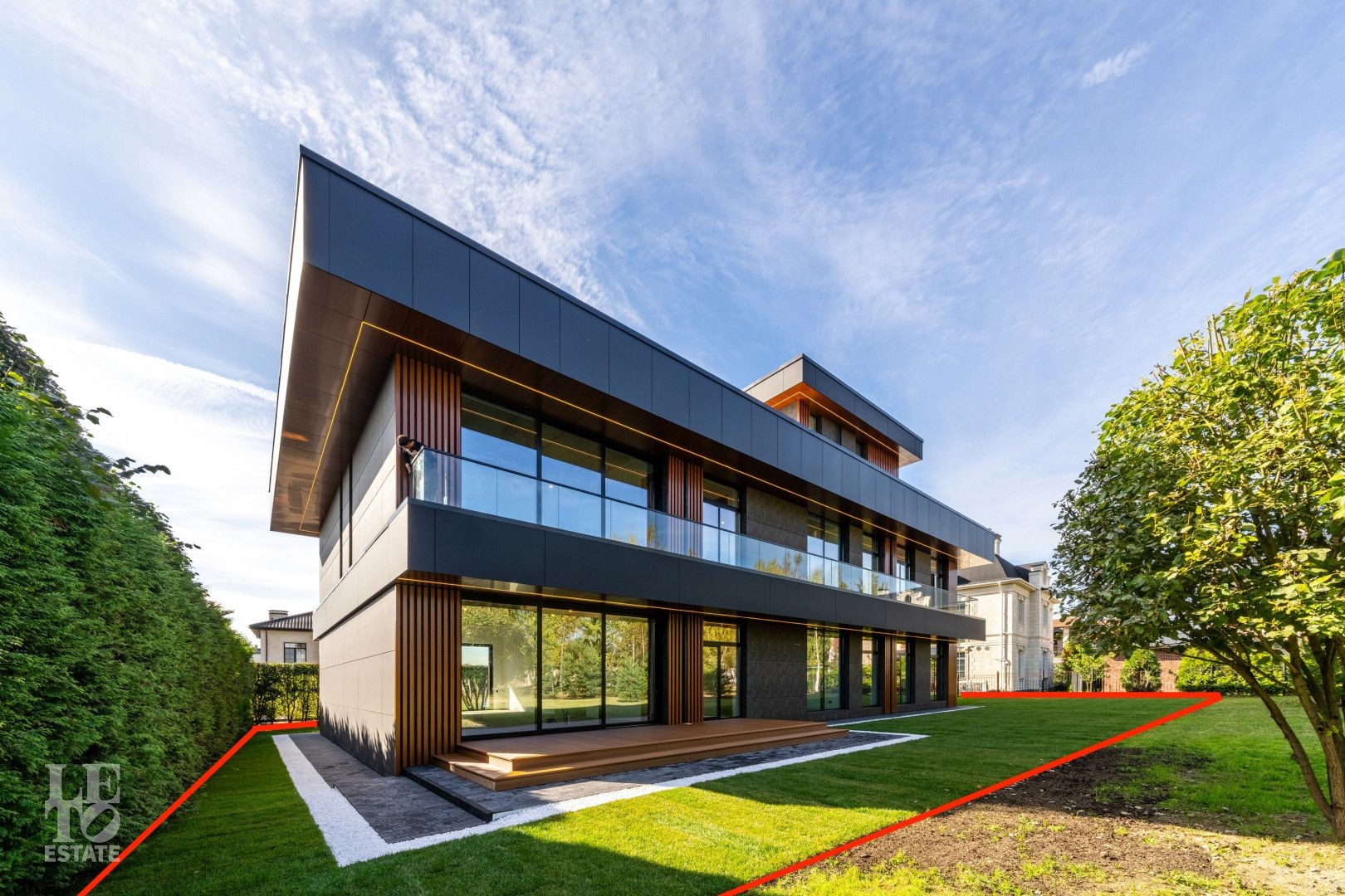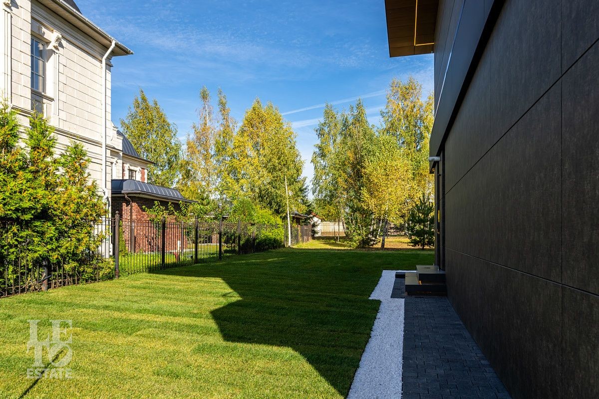 Участок полностью огорожен, установлены ворота с электроприводом. По периметру дома сделан дренаж. Выстелен газон, высажены декоративные кустарники. Возможно приобретение дома с участком площадью 21,5 сотки.