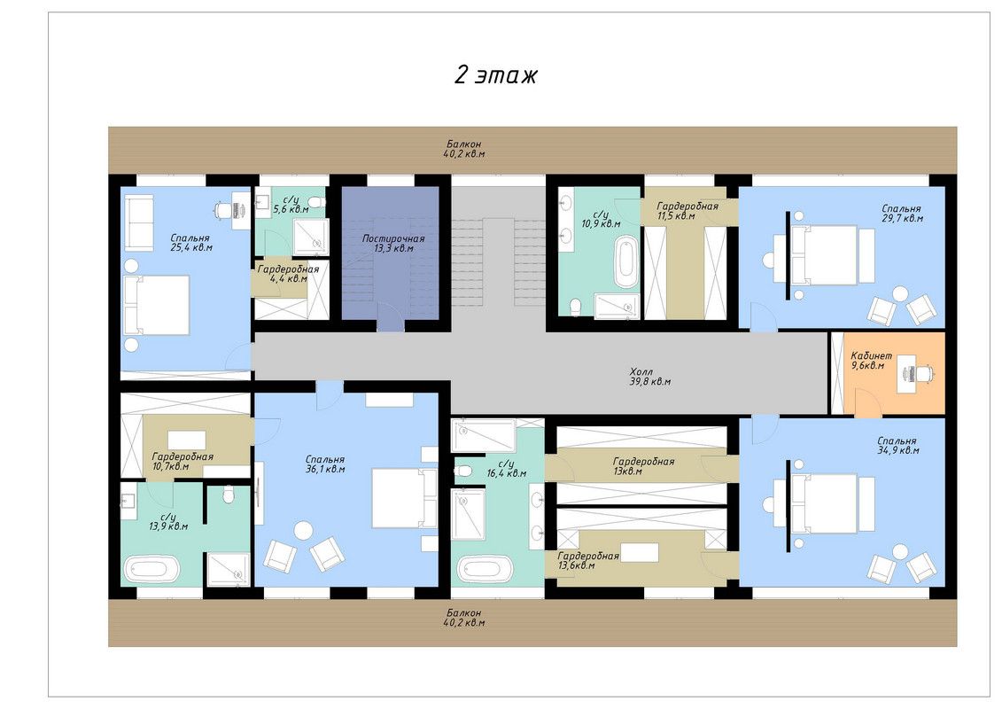 Второй этаж: мастер-спальня с двумя гардеробными, кабинетом и санузлом, три спальни с гардеробными и санузлом
