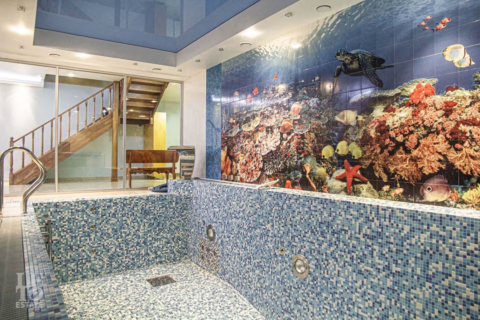 Минус первый этаж: зона SPA: бассейн с переливом 8х4м с гидромассажем и водопадом, дровяная баня, санузел;