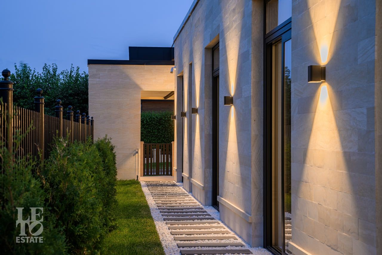 Вечернее освещение ландшафта в сочетании с регулируемой подсветкой фасада дома, создают приятную атмосферу в любое время года.