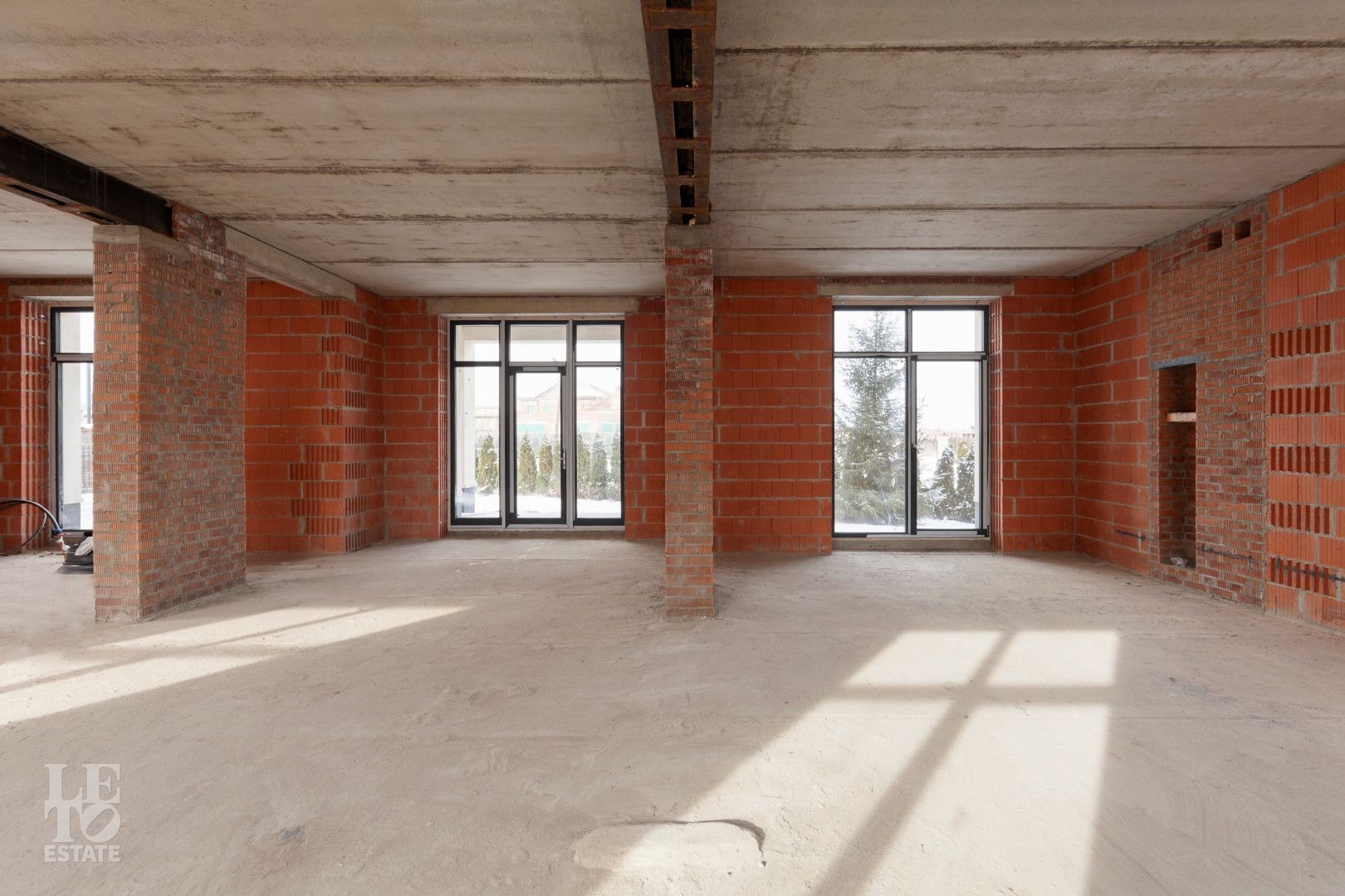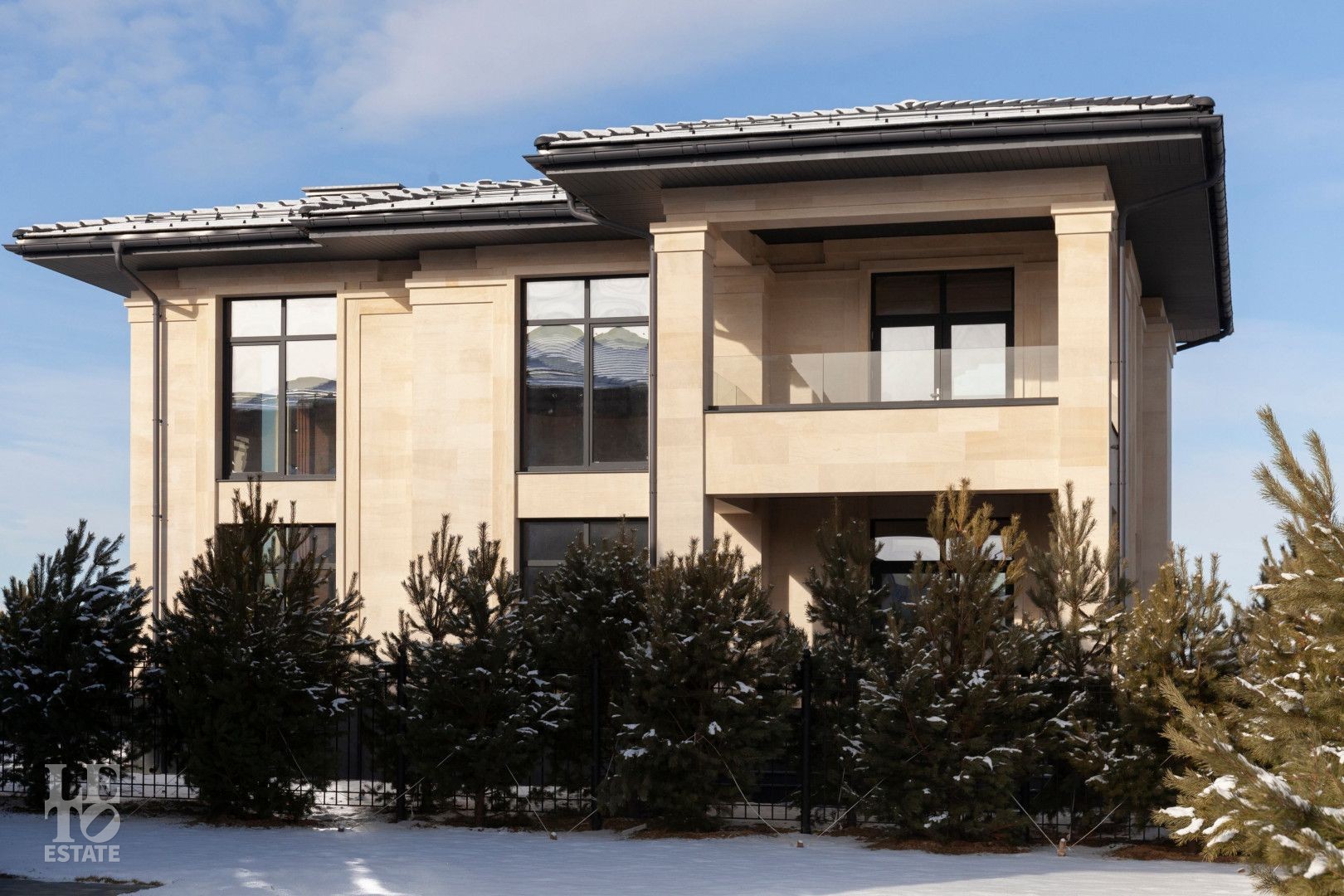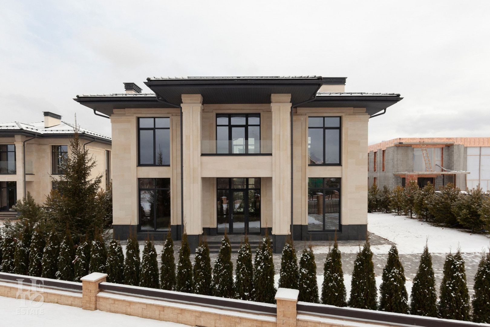 Архитектурный проект дома выполнен в современном стиле Райта. Фундамент дома железобетонный свайный с монолитным ростверком. Стены построены из керамических блоков POROTERM 51. Стропильная система кровли выполнена из сухого хвойного бруса, обработанного огнебиозащитным составом (ГОСТ 20022.6-93), покрыта черепицей BRAAS. Высота потолков составляет 3,3м. На первом и втором этаже есть террасы с стеклянным ограждением. Дом облицован натуральным камнем. Дом продается без отделки.