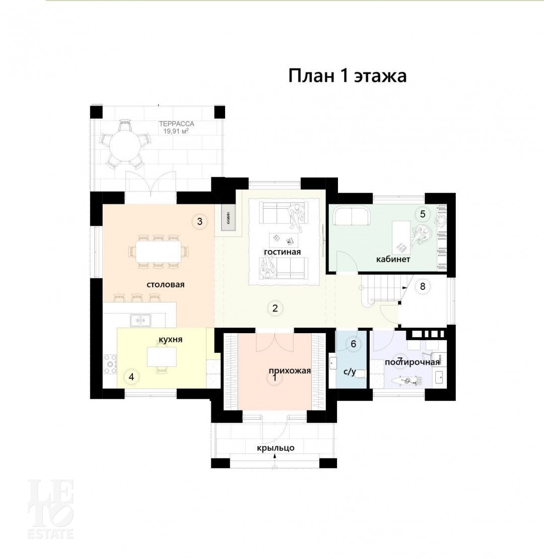 Первый этаж – прихожая, кухня-столовая с террасой, гостиная, кабинет, постирочная, санузел.