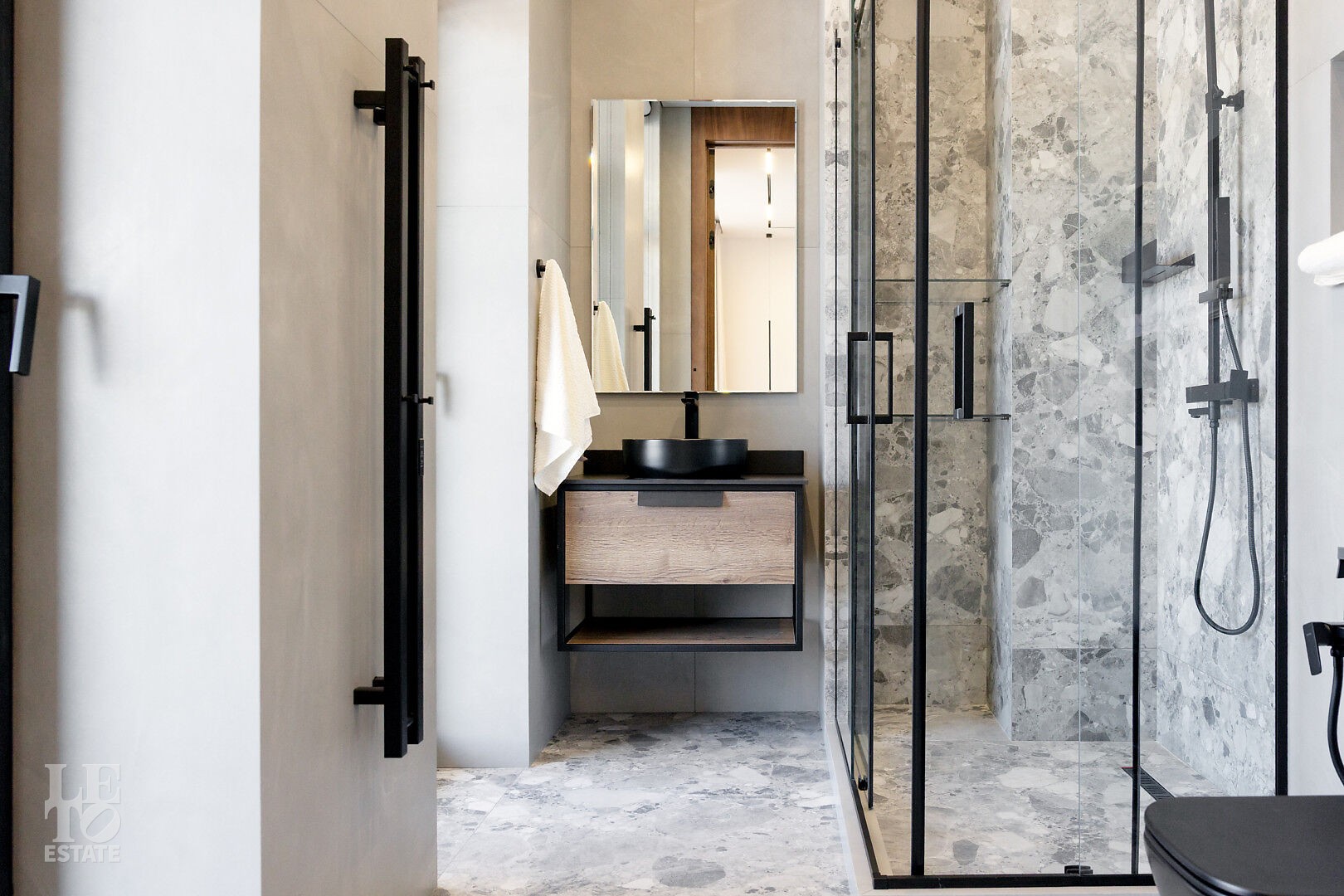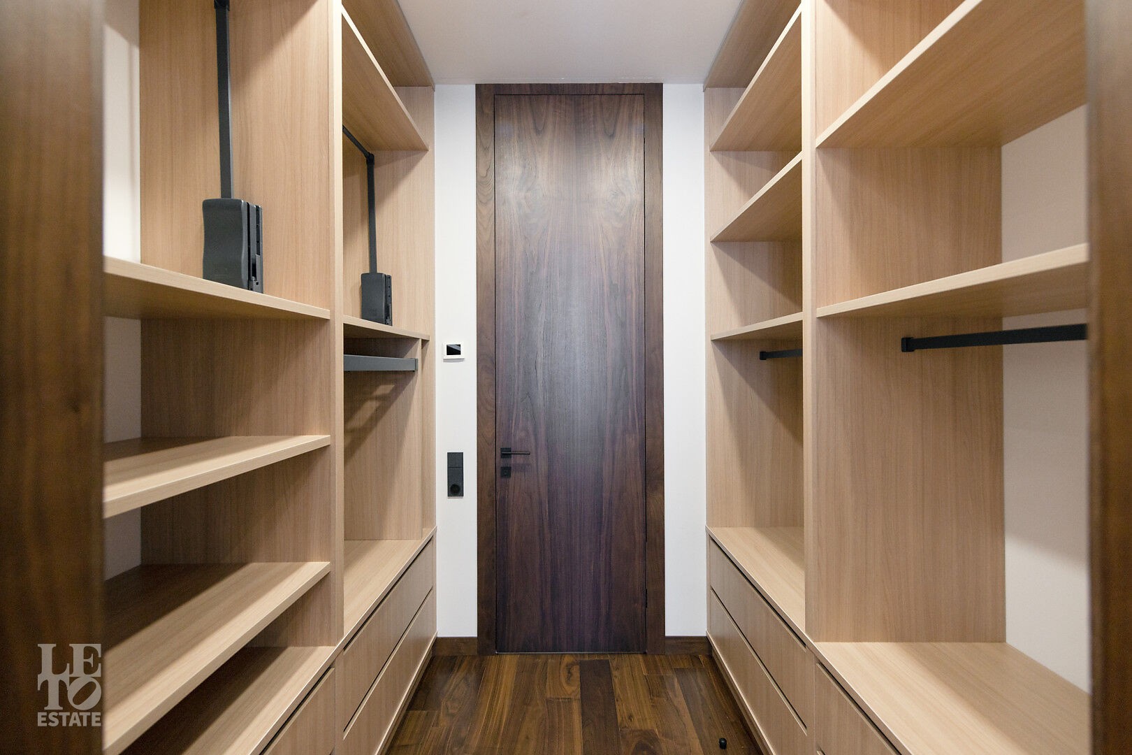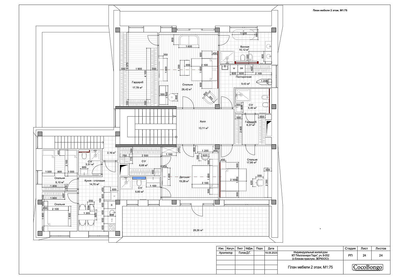 Второй этаж: две спальни, каждая со своей гардеробной и ванной комнатами, детская спальня со своим санузлом, две спальни, каждая со своим санузлом, кухня-столовая, постирочная.