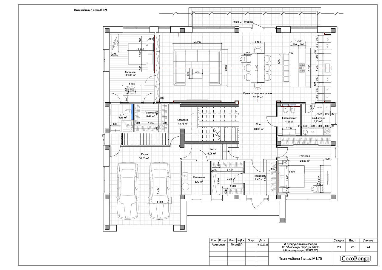 Первый этаж: прихожая, холл, гардеробная, санузел, кухня-гостиная-столовая с выходом на террасу, рабочая кухня, спальня со своей гардеробной и ванной комнатами, гостевая спальня, котельная, кладовая, гараж на два машиноместа.