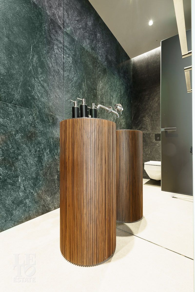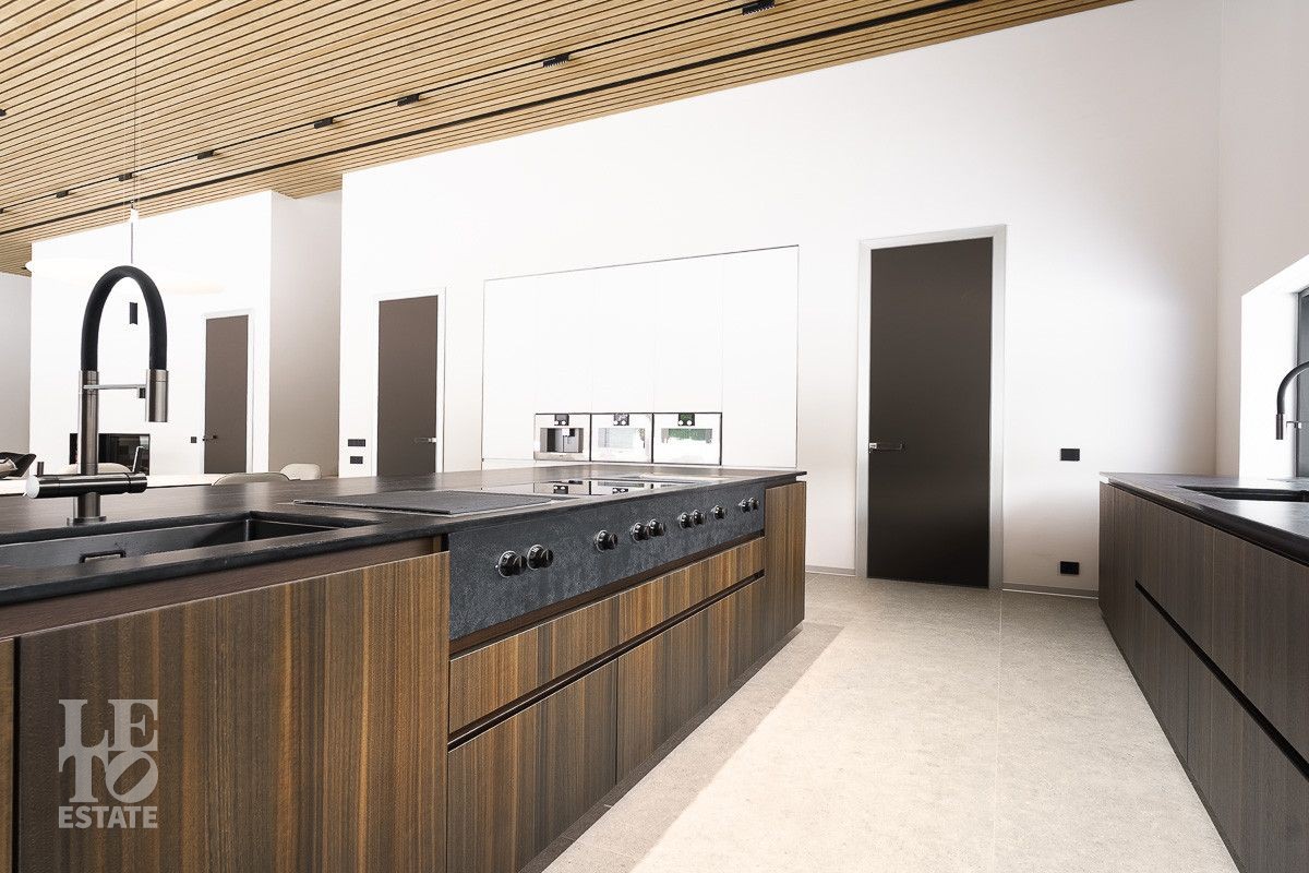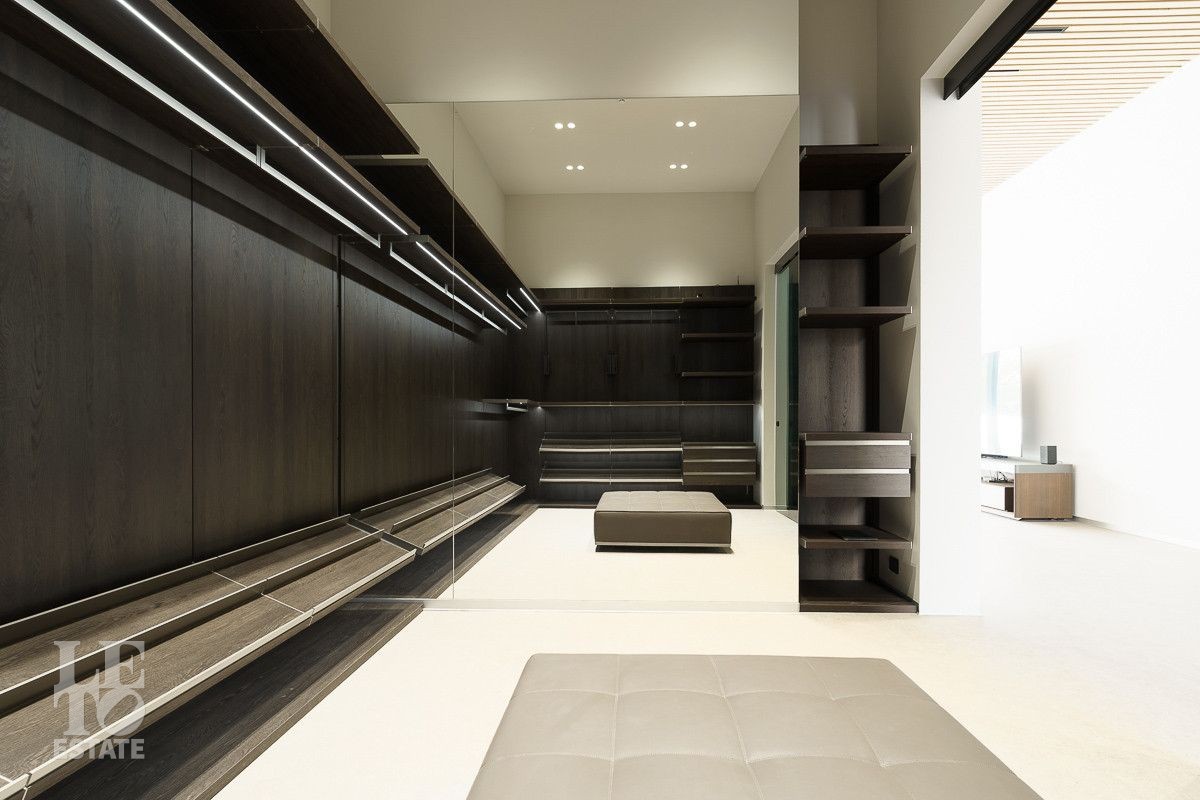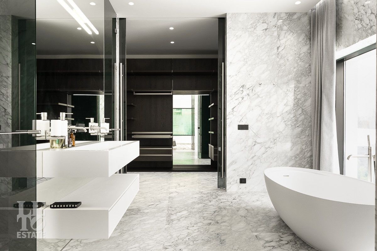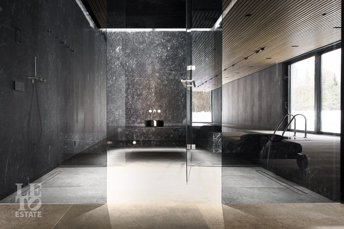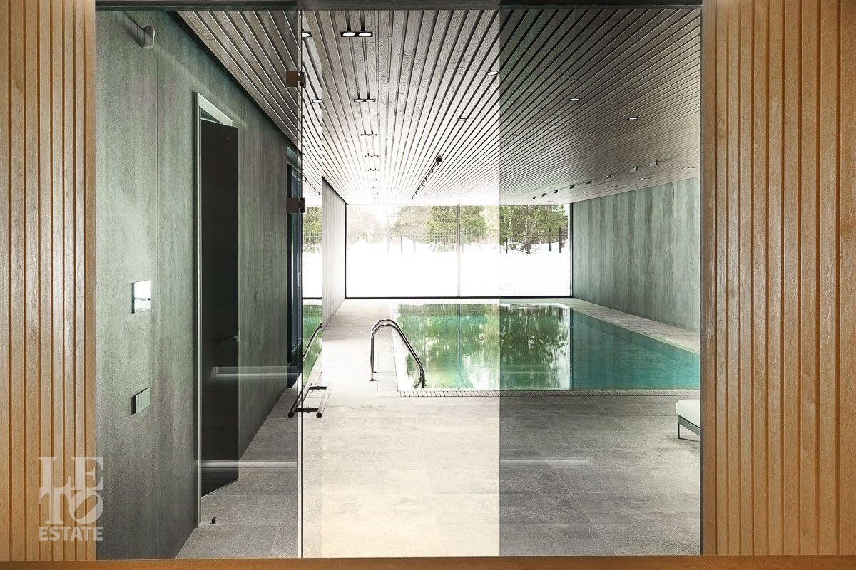 Первый этаж: холл, гардеробная, два санузла, гостиная, кухня, столовая, терраса, рабочая кухня, кабинет, кладовая, SPA-зона с бассейном, хаммамом, сауной и душевой, гараж с мойкой, зарядкой для электромобилей и квартирой для персонала на втором этаже;