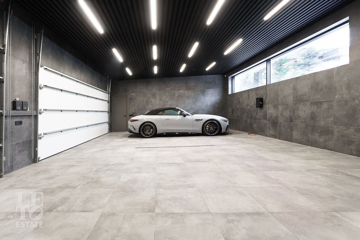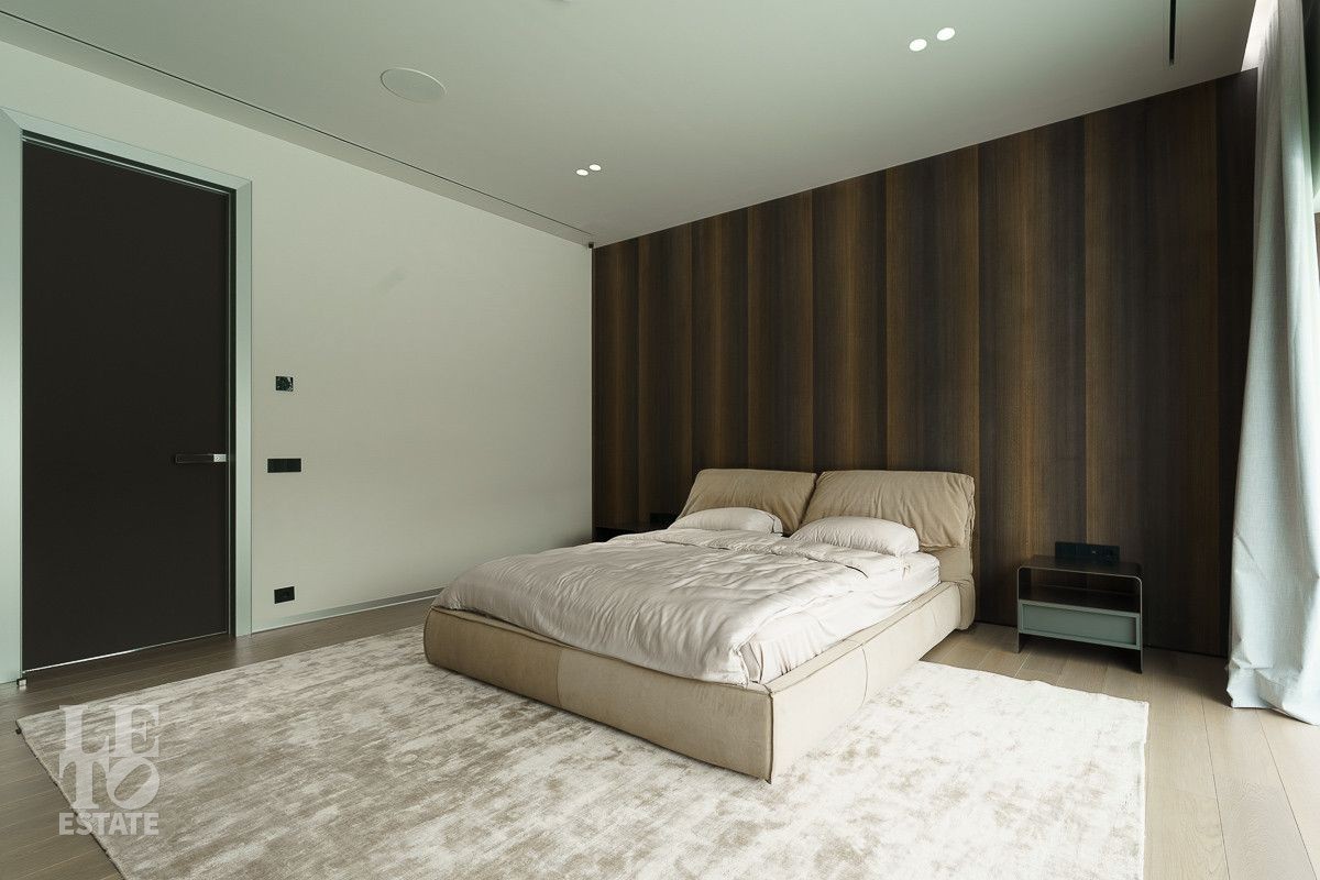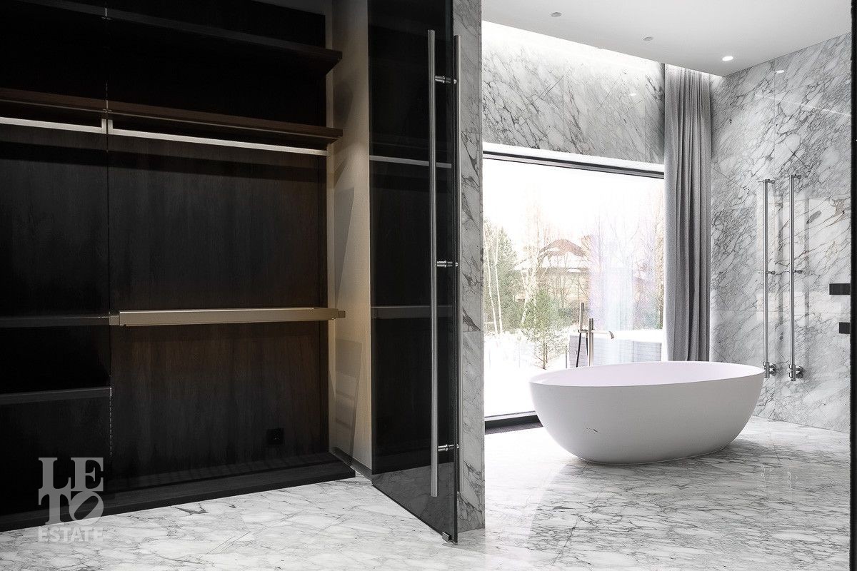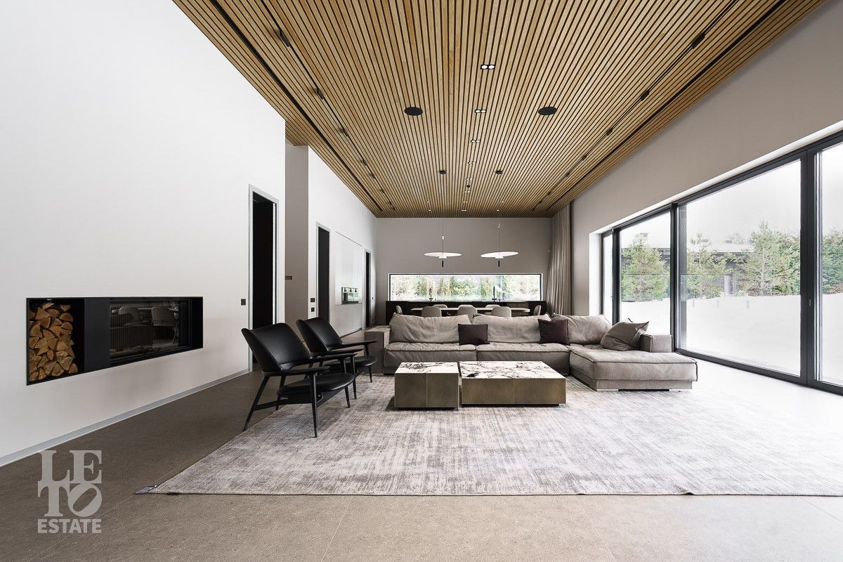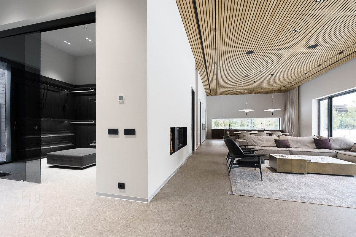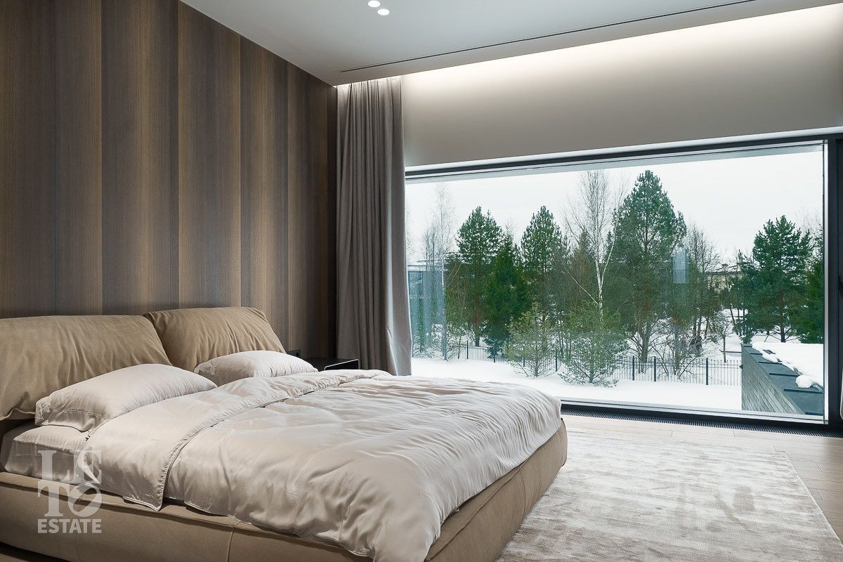 В доме выполнена отделка по индивидуальному проекту, в современном стиле с использованием дорогих, качественных материалов. Благодаря высоким потолкам и большим окнам в пол пространство наполнено воздухом и светом. Эксклюзивные дизайнерские решения придают уникальность внутреннему пространству дома. Из всех окон открывается потрясающий вид на участок. Гараж идеально интегрирован в архитектурный контур здания.