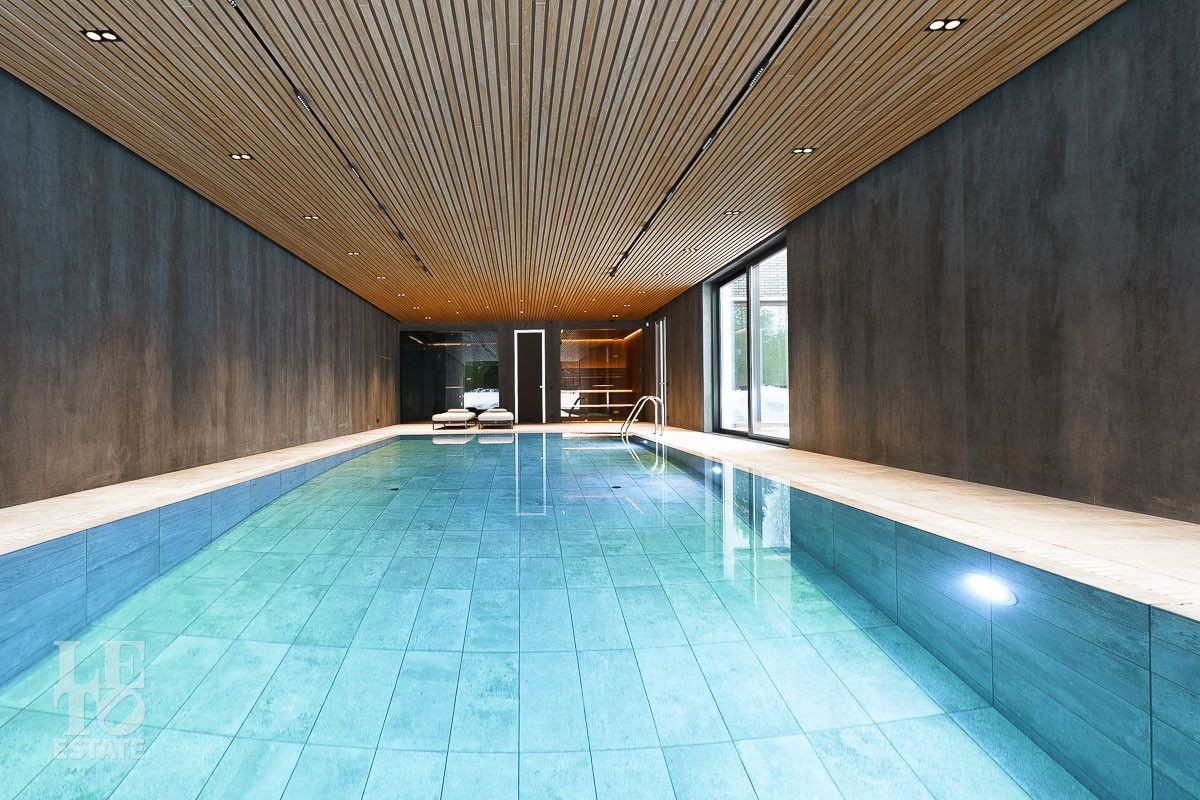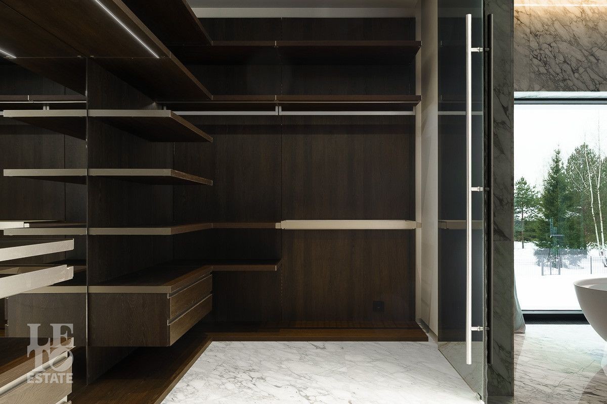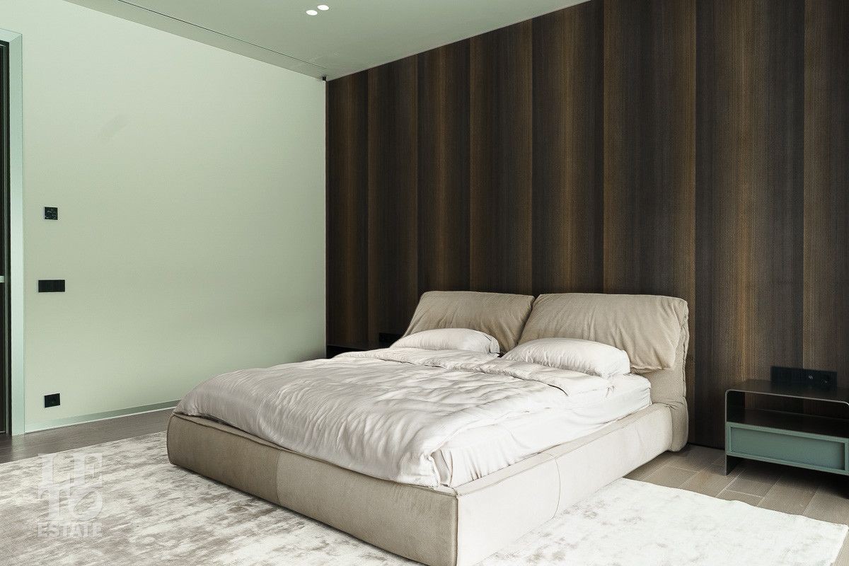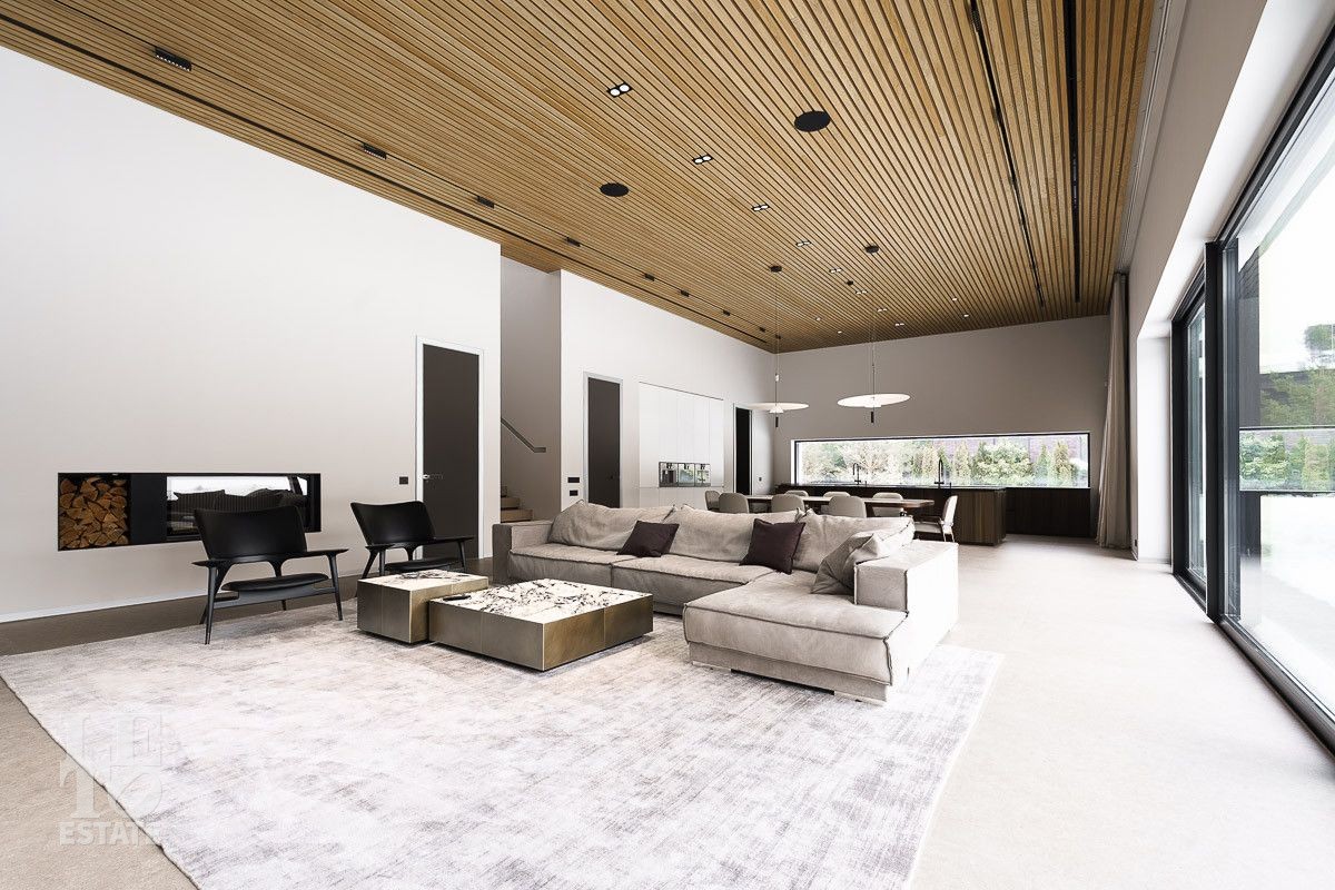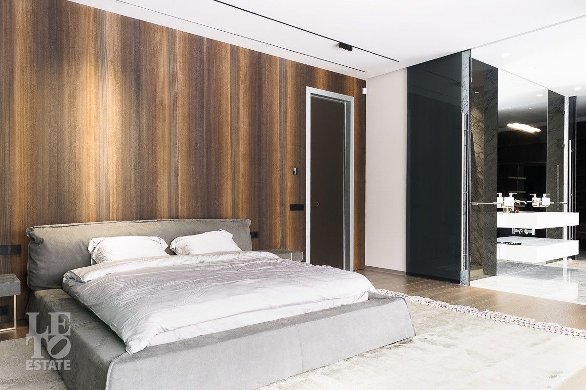 В доме выполнена отделка по индивидуальному проекту, в современном стиле с использованием дорогих, качественных материалов. Благодаря высоким потолкам и большим окнам в пол пространство наполнено воздухом и светом. Эксклюзивные дизайнерские решения придают уникальность внутреннему пространству дома. Из всех окон открывается потрясающий вид на участок. Гараж идеально интегрирован в архитектурный контур здания.