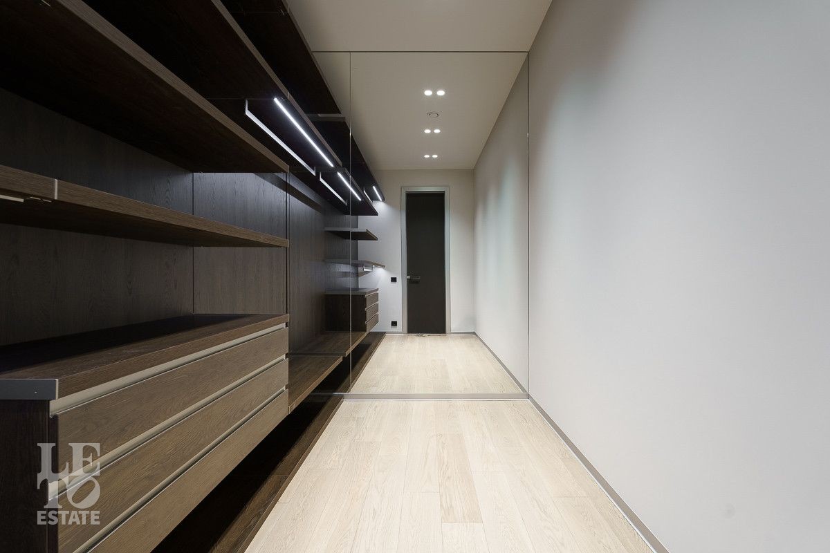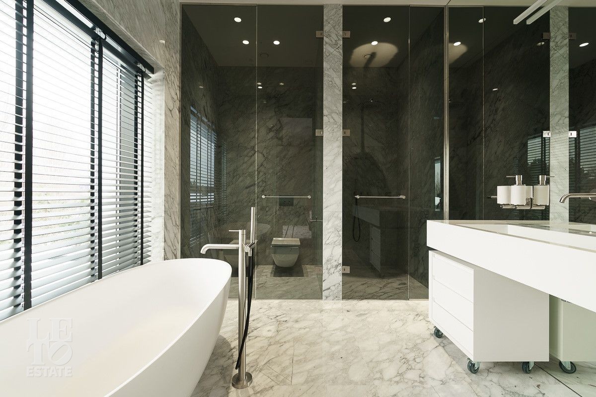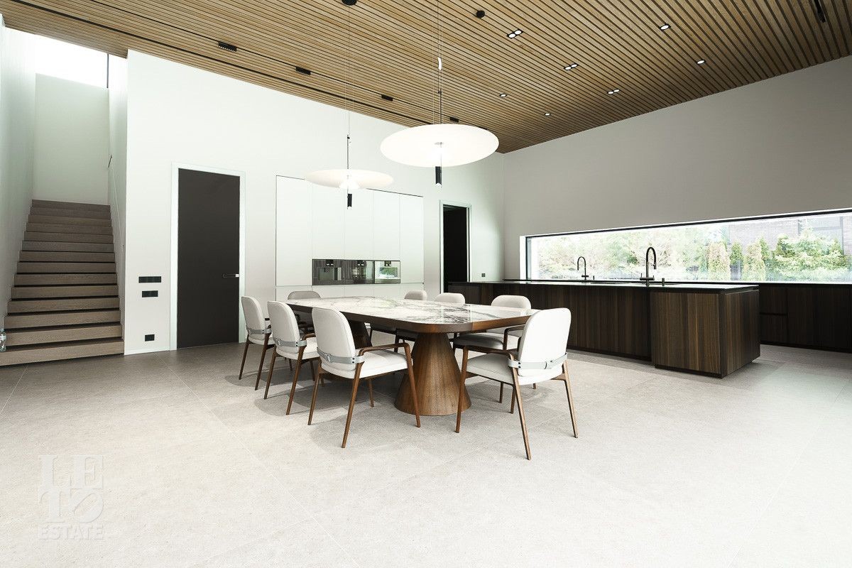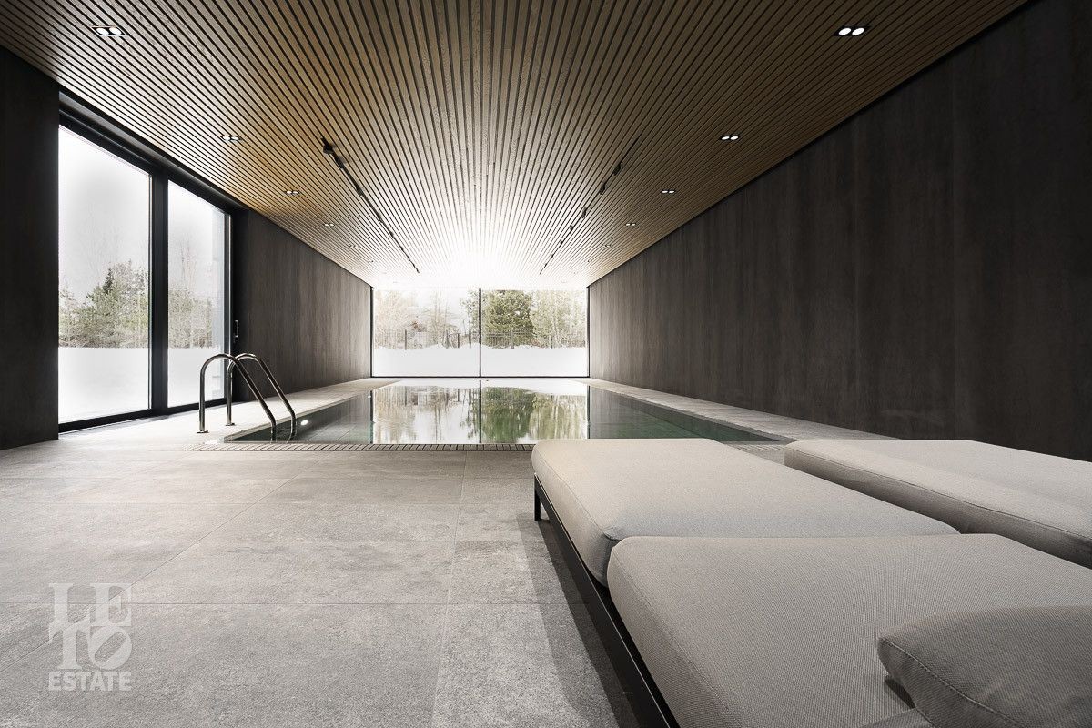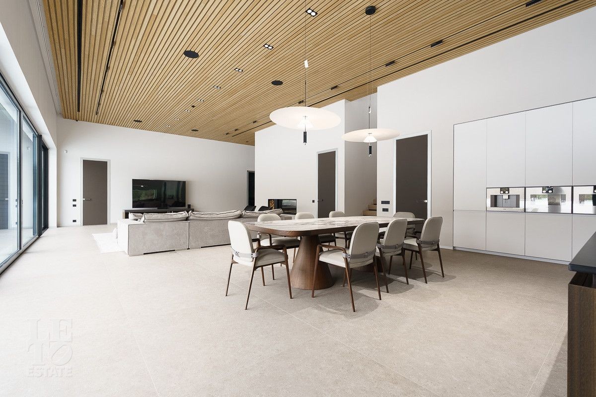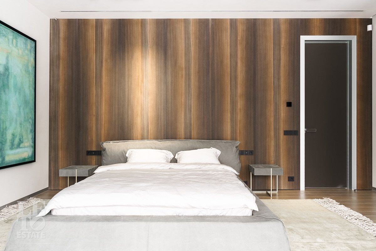 В доме выполнена отделка по индивидуальному проекту, в современном стиле с использованием дорогих, качественных материалов. Благодаря высоким потолкам и большим окнам в пол пространство наполнено воздухом и светом. Эксклюзивные дизайнерские решения придают уникальность внутреннему пространству дома. Из всех окон открывается потрясающий вид на участок. Гараж идеально интегрирован в архитектурный контур здания.
