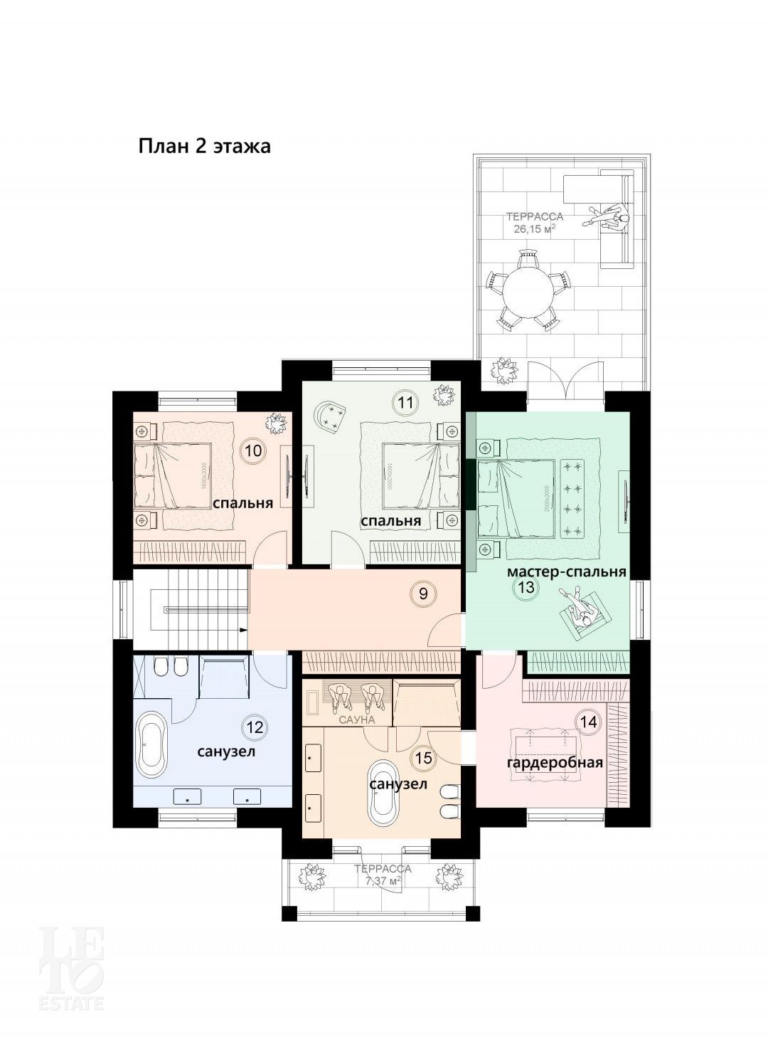 Второй этаж – две спальни, мастер-спальня с террасой, санузел.