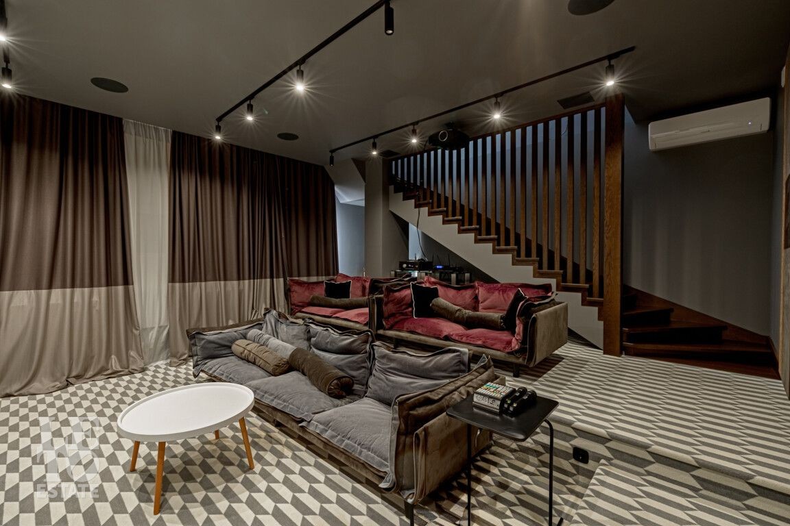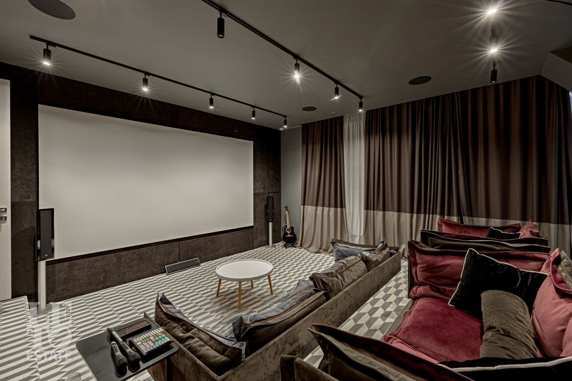 Первый этаж: холл, гостиная с выходом на террасу, столовая, кухня, спальня с санузлом, кинотеатр с лестницей на второй этаж (которая ведет в кабинет), гостевой санузел с зоной постирочной, гардеробная, котельная;