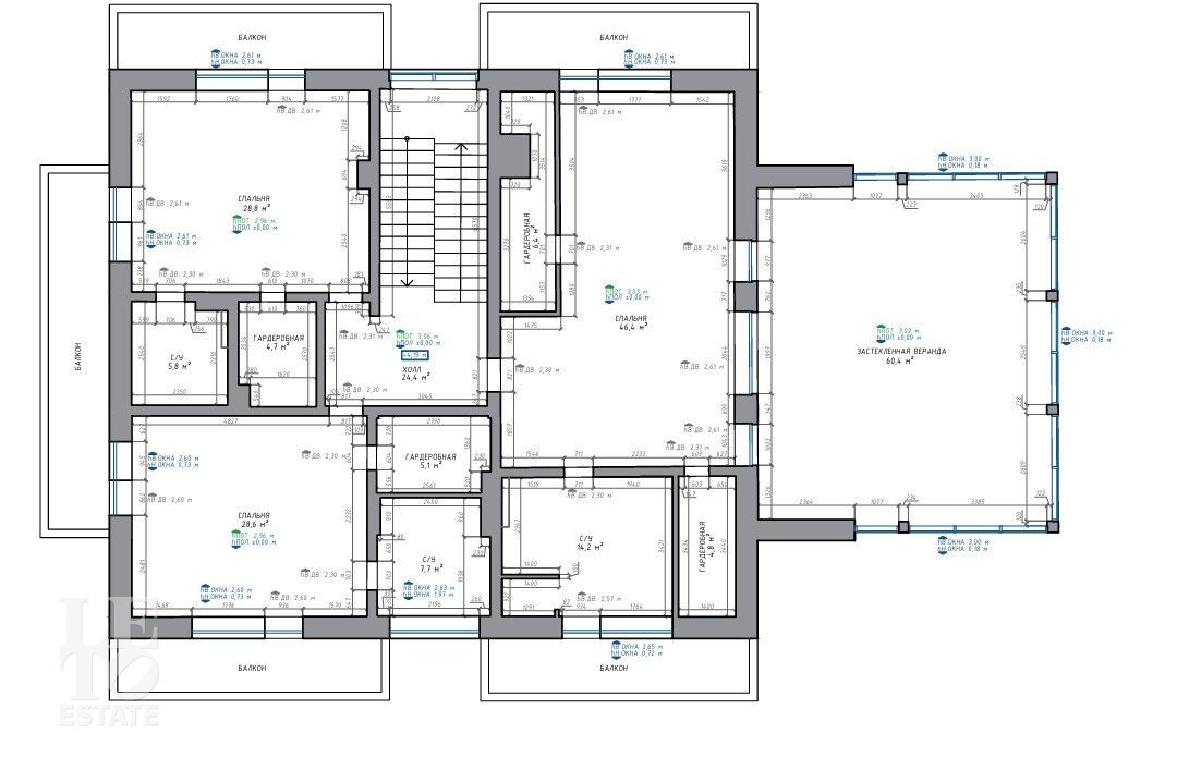 Второй этаж: две спальни каждая с ванной комнатой и гардеробом, мастер спальня с двумя гардеробными, ванной комнатой и террасой.