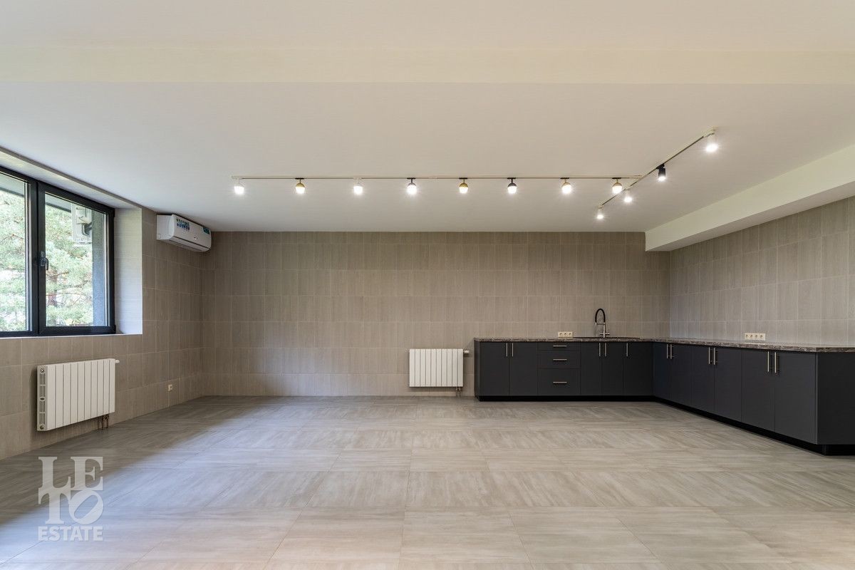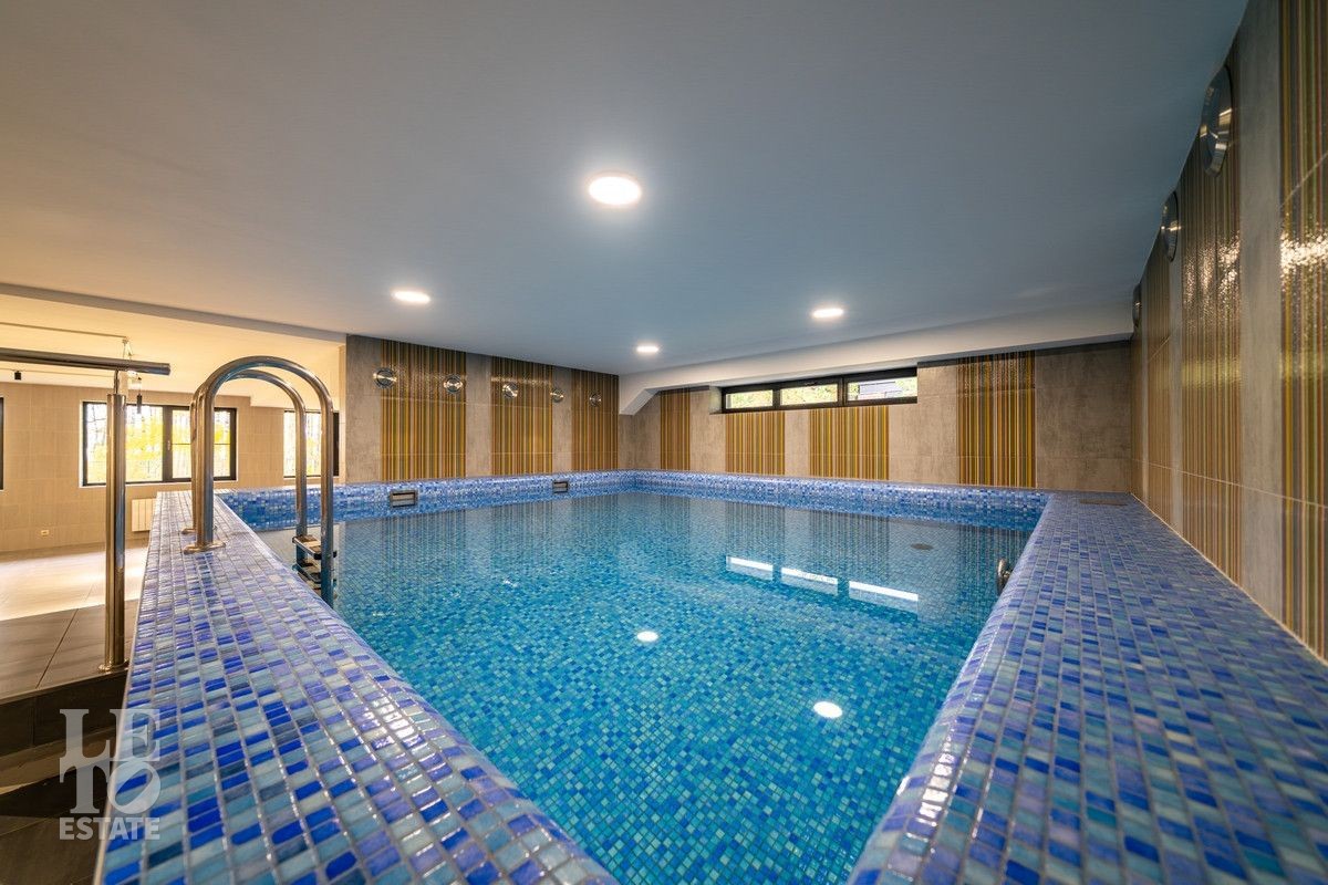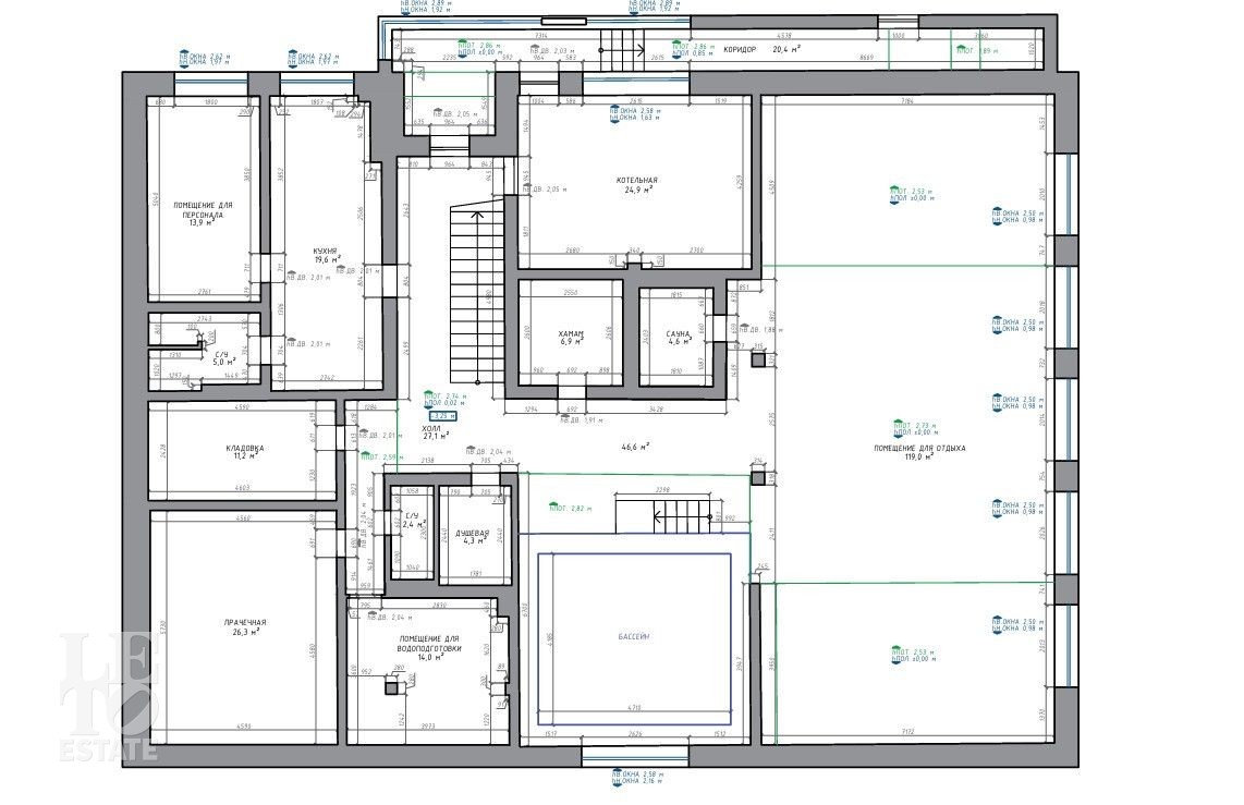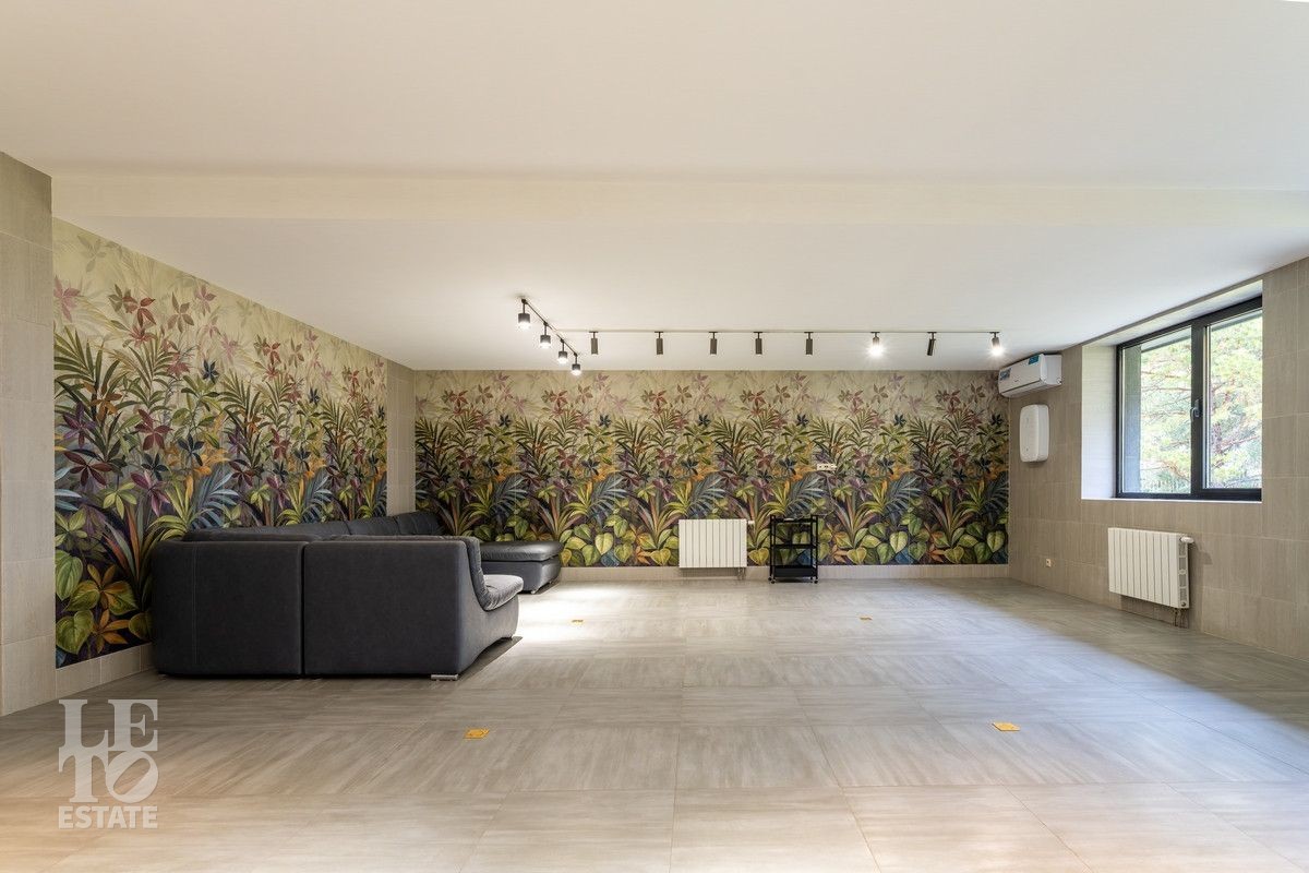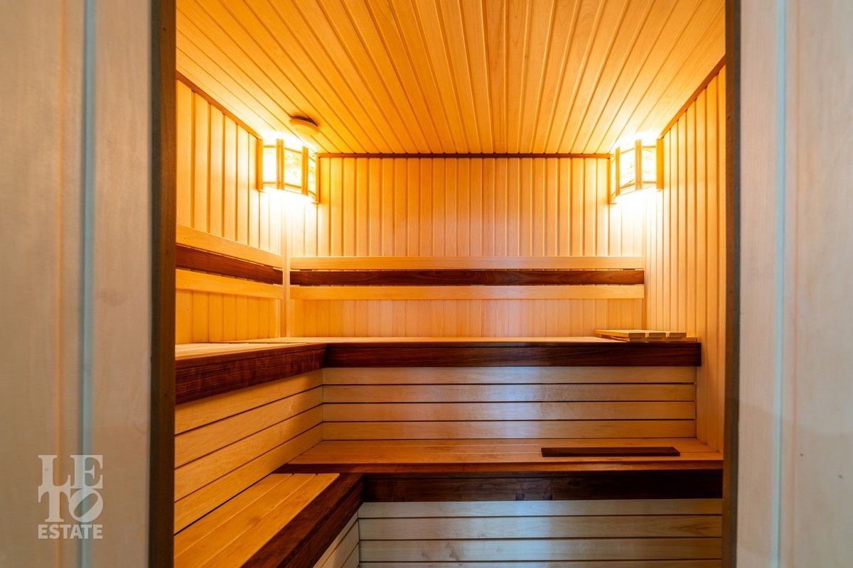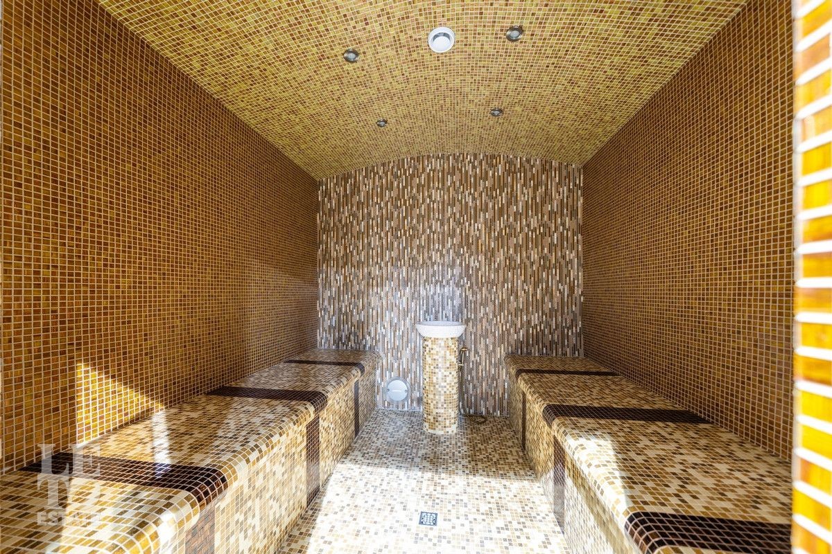 Цокольный этаж: зона отдыха с кухней, бассейн, сауна, хамам, душевая, санузел, котельная, постирочная, подсобные помещения, квартира для персонала с отдельным входом;