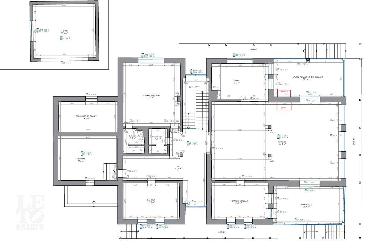 Первый этаж: прихожая, гардеробная, санузел, кабинет, спальня с санузлом, гостиная-столовая, кухня с выходом на террасу с барбекю зоной, комната отдыха;