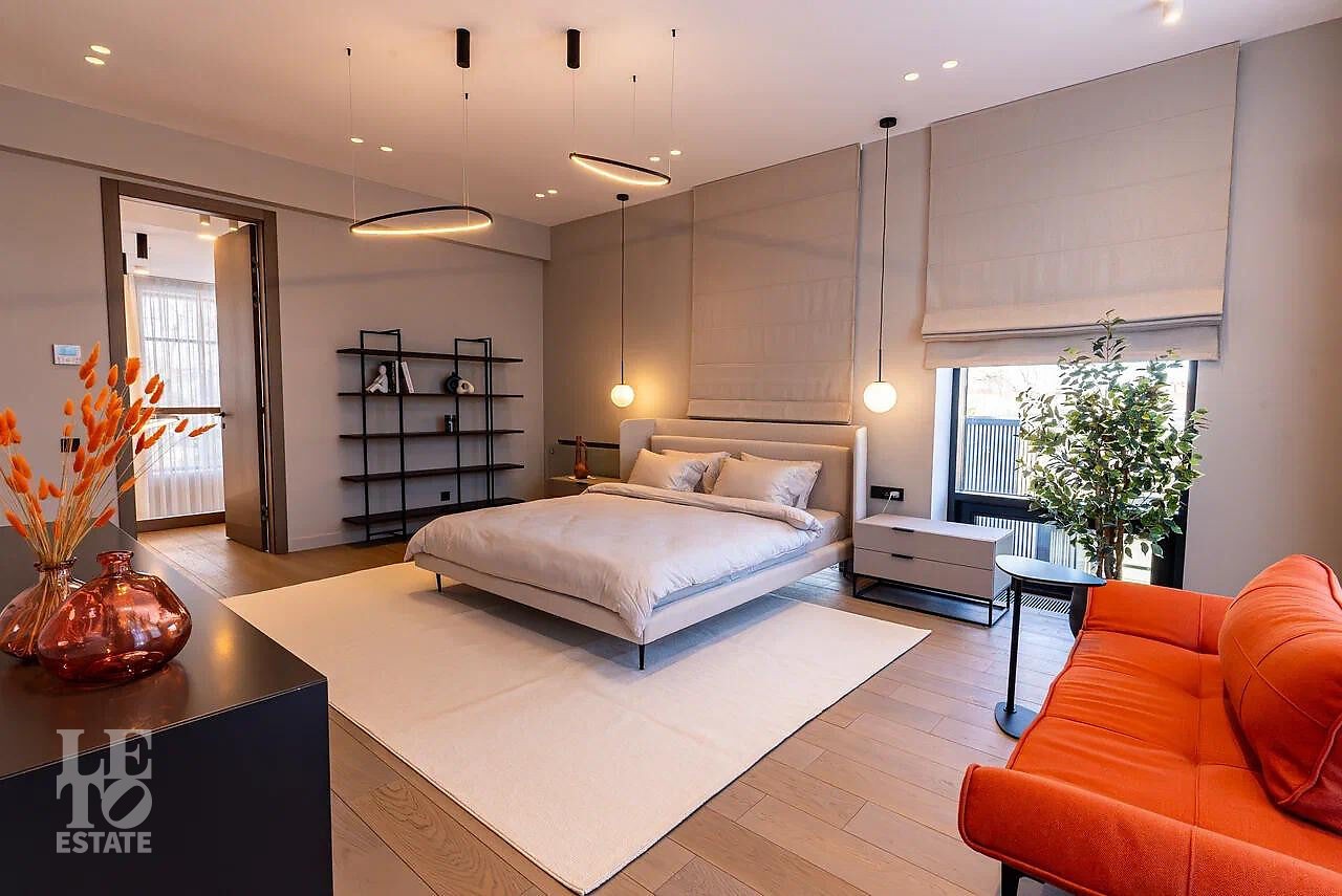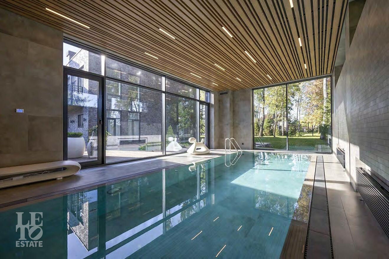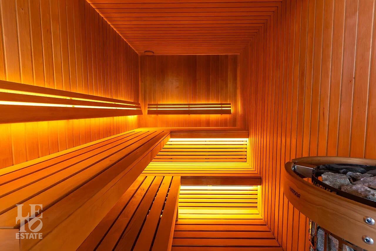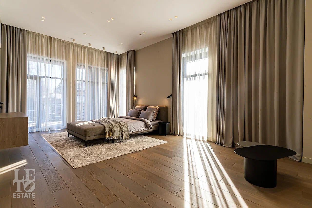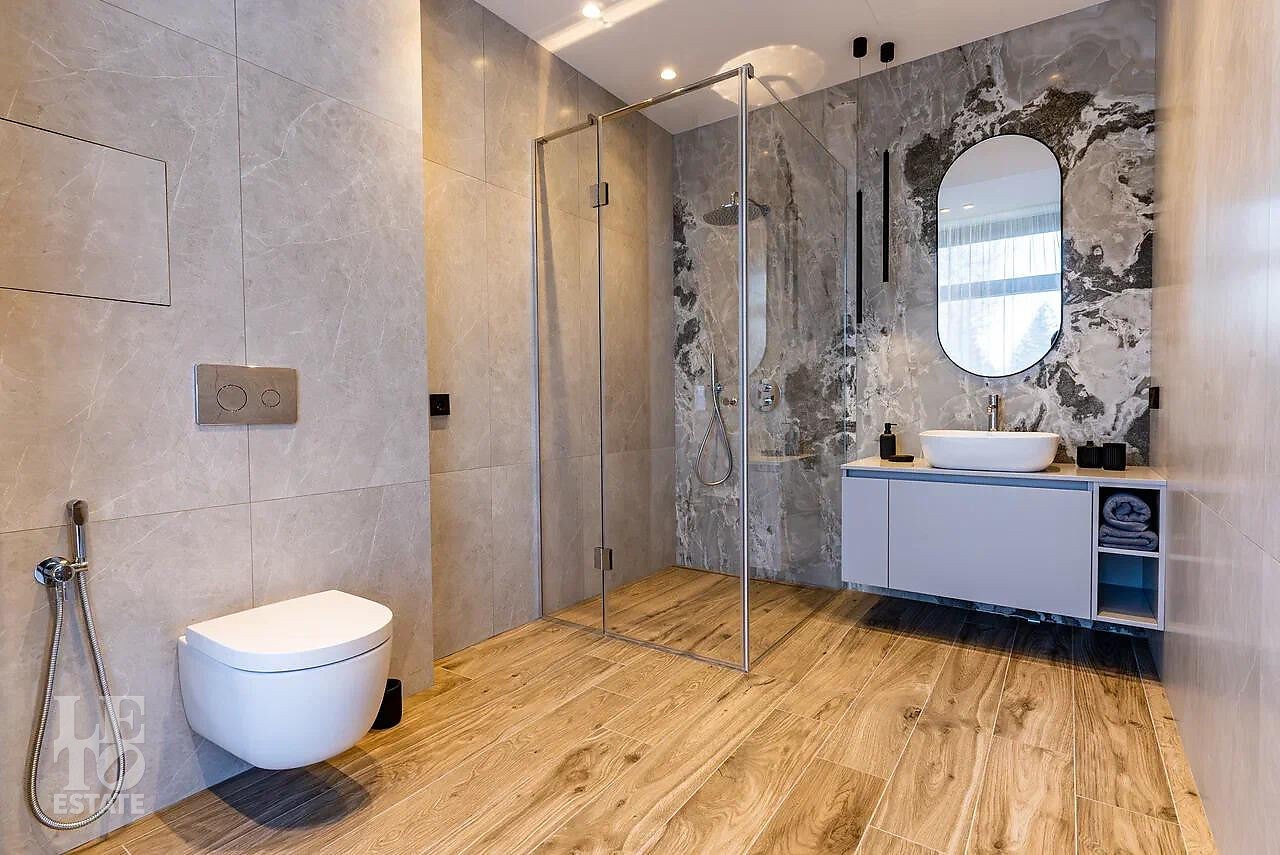 У дома эксплуатируемая кровля, он построен в современном стиле из кирпича в 2025 году. На первом этаже смонтирован теплый водяной пол, а на втором этаже – в санузлах. Внутренняя отделка стен произведена с использованием декоративных панелей, натурального камня (оникс), на полу – крупноформатная керамическая плитка, в спальнях и холле второго этажа уложена паркетная доска. В доме обустроена зона спа с бассейном и сауной (130 кв.м.), из которой предусмотрен выход на террасу и эксплуатируемую кровлю.