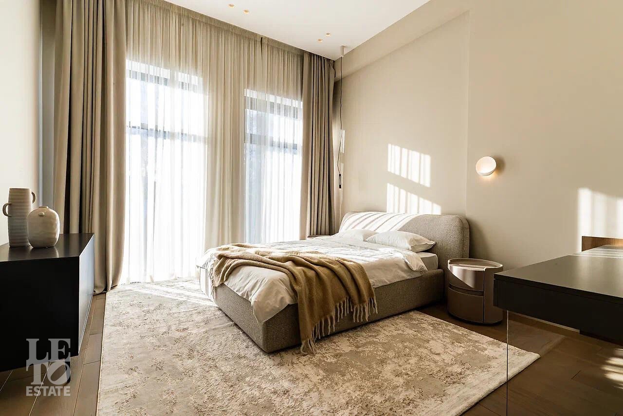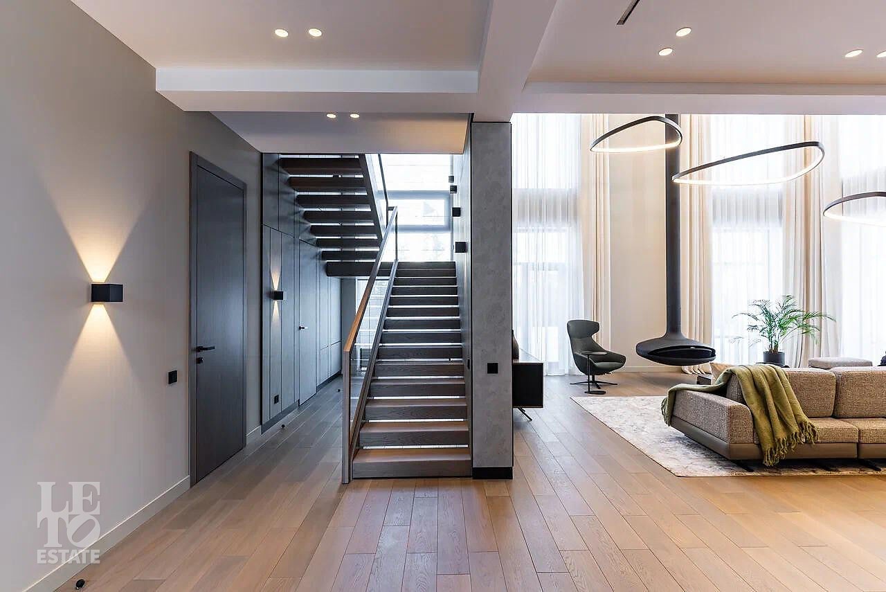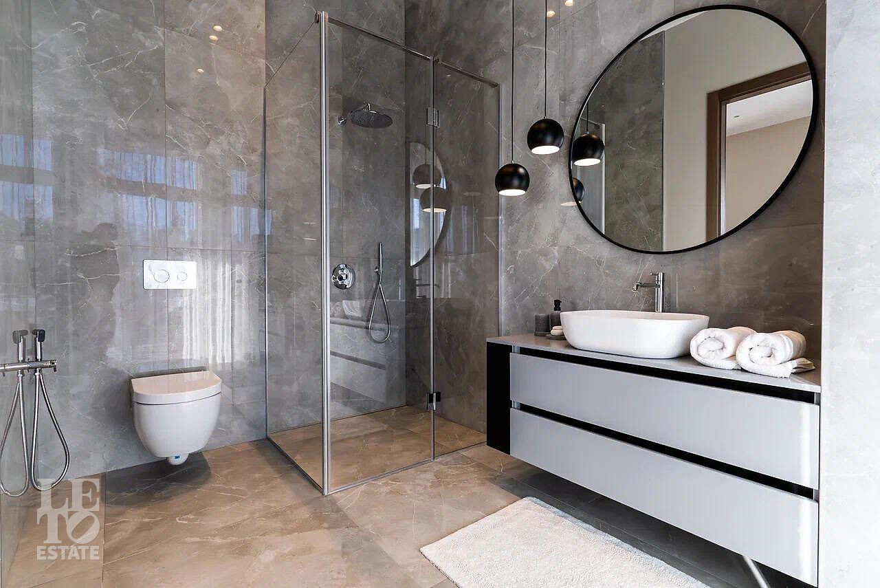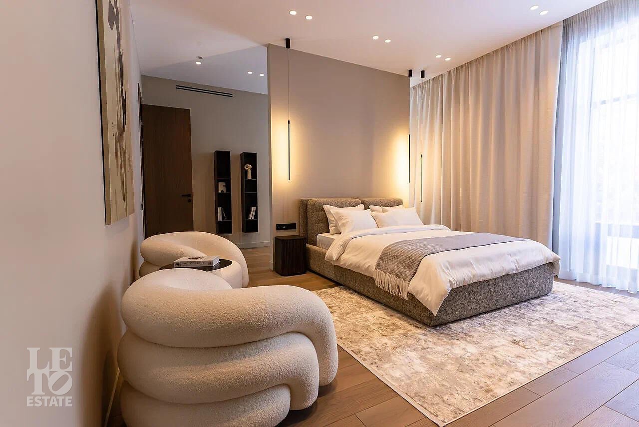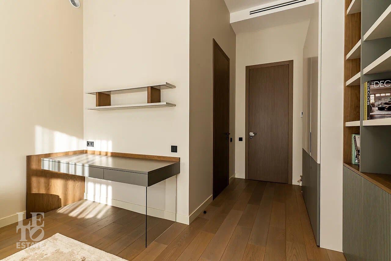У дома эксплуатируемая кровля, он построен в современном стиле из кирпича в 2025 году. На первом этаже смонтирован теплый водяной пол, а на втором этаже – в санузлах. Внутренняя отделка стен произведена с использованием декоративных панелей, натурального камня (оникс), на полу – крупноформатная керамическая плитка, в спальнях и холле второго этажа уложена паркетная доска. В доме обустроена зона спа с бассейном и сауной (130 кв.м.), из которой предусмотрен выход на террасу и эксплуатируемую кровлю.