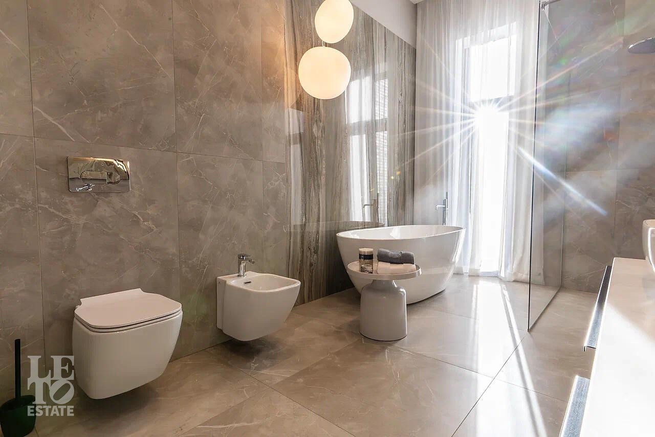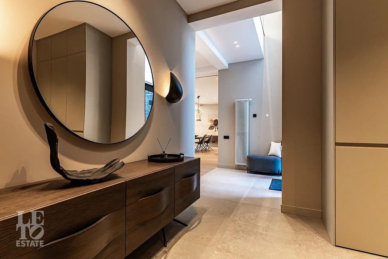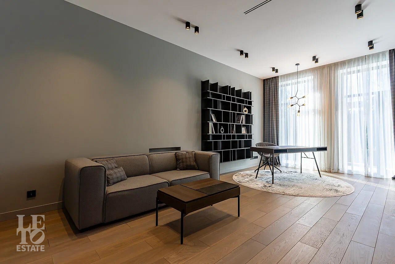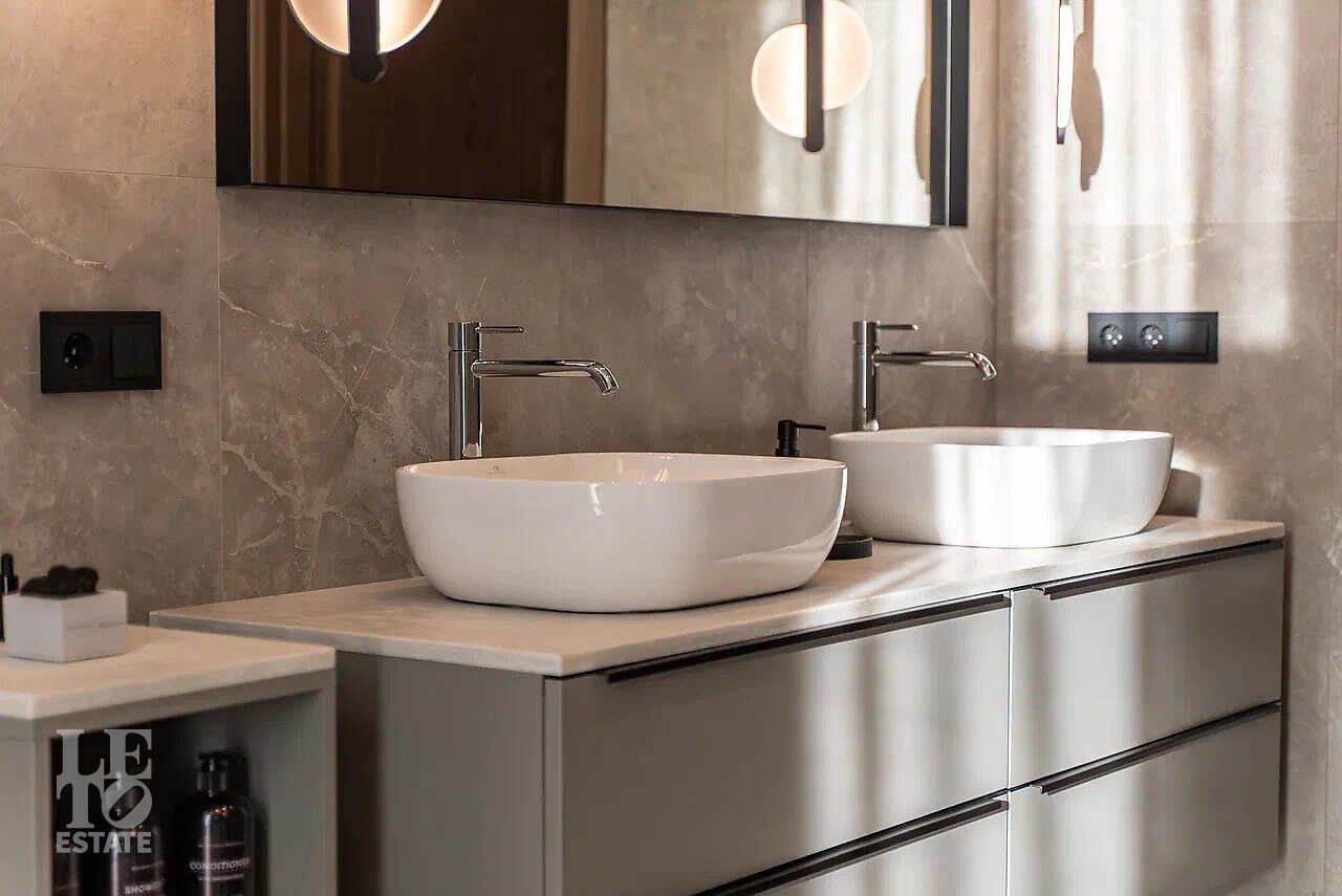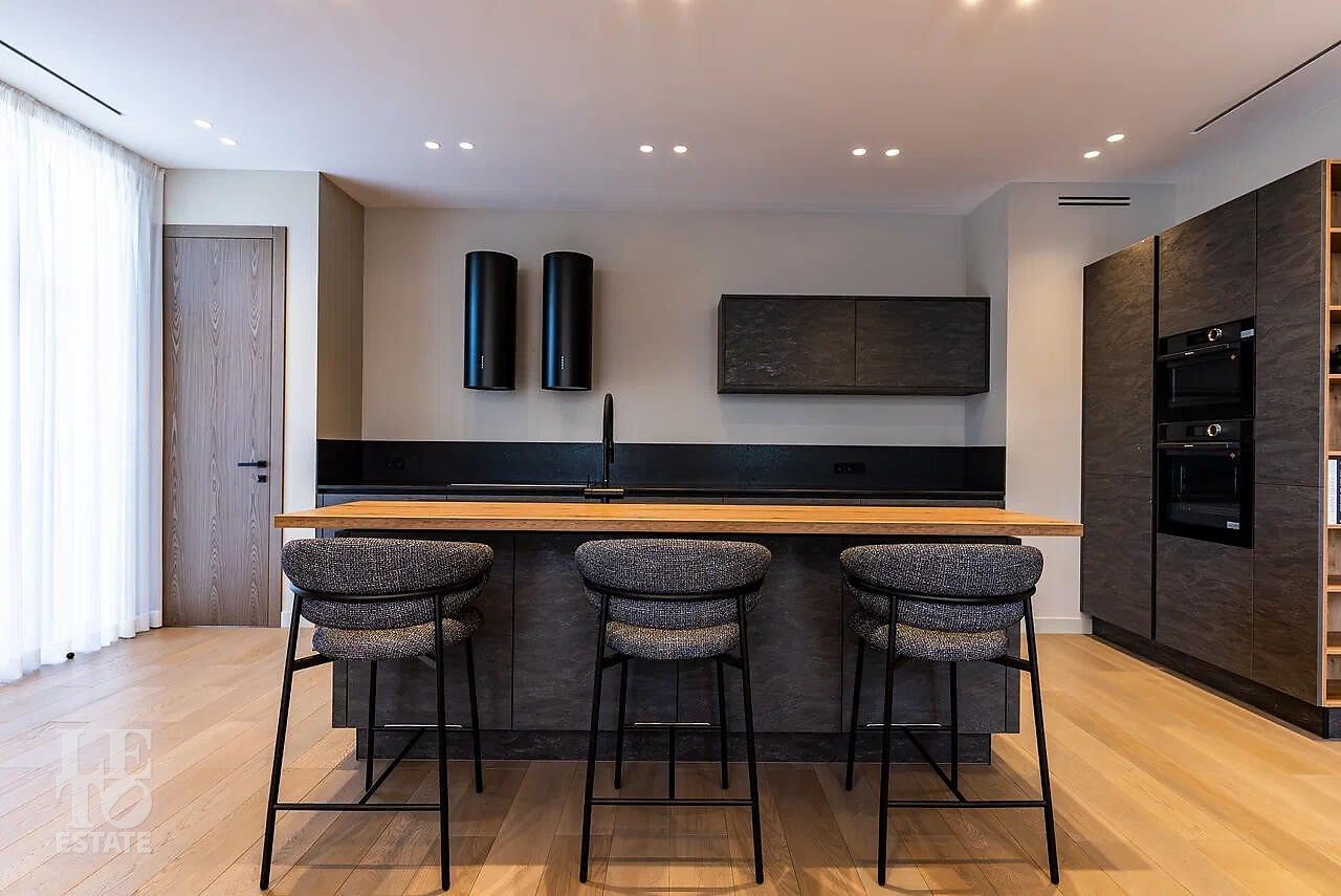 У дома эксплуатируемая кровля, он построен в современном стиле из кирпича в 2025 году. На первом этаже смонтирован теплый водяной пол, а на втором этаже – в санузлах. Внутренняя отделка стен произведена с использованием декоративных панелей, натурального камня (оникс), на полу – крупноформатная керамическая плитка, в спальнях и холле второго этажа уложена паркетная доска. В доме обустроена зона спа с бассейном и сауной (130 кв.м.), из которой предусмотрен выход на террасу и эксплуатируемую кровлю.