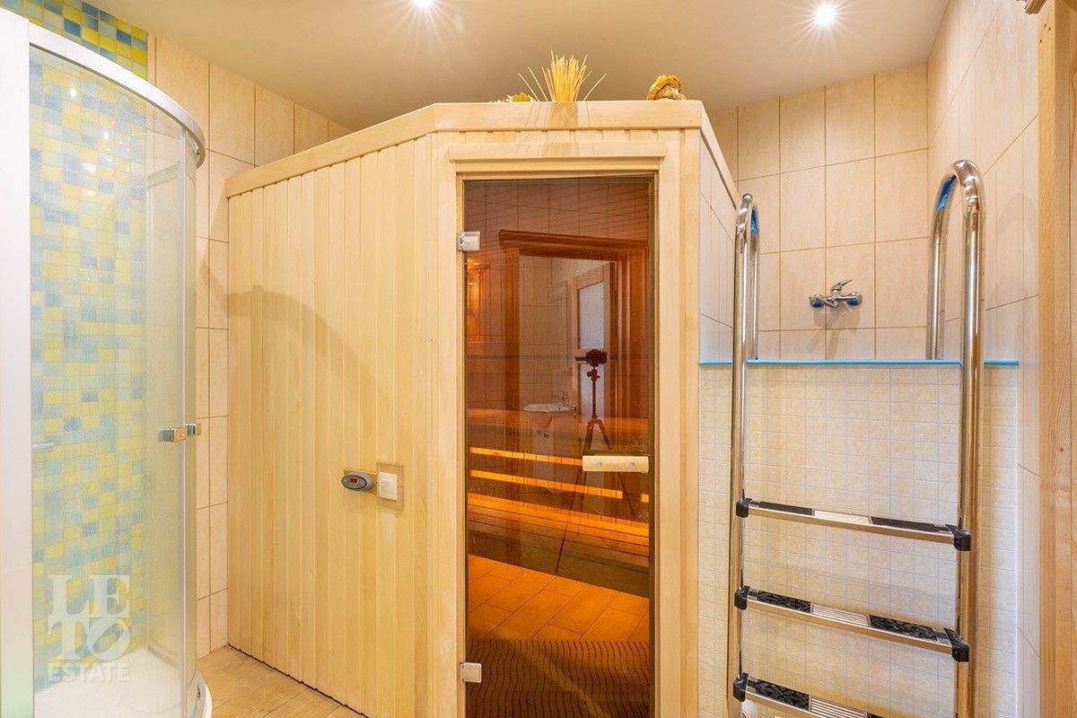 Первый этаж: прихожая, кухня, гостиная-каминная с выходом на веранду, санузел/котельная, душевая с сауной и купелью.
