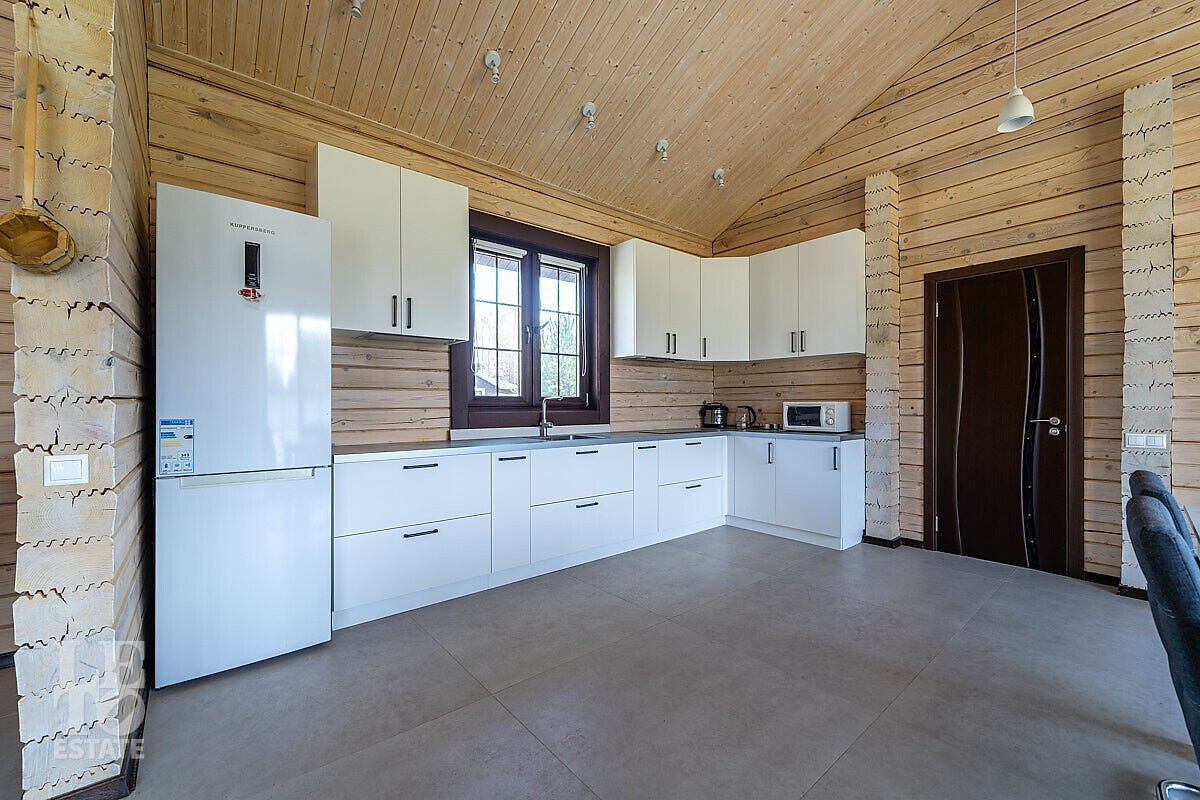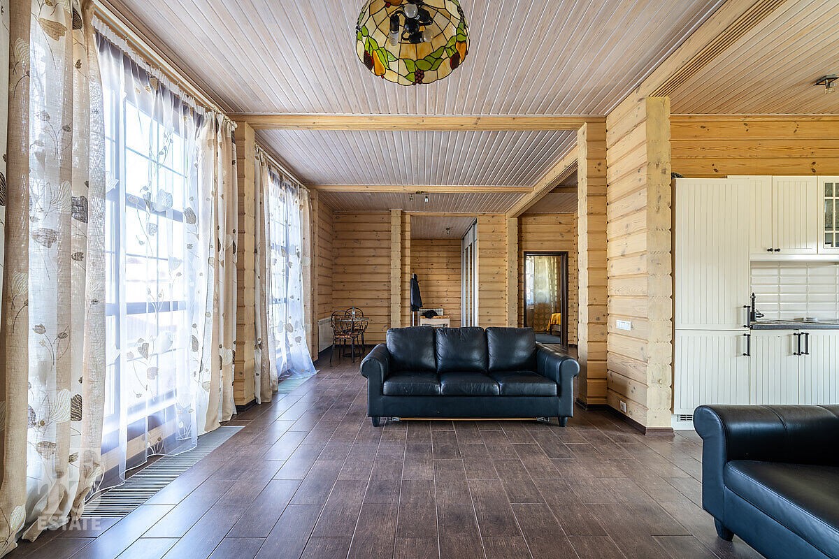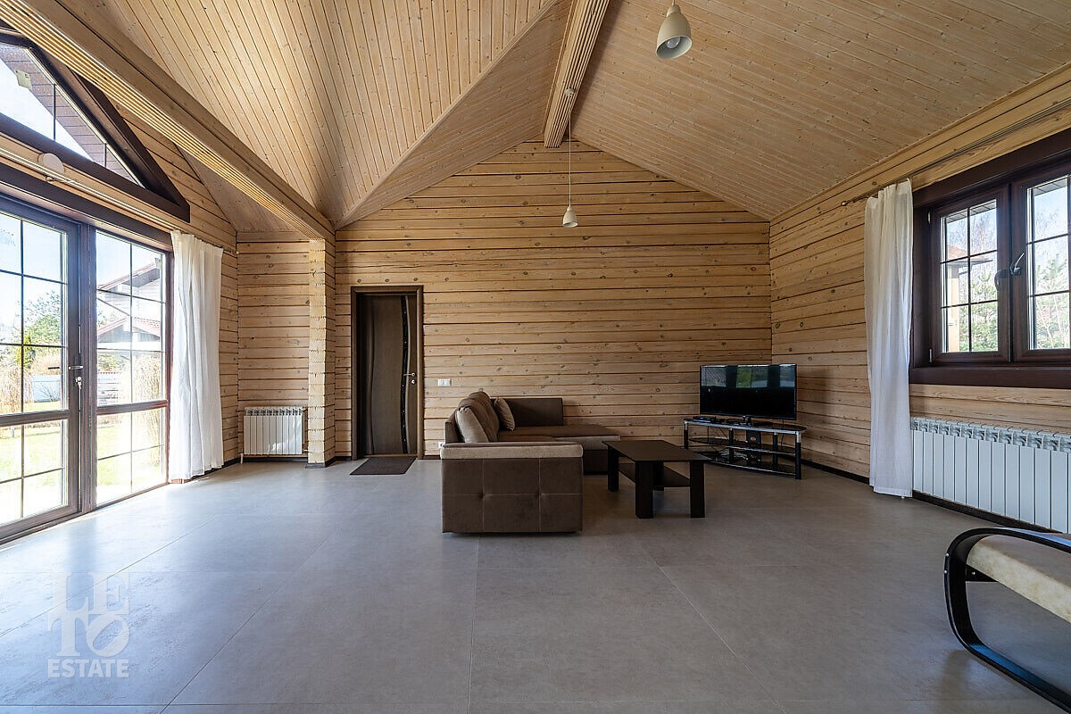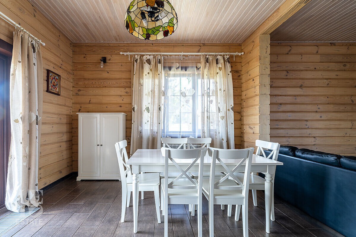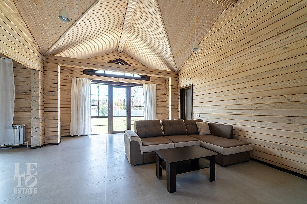 Загородный дом построен из экологичного клееного бруса. Внутренняя отделка и наполнение интерьера выполнены в минималистичном стиле с использованием спокойных цветовых гамм, создающих атмосферу умиротворения и отдыха. На первом этаже расположена спальня с двухспальной кроватью, напротив находится отдельный санузел — все продумано для комфорта гостей. Просторная гостиная совмещена с зоной кухни, причем предусмотрен удобный выход на террасу, где приятно завтракать с видом на благоустроенный участок или устраивать вечерние чаепития. Рядом с домом из плитки вымощена большая парковочная зона вместимостью более шести автомобилей — этого достаточно для большой компании или нескольких семей.