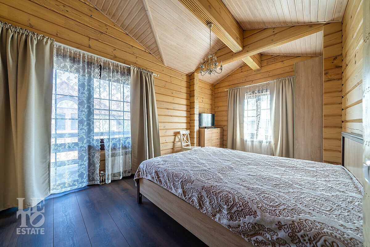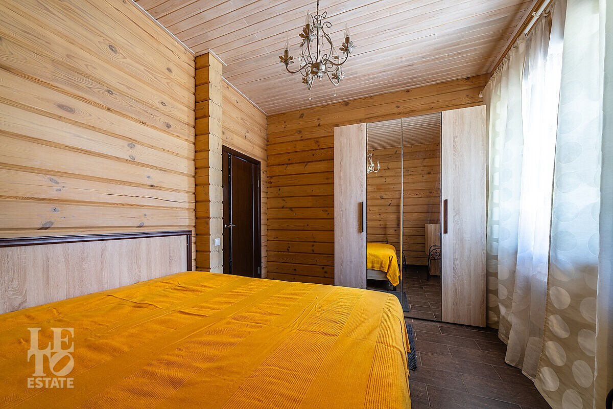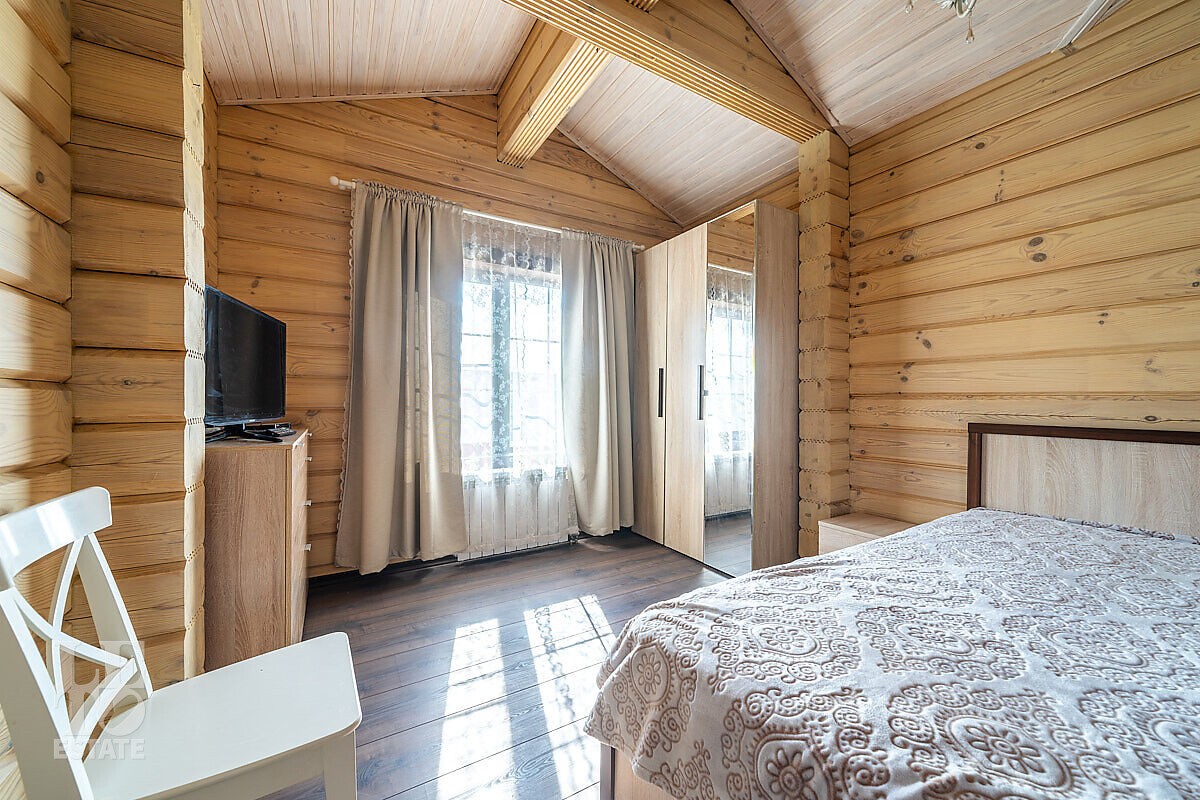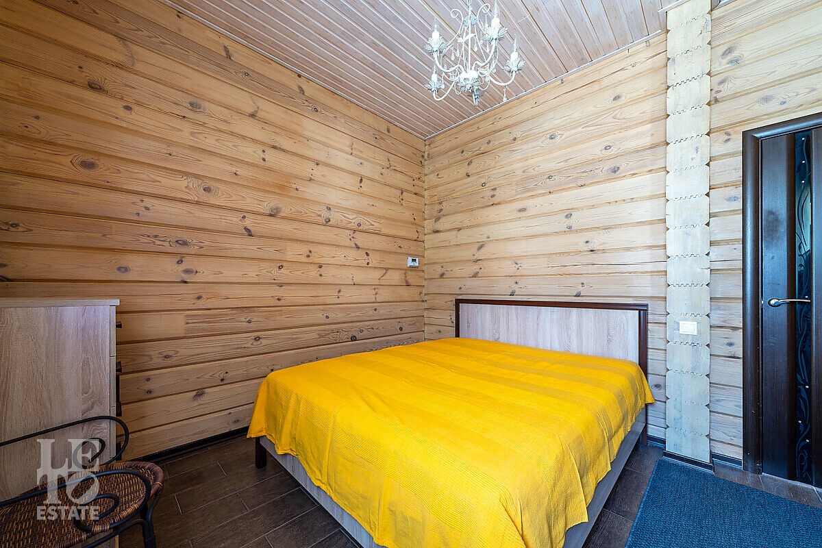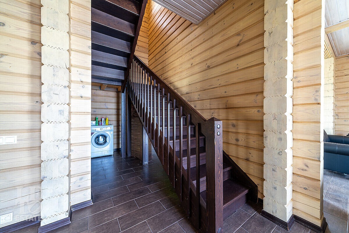 Загородный дом построен из экологичного клееного бруса. Внутренняя отделка и наполнение интерьера выполнены в минималистичном стиле с использованием спокойных цветовых гамм, создающих атмосферу умиротворения и отдыха. На первом этаже расположена спальня с двухспальной кроватью, напротив находится отдельный санузел — все продумано для комфорта гостей. Просторная гостиная совмещена с зоной кухни, причем предусмотрен удобный выход на террасу, где приятно завтракать с видом на благоустроенный участок или устраивать вечерние чаепития. Рядом с домом из плитки вымощена большая парковочная зона вместимостью более шести автомобилей — этого достаточно для большой компании или нескольких семей.