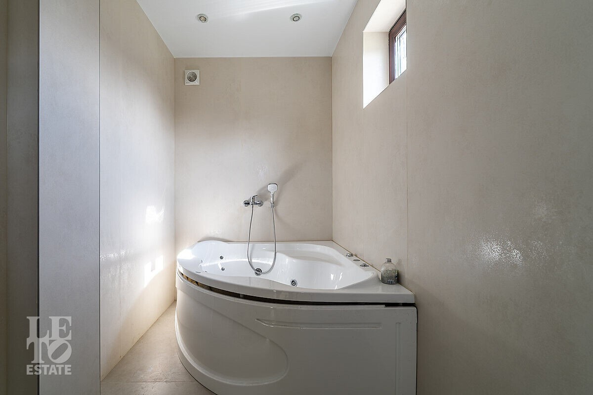 Земельный участок площадью 25 соток полностью благоустроен: выполнен дренаж, организовано уличное освещение, дорожки вымощены тротуарной плиткой, высажены декоративные кустарники. Центральная часть участка остается свободной, что открывает возможности для размещения уличного бассейна, а также организации детской игровой зоны и зоны барбекю.