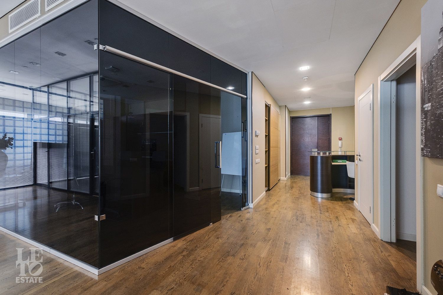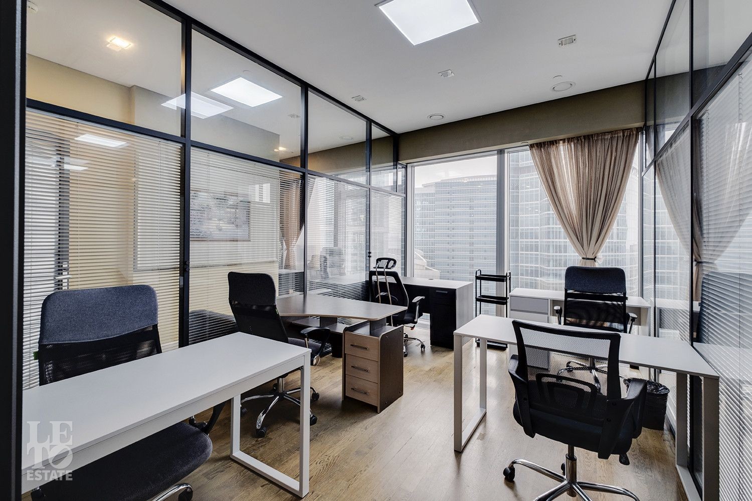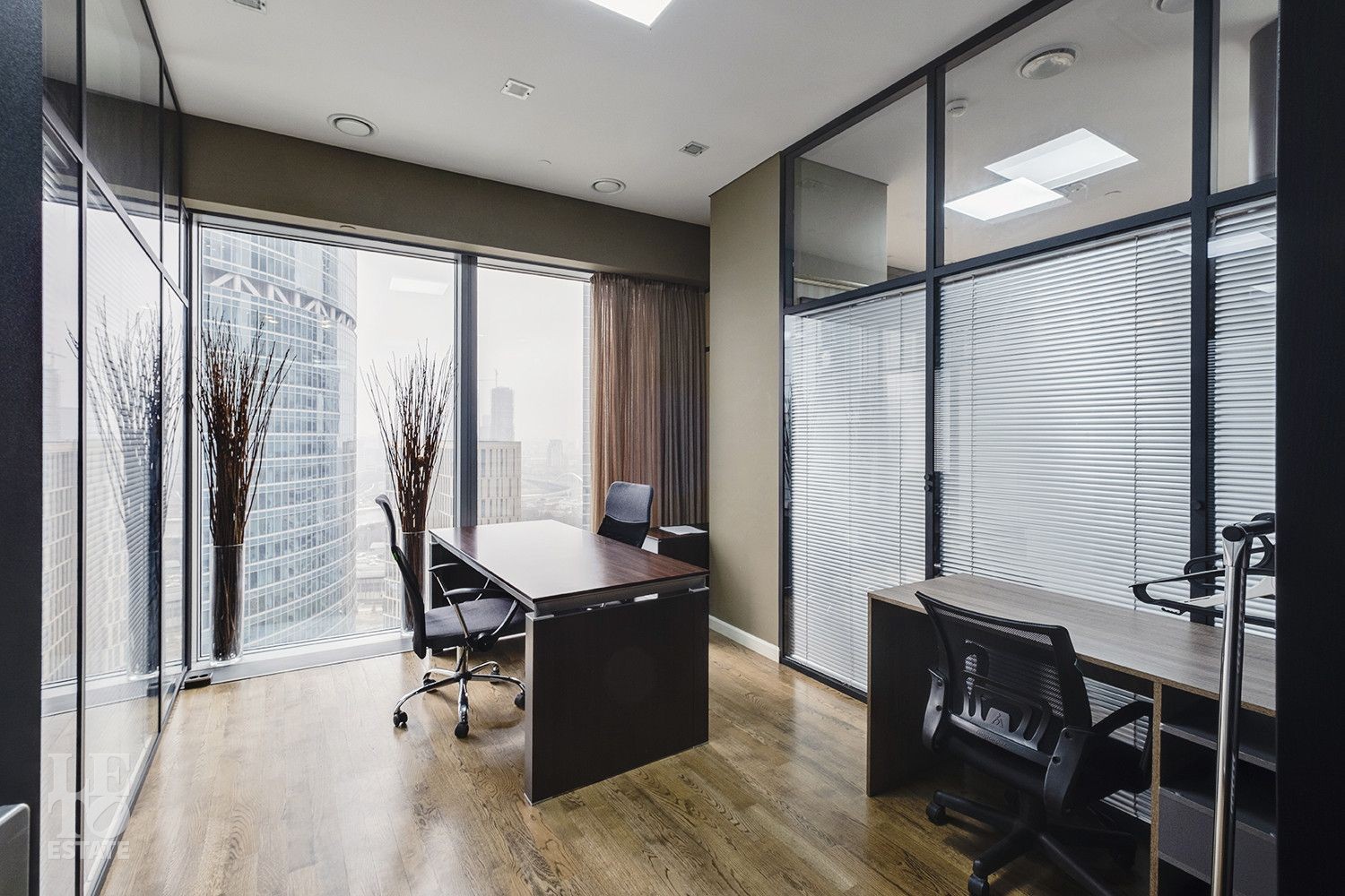 Пространство спроектировано с учётом комфорта и функциональности: восемь кабинетов разного метража, просторная переговорная на 20 кв. м, зона ресепшн, два санузла, в одном из которых расположилась ванная и гостевая зона - создают удобную рабочую атмосферу. Для комфорта сотрудников предусмотрены кофе-поинт, гардеробная и два санузла. Этот объект сочетает в себе продуманную планировку и современный дизайн, обеспечивая комфортные условия для ведения бизнеса, а панорамные окна наполняют пространство естественным светом и открывают впечатляющий вид на деловой центр «Москва-Сити».