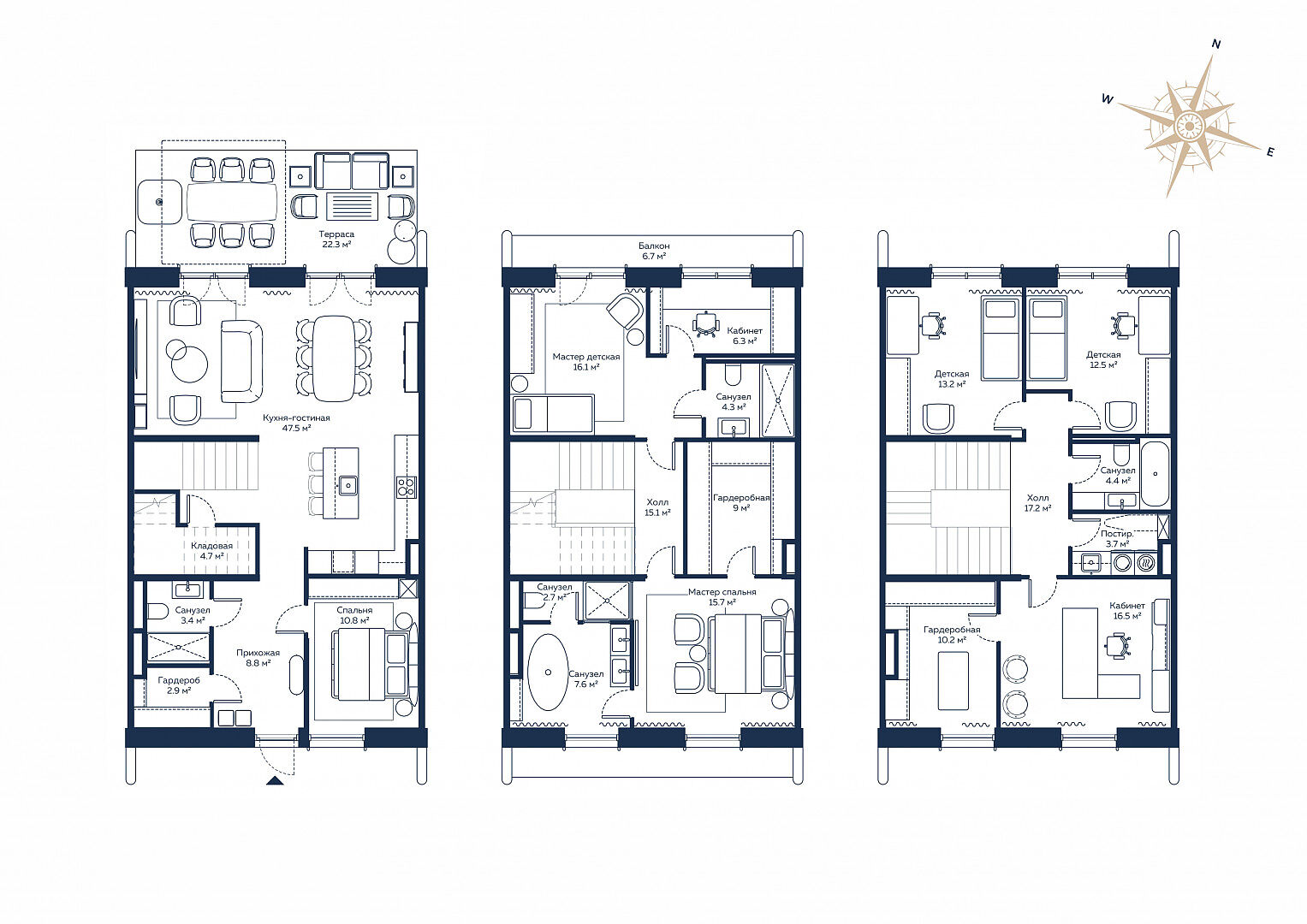 Второй этаж: холл, мастер спальня с гардеробной и ванной комнатой, спальня с гардеробной и санузел с душевой.