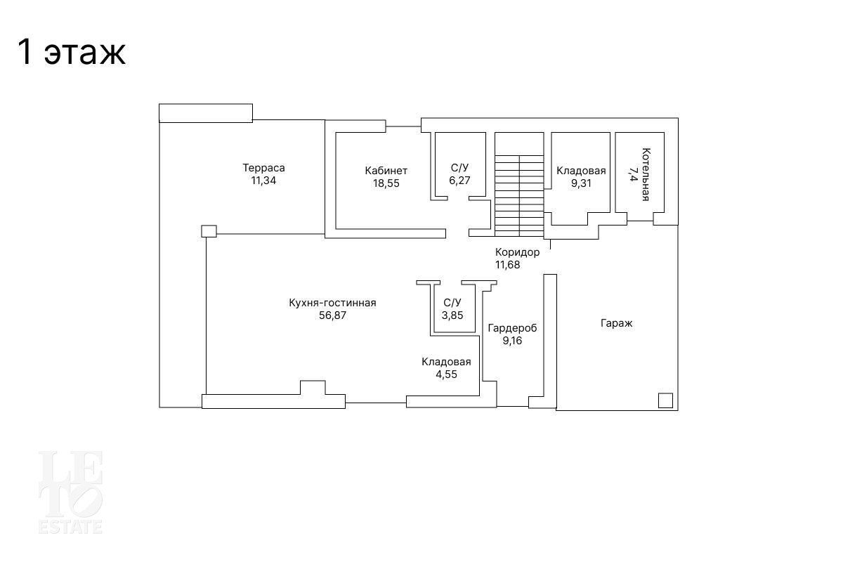 Первый этаж: гардероб, санузел, кухня-гостиная, кладовая, кабинет с санузлом, гараж с кладовой и котельной, терраса;