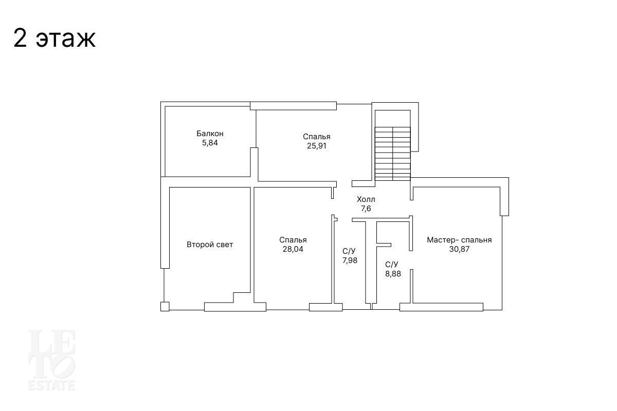 Второй этаж: мастер-спальня с санузлом, спальня с балконом, спальня, санузел.