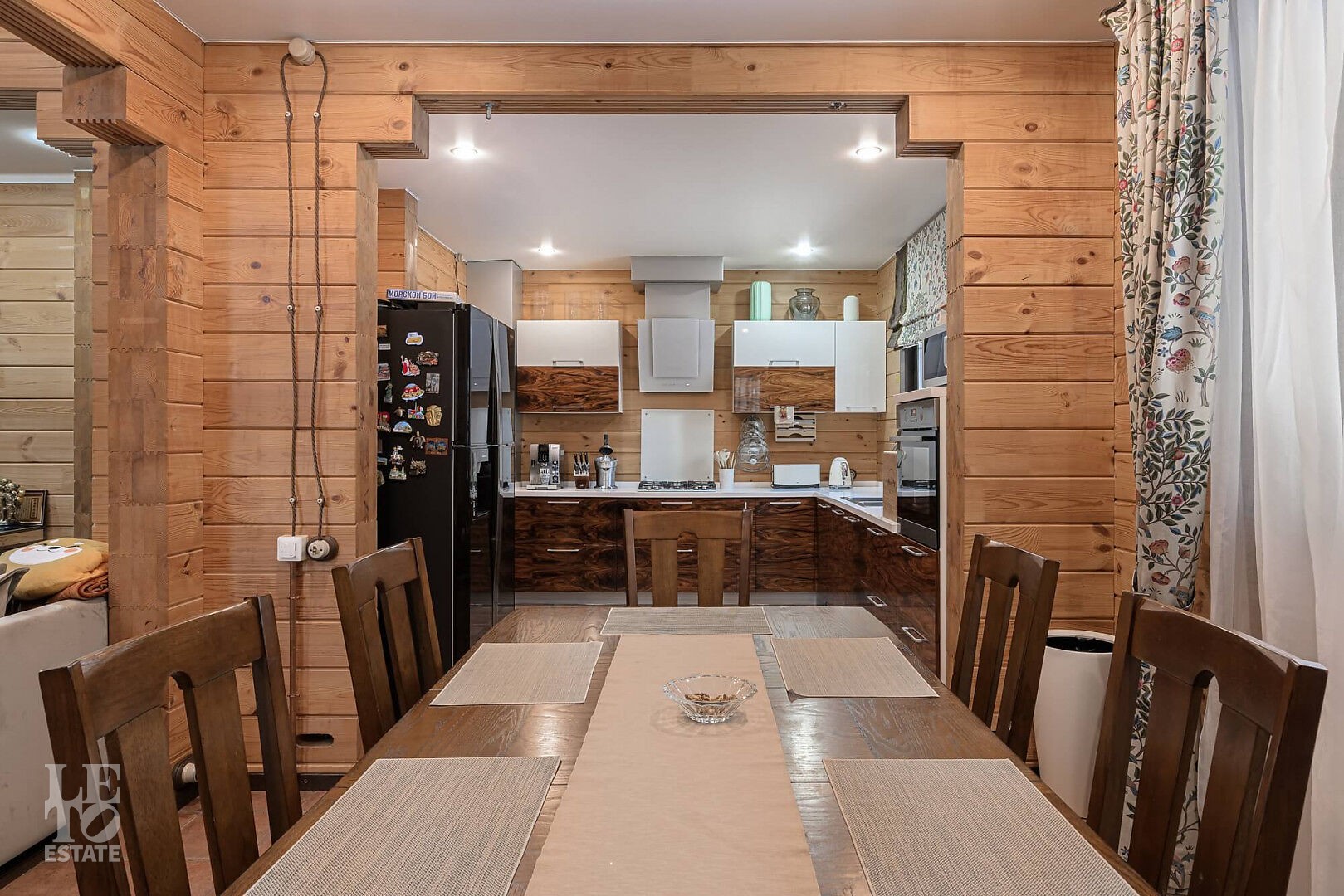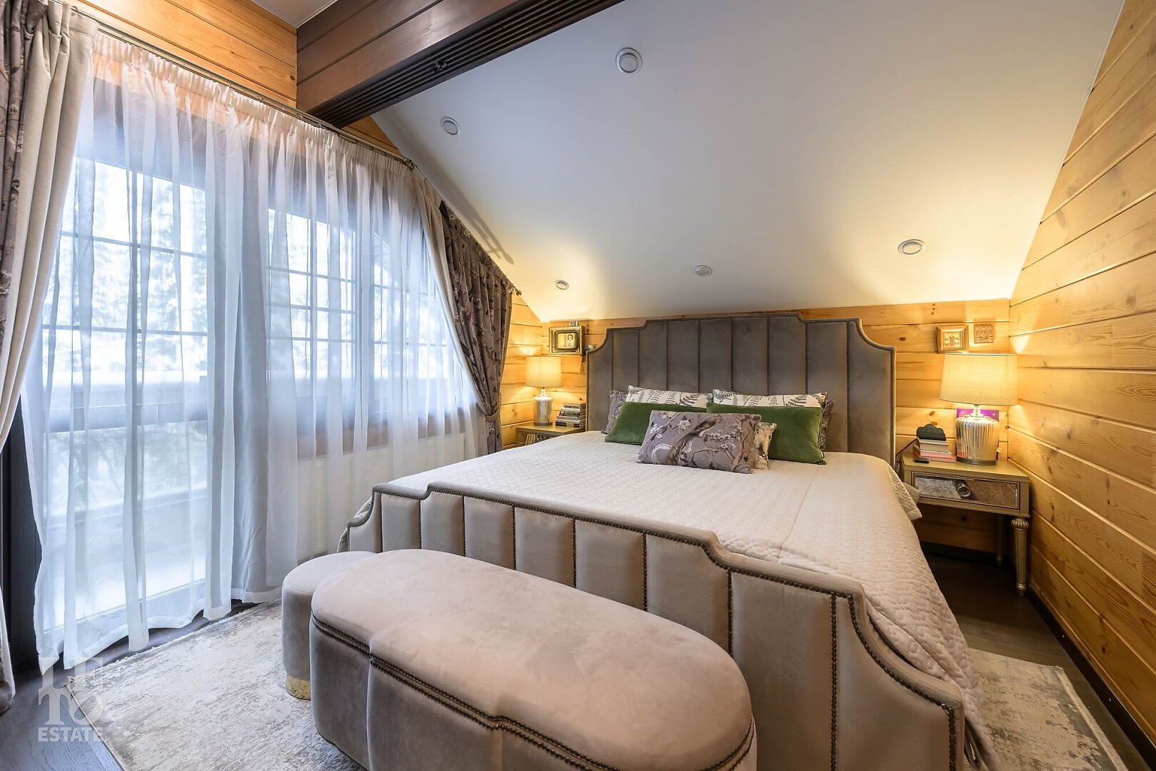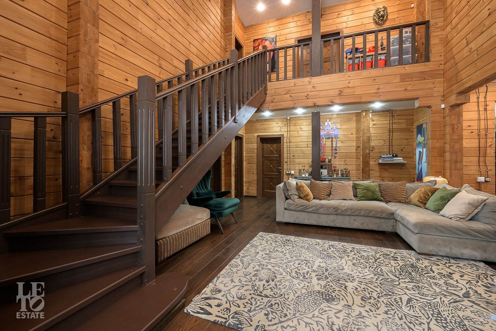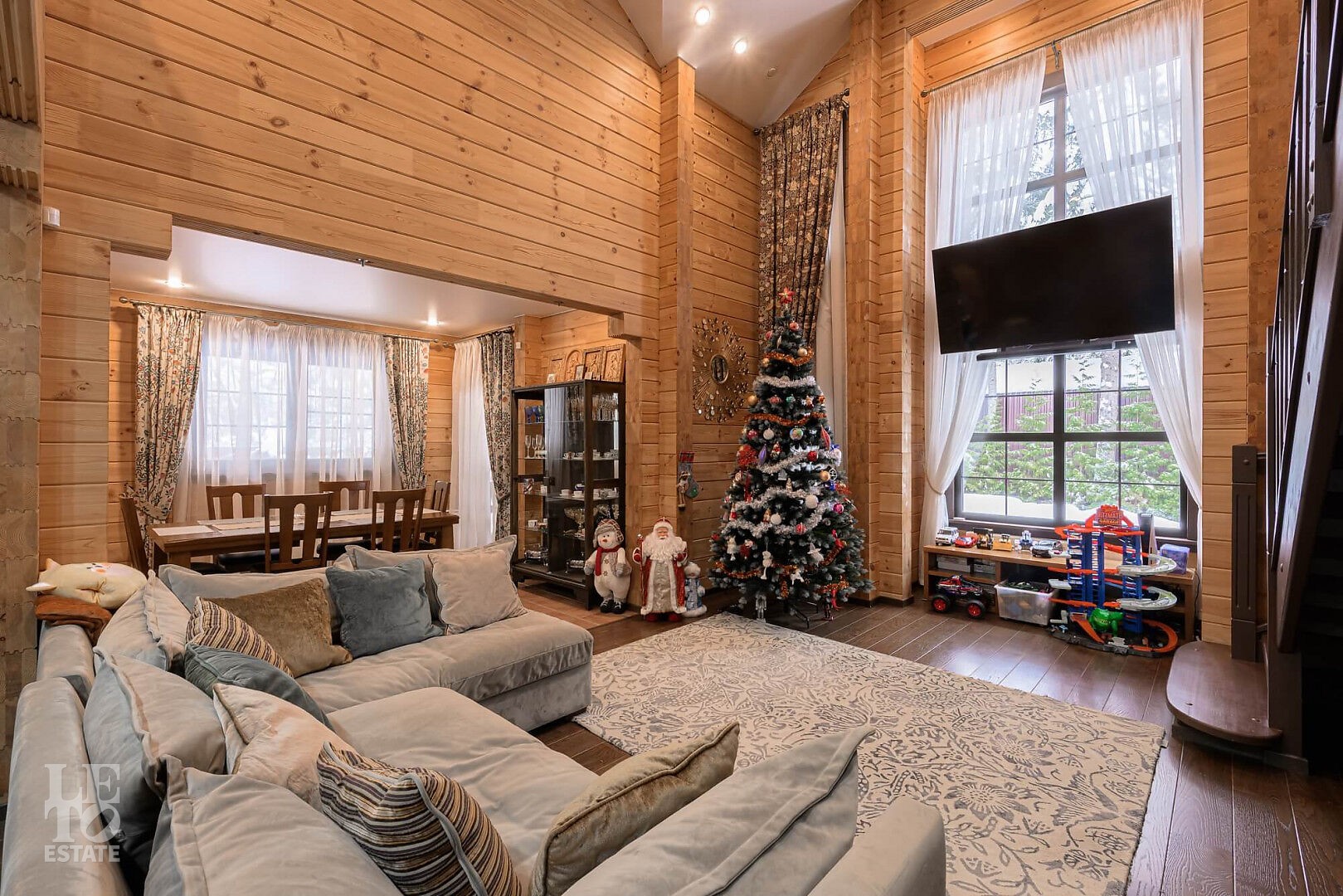 Особенности: просторная двусветная гостиная, английский текстиль (шторы и ковры – Morris), “молодильный” чан на дровах рядом с баней, большой лесной участок, батут.