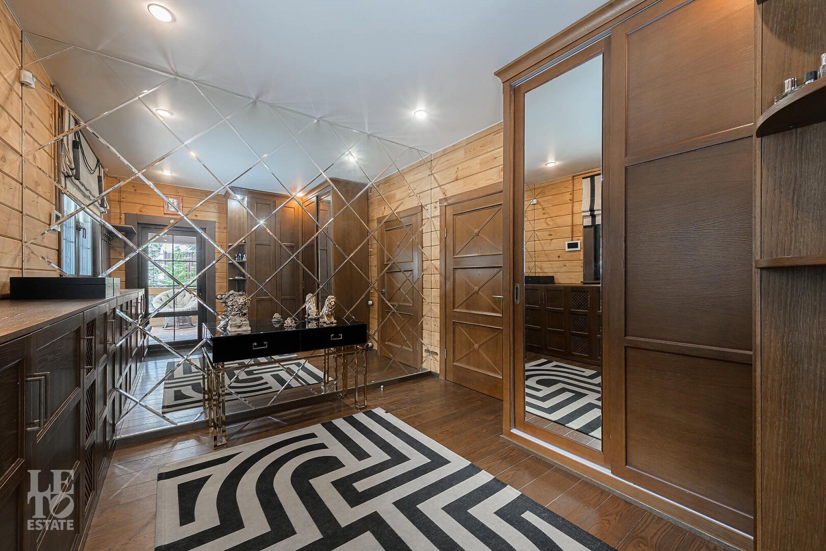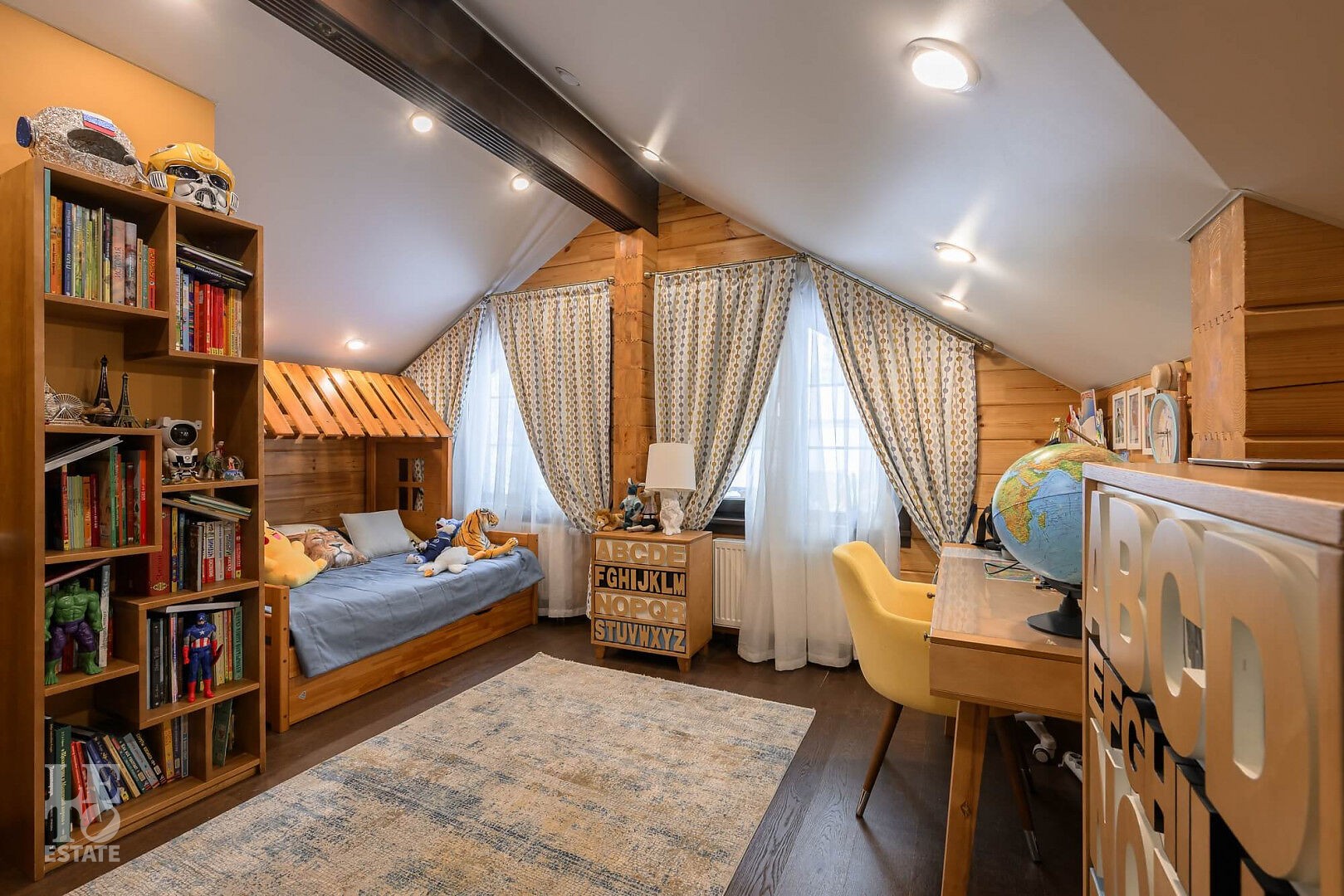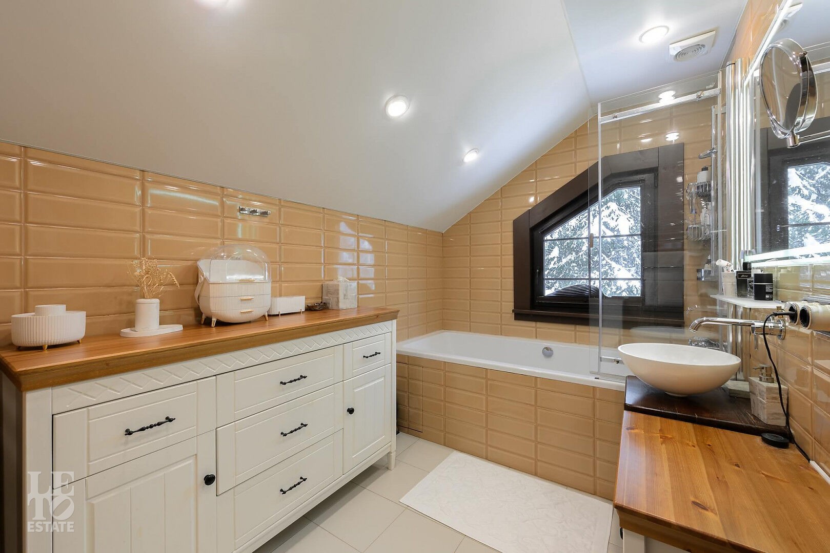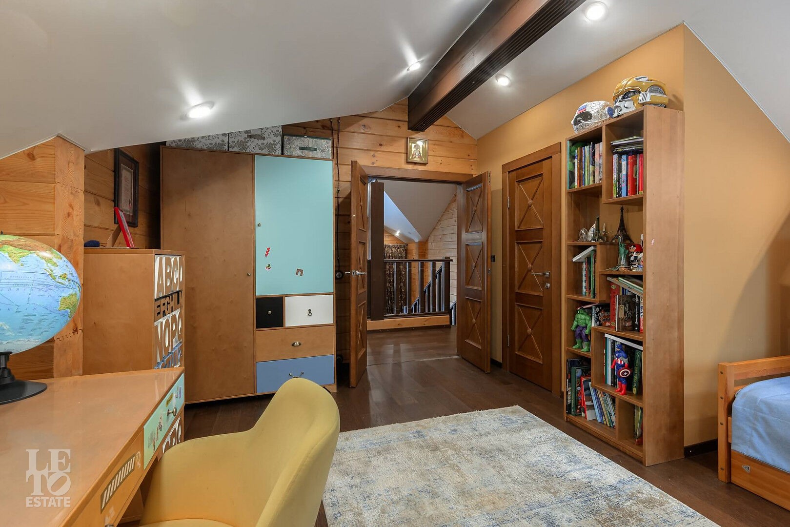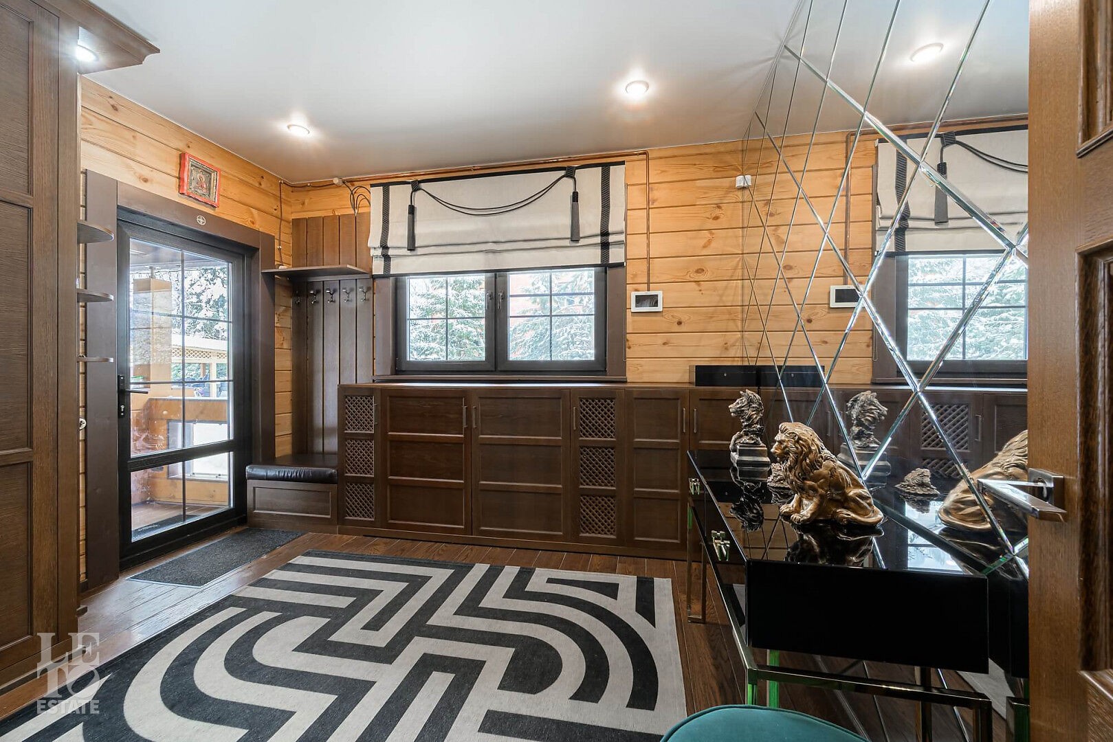 Особенности: просторная двусветная гостиная, английский текстиль (шторы и ковры – Morris), “молодильный” чан на дровах рядом с баней, большой лесной участок, батут.