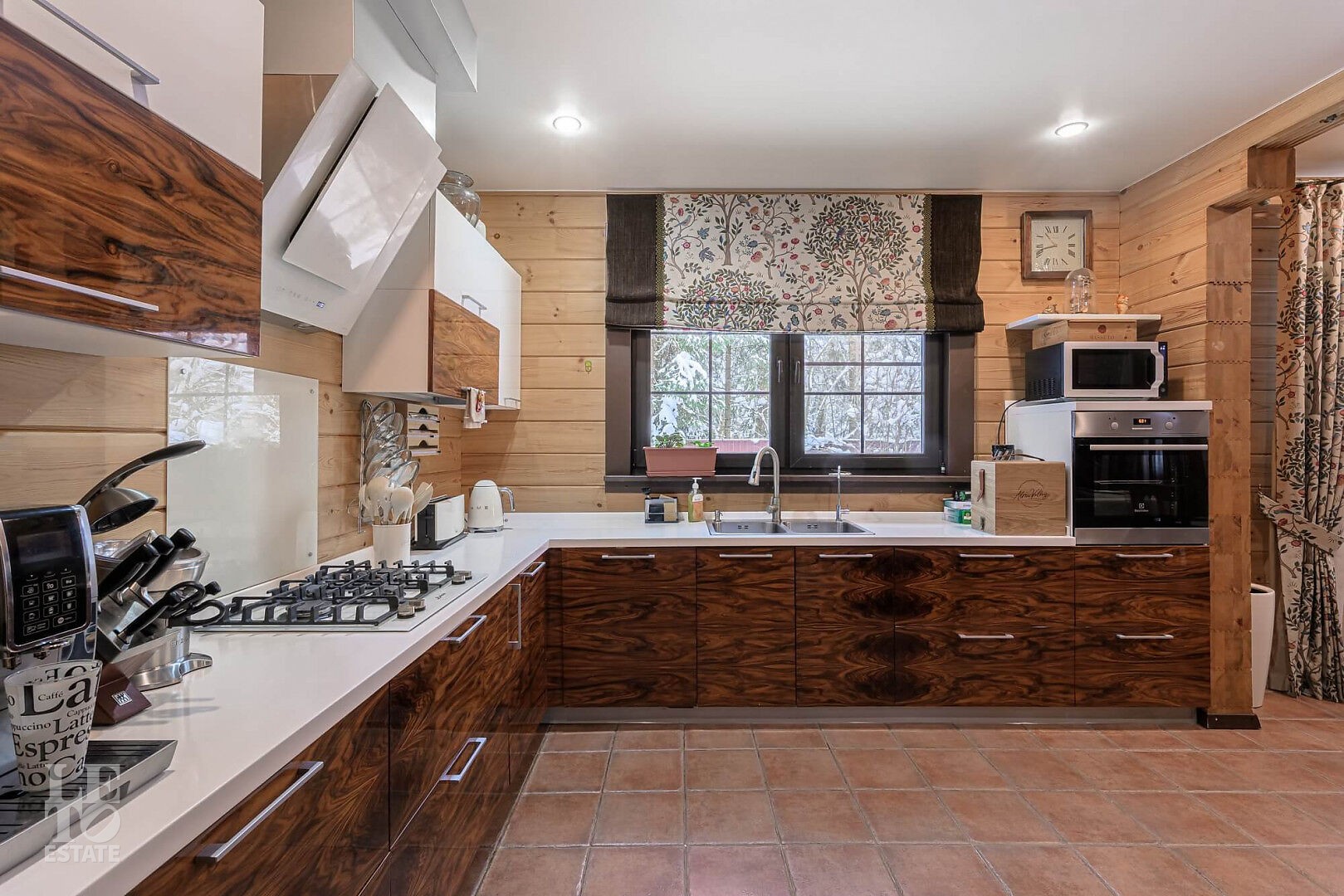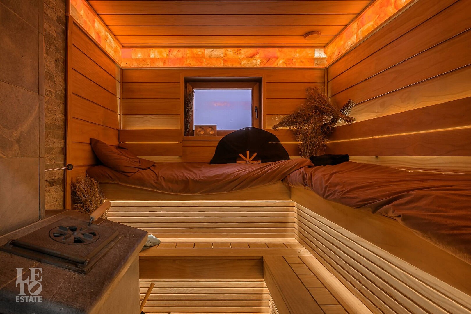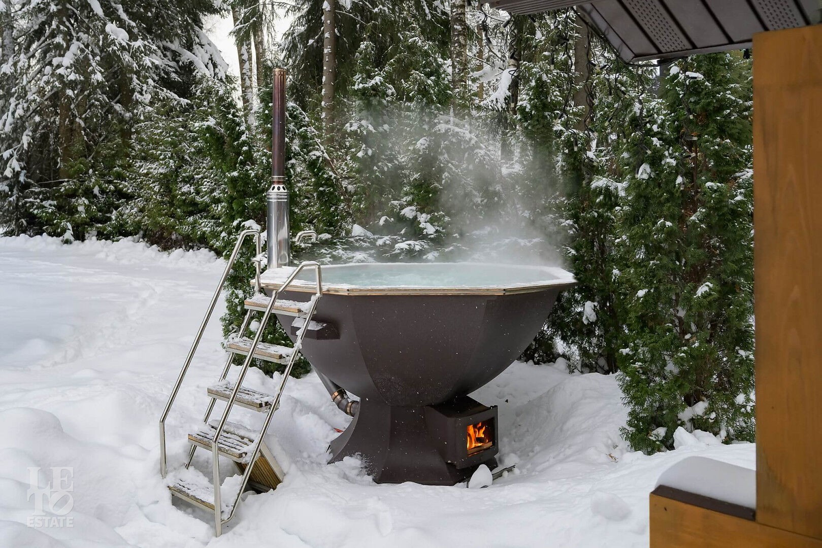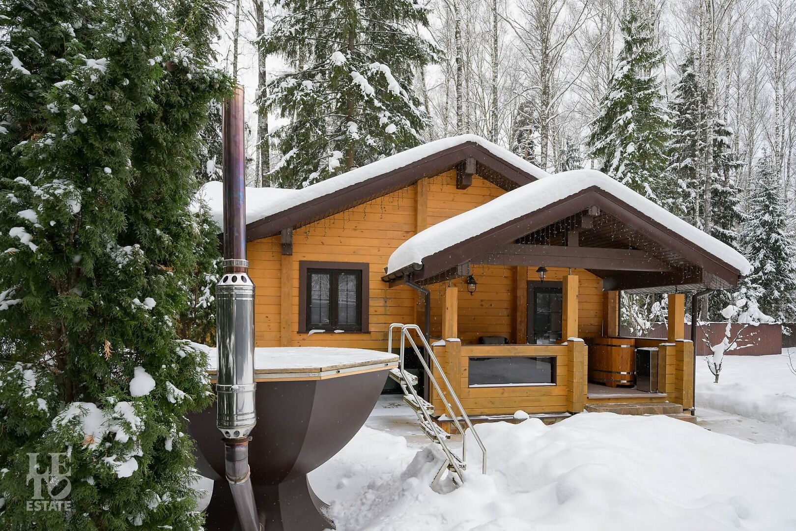 В бане: парная на дровах, помывочная, комната отдыха с полноценной кухней и стирально-сушильными машинами Asko, душевая с ведром для обливания.