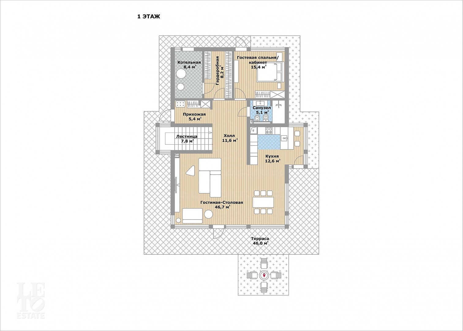 Первый этаж: прихожая, кабинет, гардеробная, санузел, кухня, гостиная-столовая, терраса, котельная-постирочная;